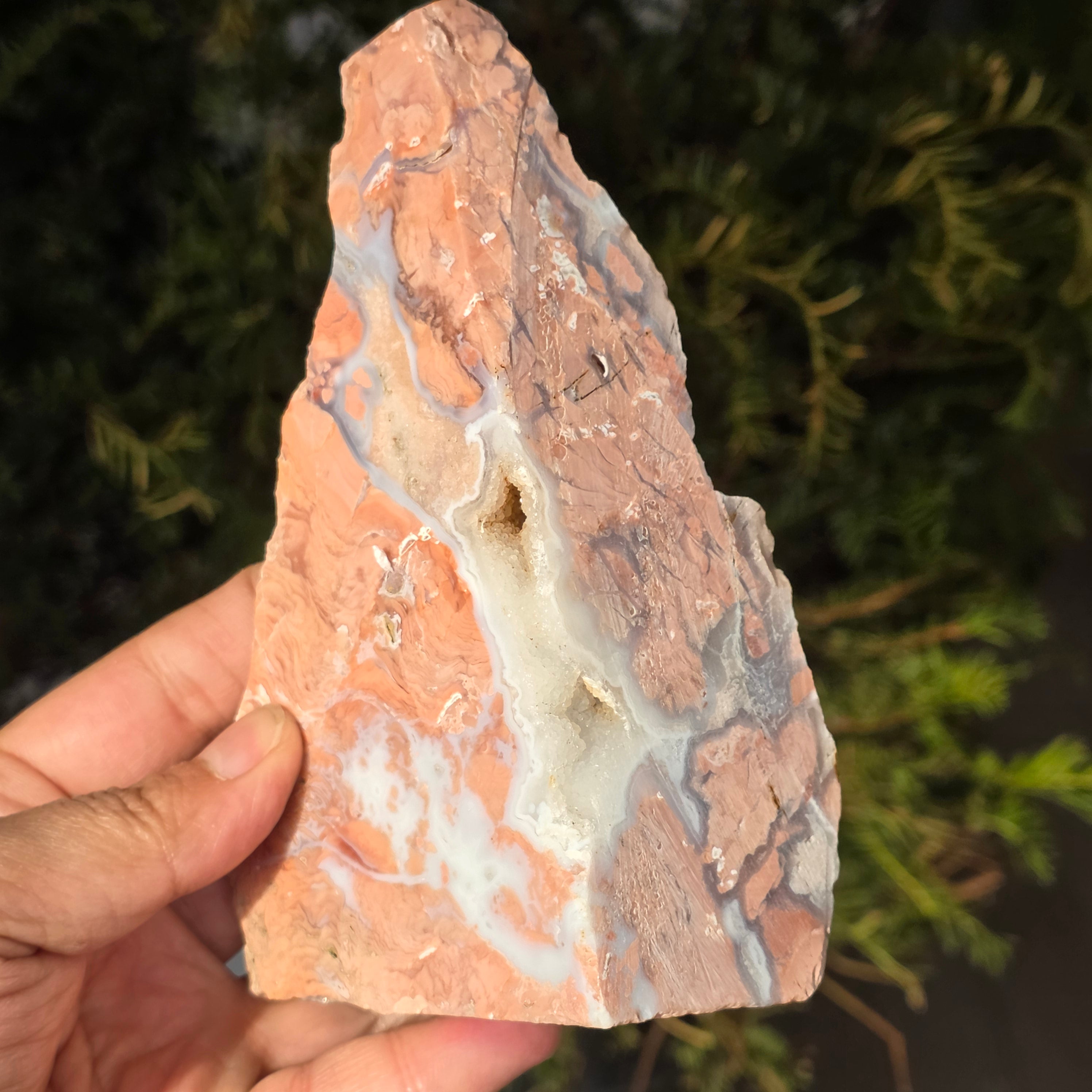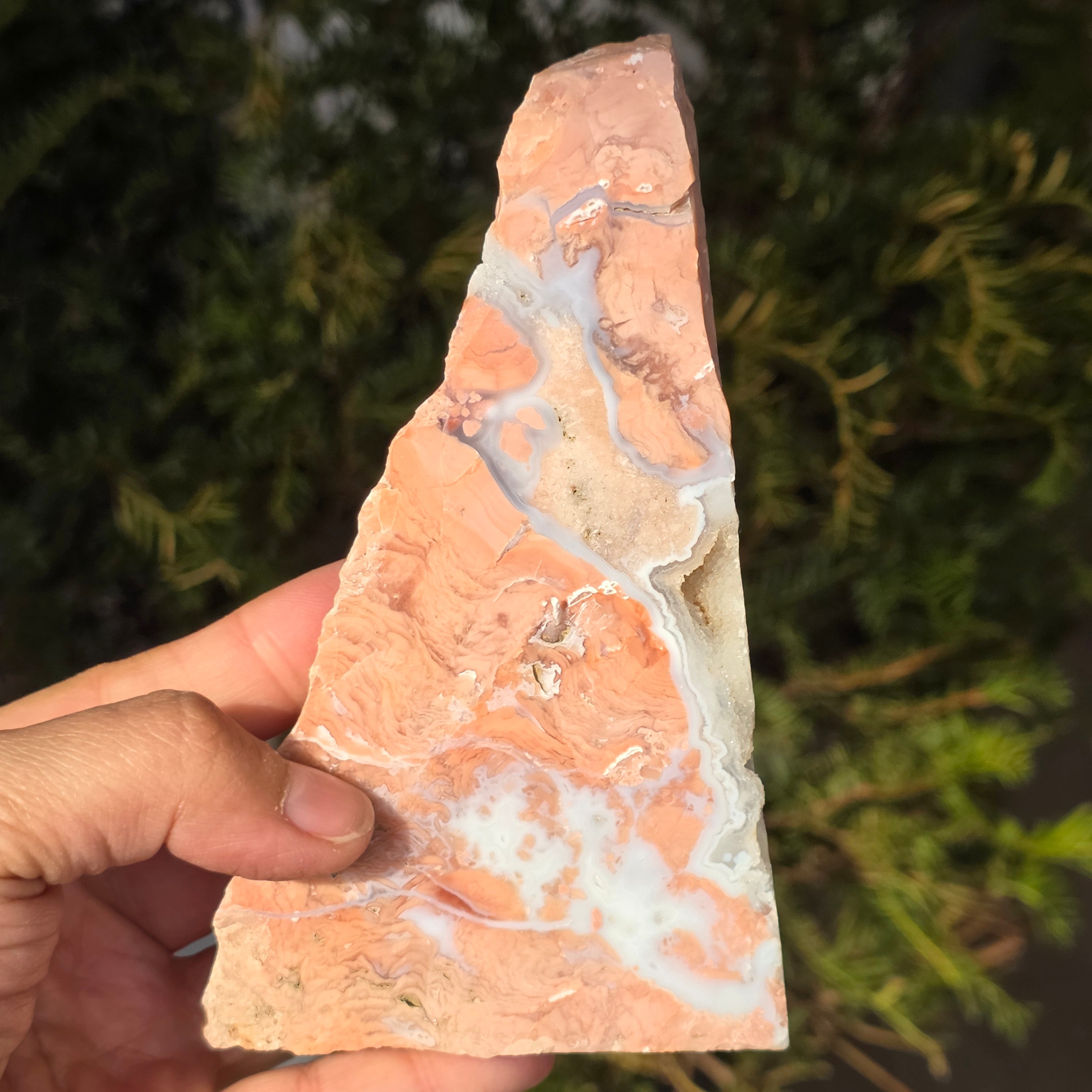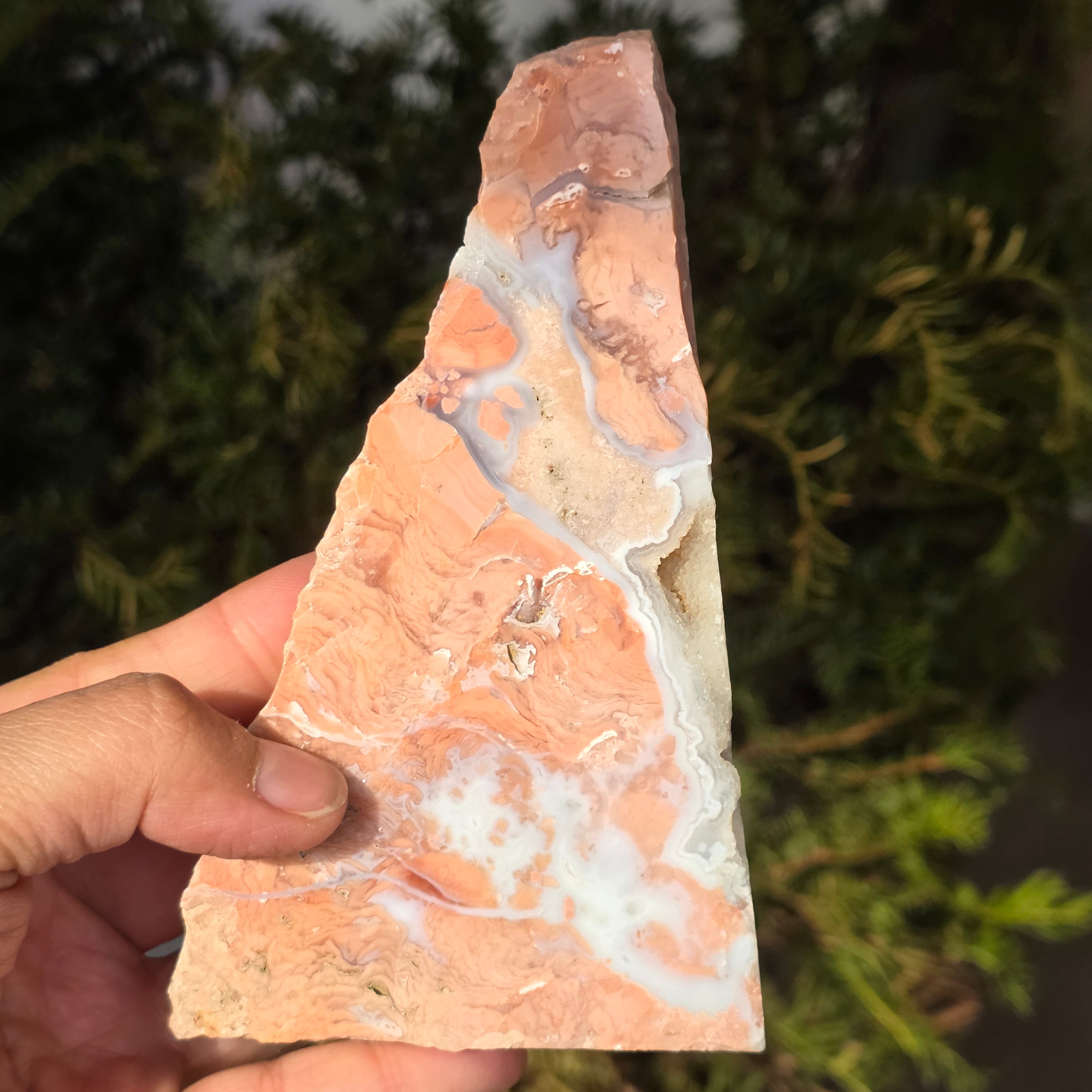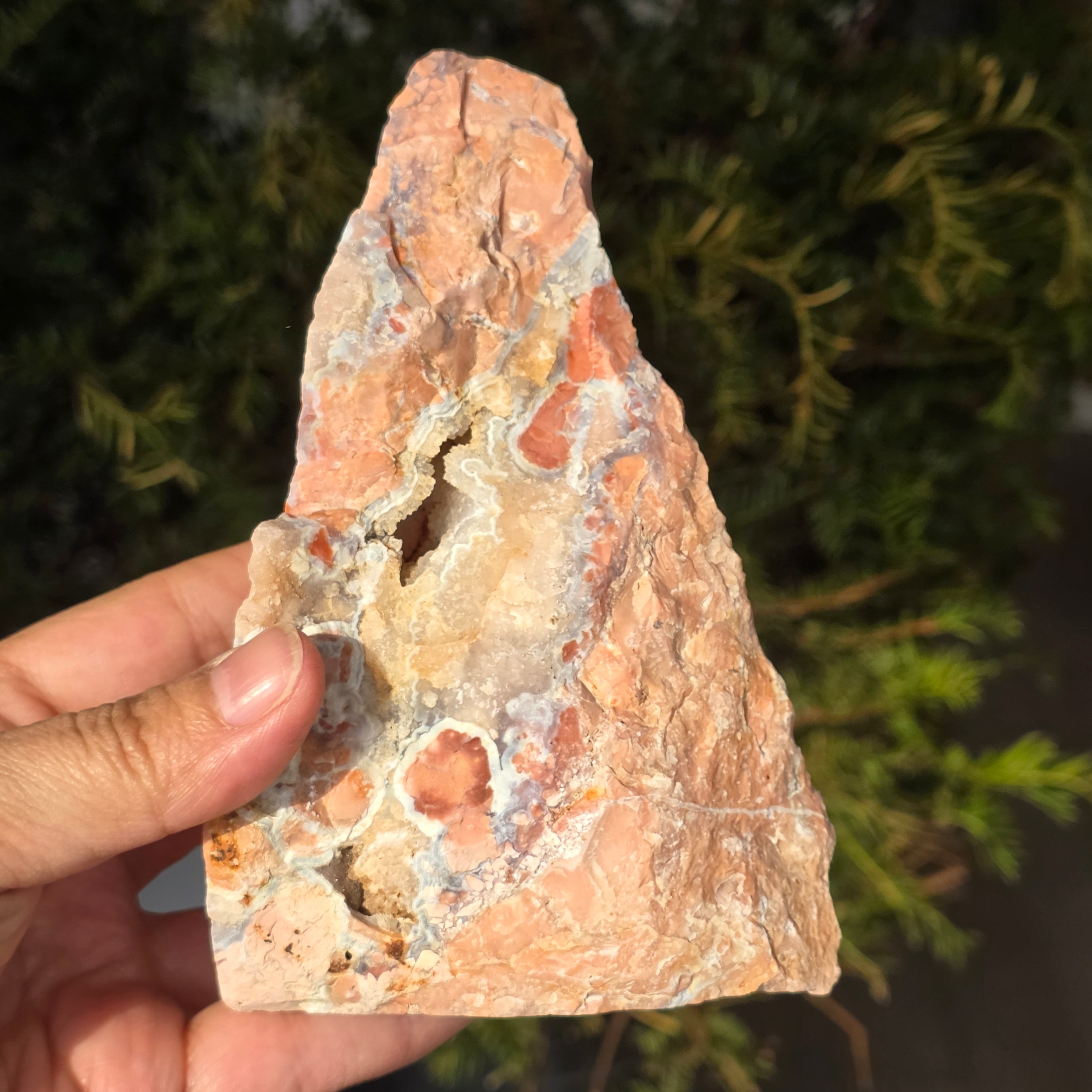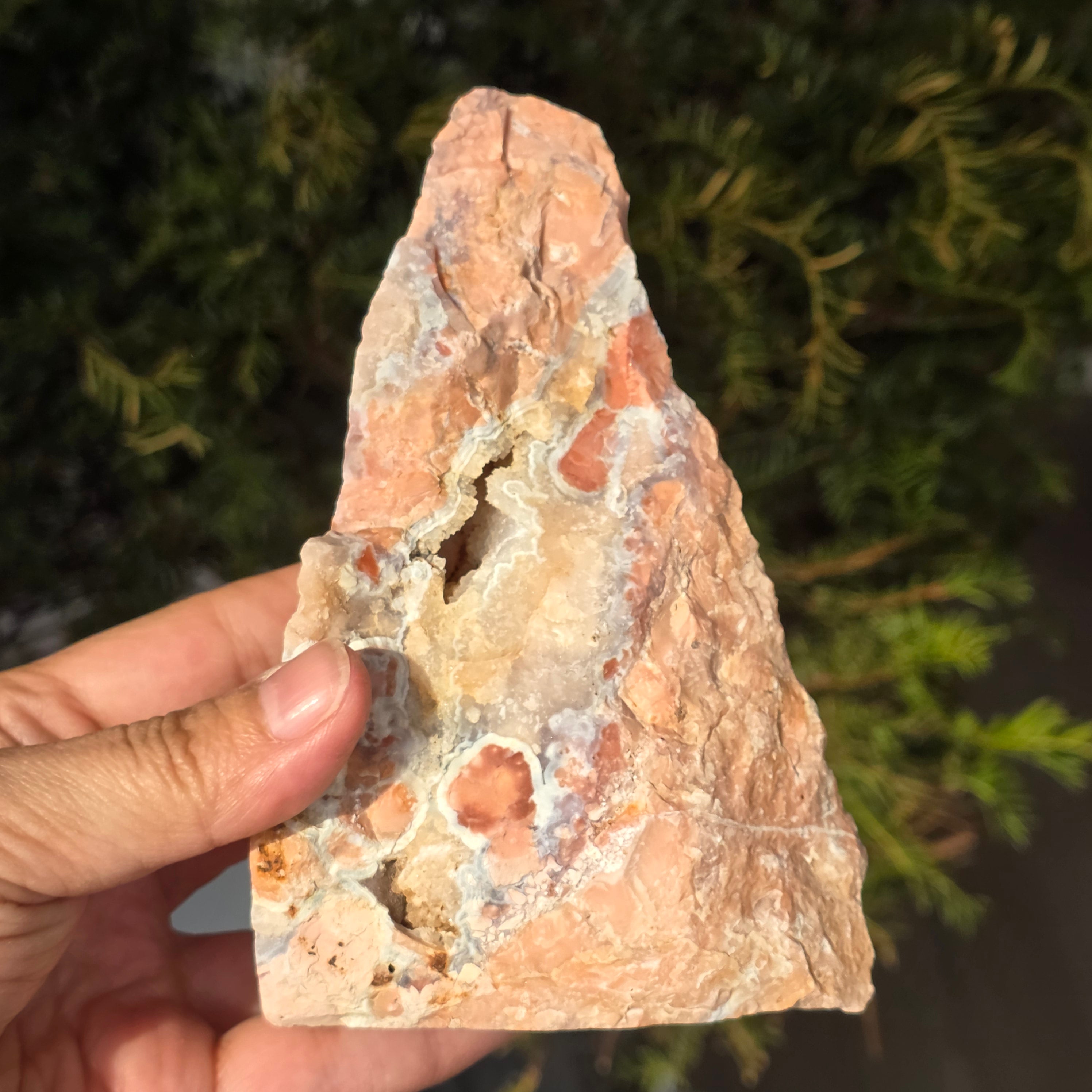 El ágata melocotón es una variedad de calcedoniaperteneciente a la familia del cuarzo microcristalino (SiO₂). Se forma en las cavidades de las rocas volcánicas, donde las soluciones ricas en sílice se depositan sucesivamente en capas finas, generando la estructura característica del ágata. Su color delicado, en tonos de melocotón, rosa pálido o crema, está determinado por la presencia de ciertas impurezas minerales, especialmente óxidos de hierro dispersos en la masa del cuarzo. La estructura interna puede presentar bandas sutiles o zonas translúcidas, específicas de las ágatas.