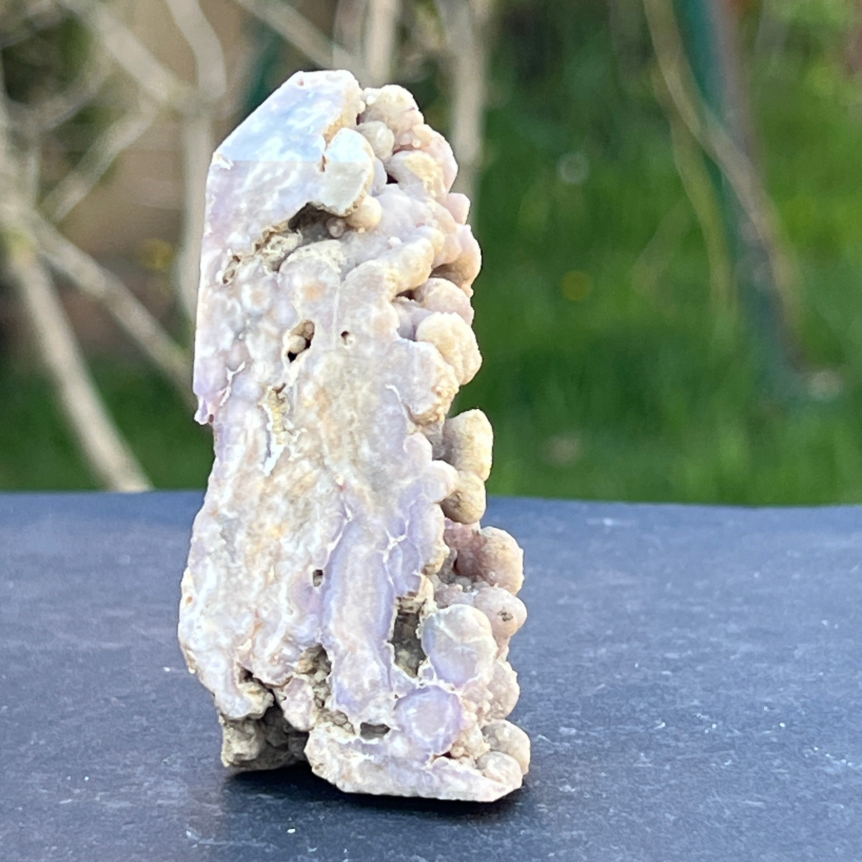 El ágata de uva se forma en las cavidades de las rocas volcánicas, donde las soluciones ricas en silicio se enfrían y cristalizan, creando el patrón distintivo de la uva.