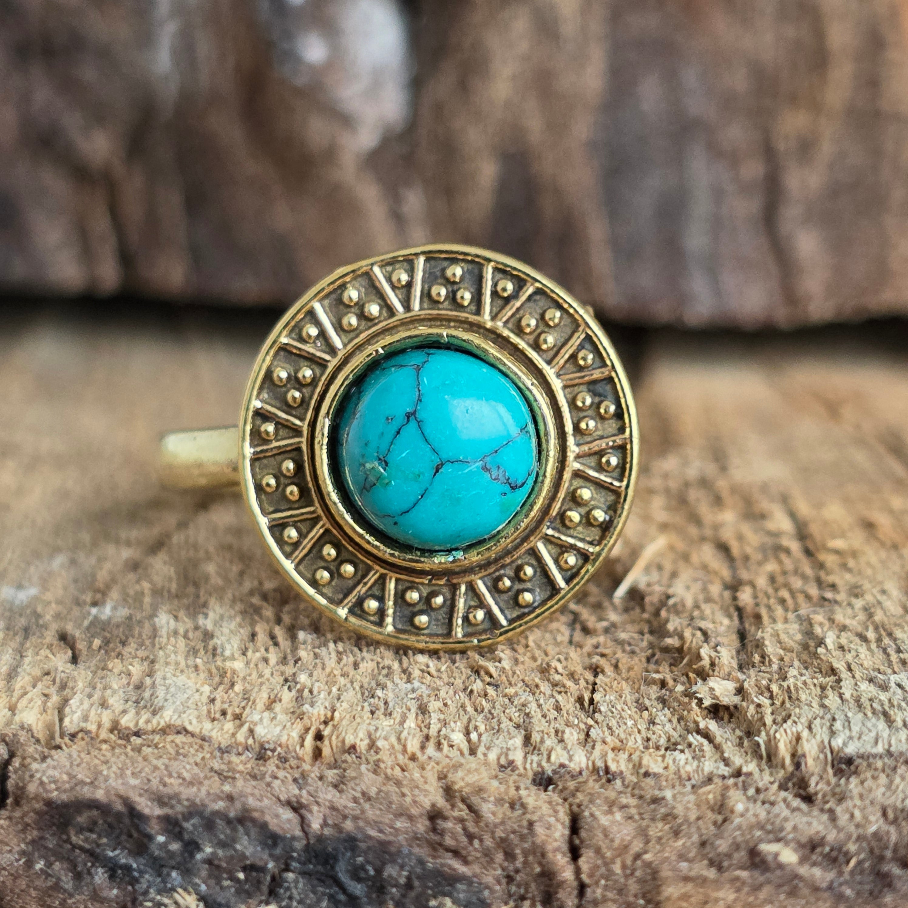 Un anillo con personalidad, inspirado en la artesanía tradicional india Rawa work, hecho de aleación metálica con acabado en bronce brillante y embellecido con una piedra natural de turquesa.