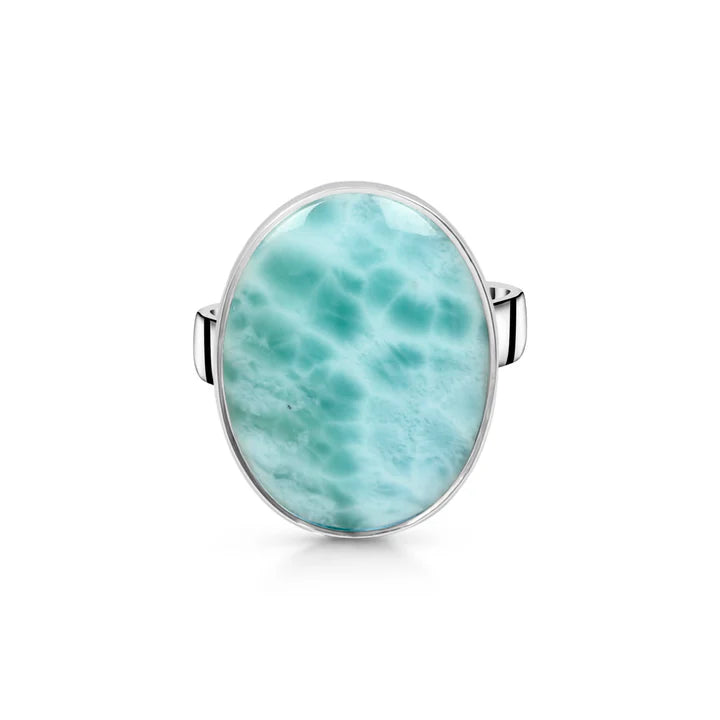 Un anillo único de larimar natural, conocido como la piedra del cielo y del océano. Sus tonos de azul acuático, con reflejos blancos como las olas del mar, proporcionan tranquilidad interior y una sensación de libertad infinita.