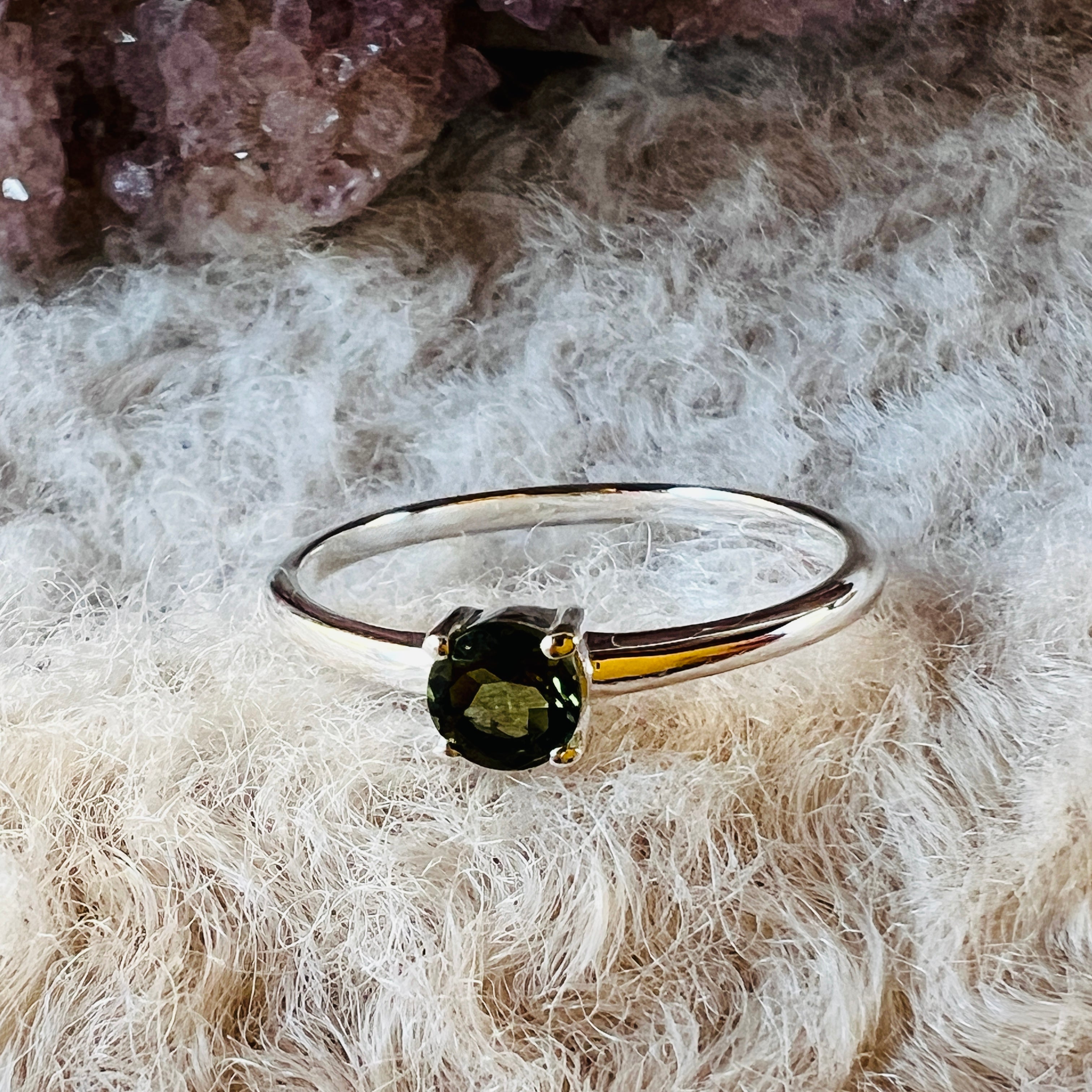 Anillo de moldavita de plata Redondo 4 mm, por favor seleccione la talla deseada.