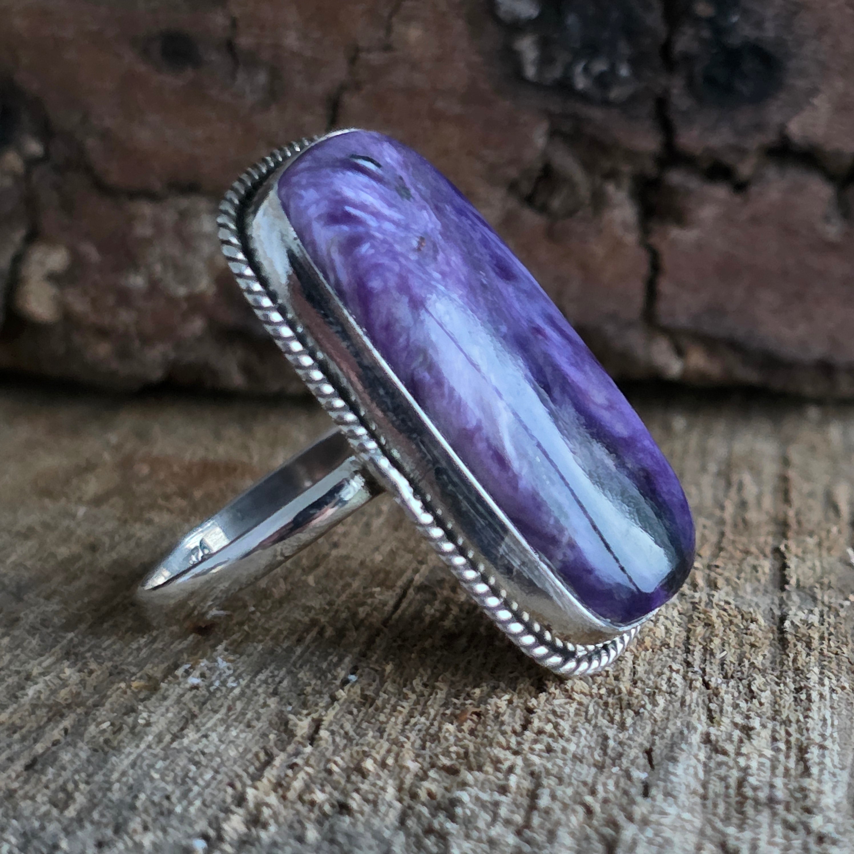 Un anillo macizo, hecho a mano de plata 925, que alberga una piedra natural de Charoita, con tonos vibrantes de violeta y reflejos sedosos que recuerdan a una pintura cósmica. El marco decorativo al estilo trabajo de alambre retorcido añade profundidad y refinamiento, equilibrando la elegancia moderna con la maestría tradicional.