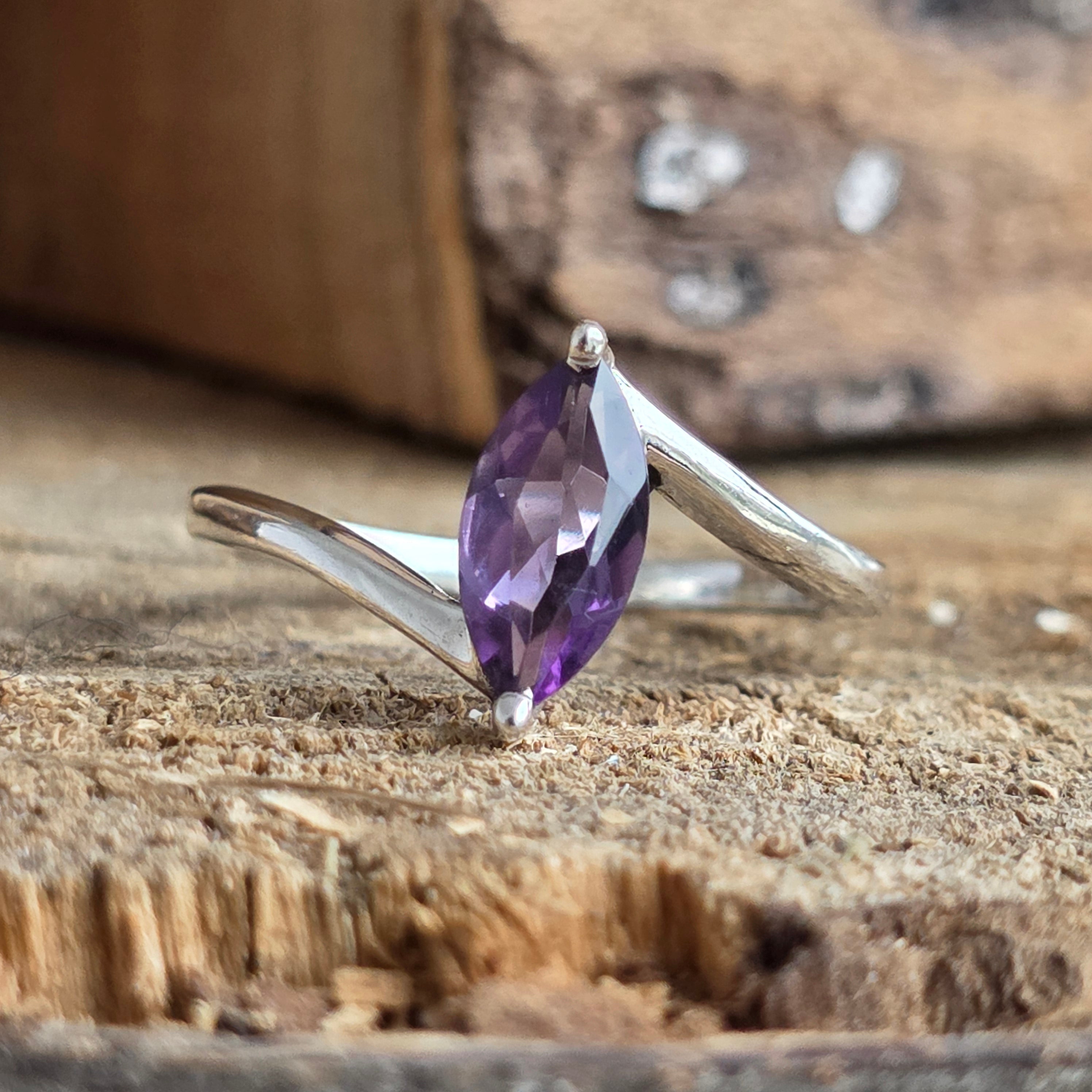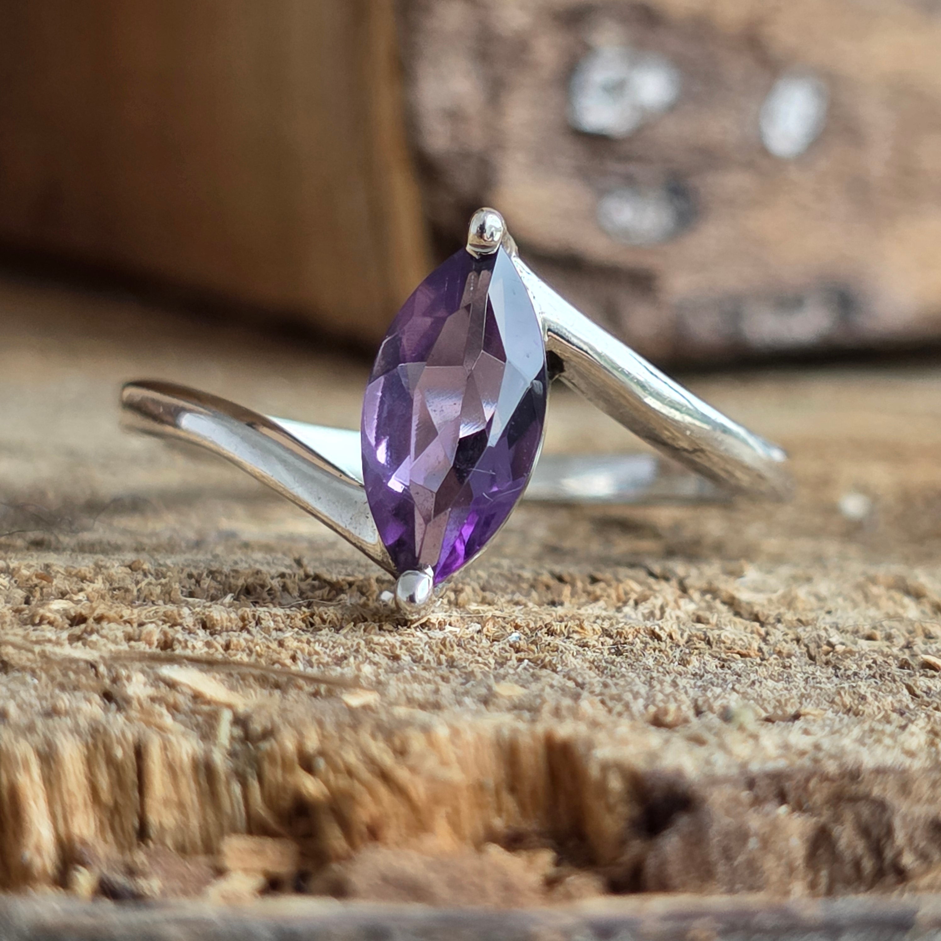 Símbolo de claridad y sabiduría interior, la amatista brilla en esta montura refinada de tal 925, esculpida para resaltar la pureza de la forma.