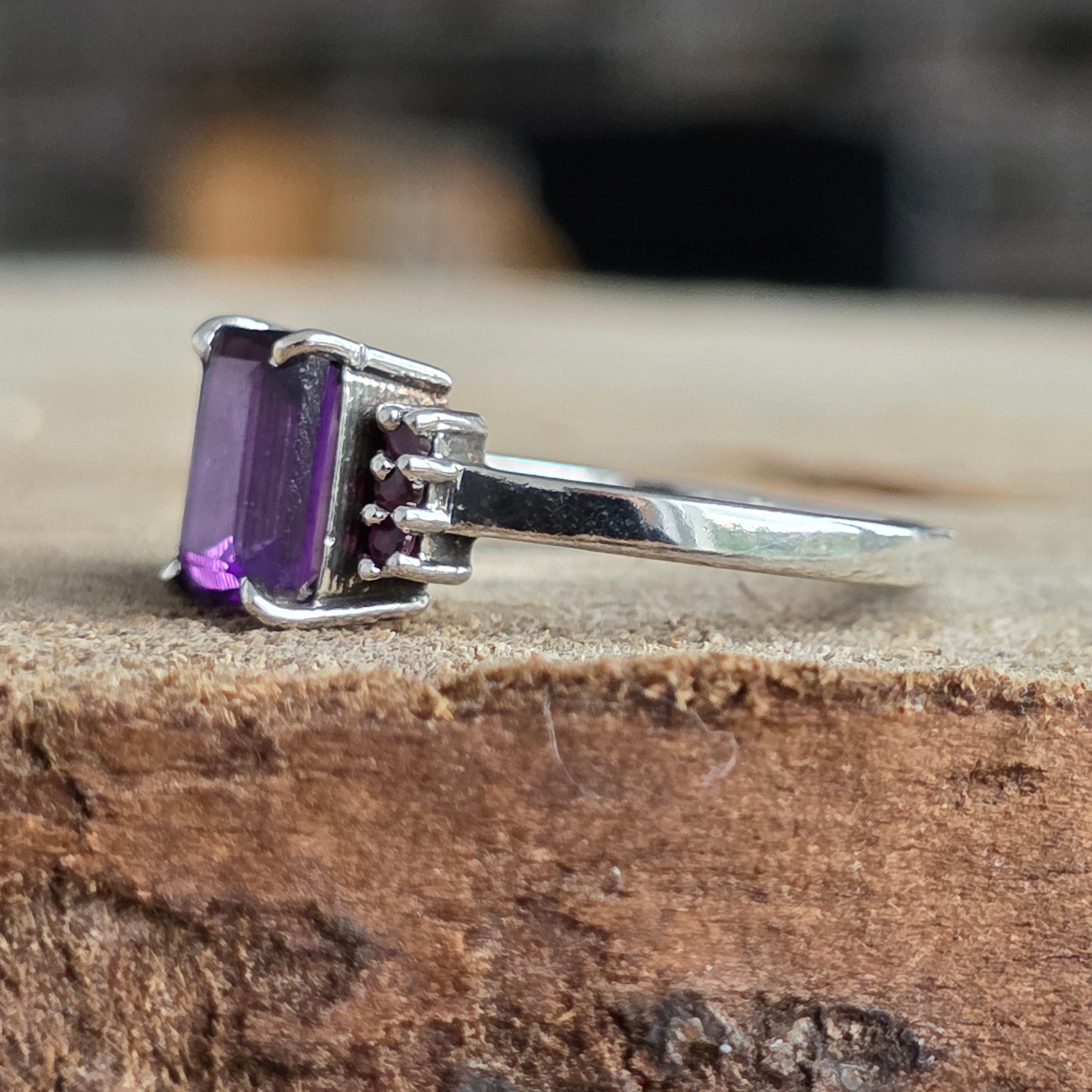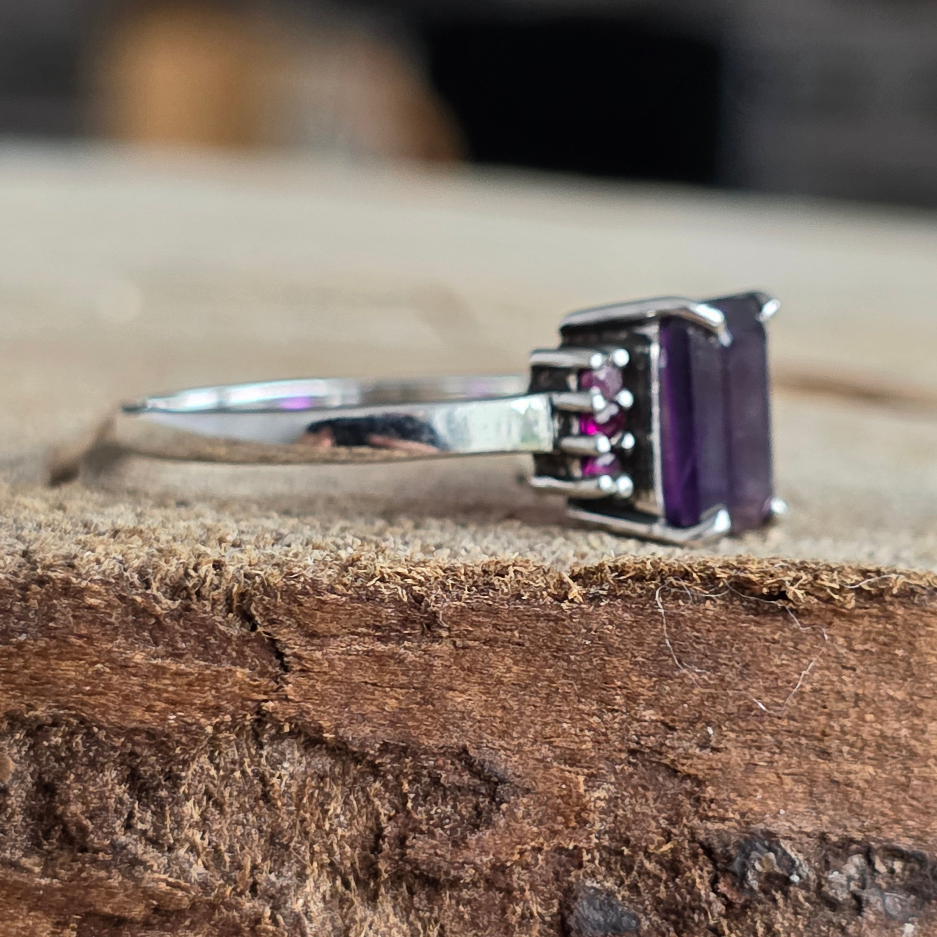 El corte rectangular del amatista refleja la luz con precisión geométrica, mientras que los rubíes redondos en los laterales añaden un toque real y profundo.