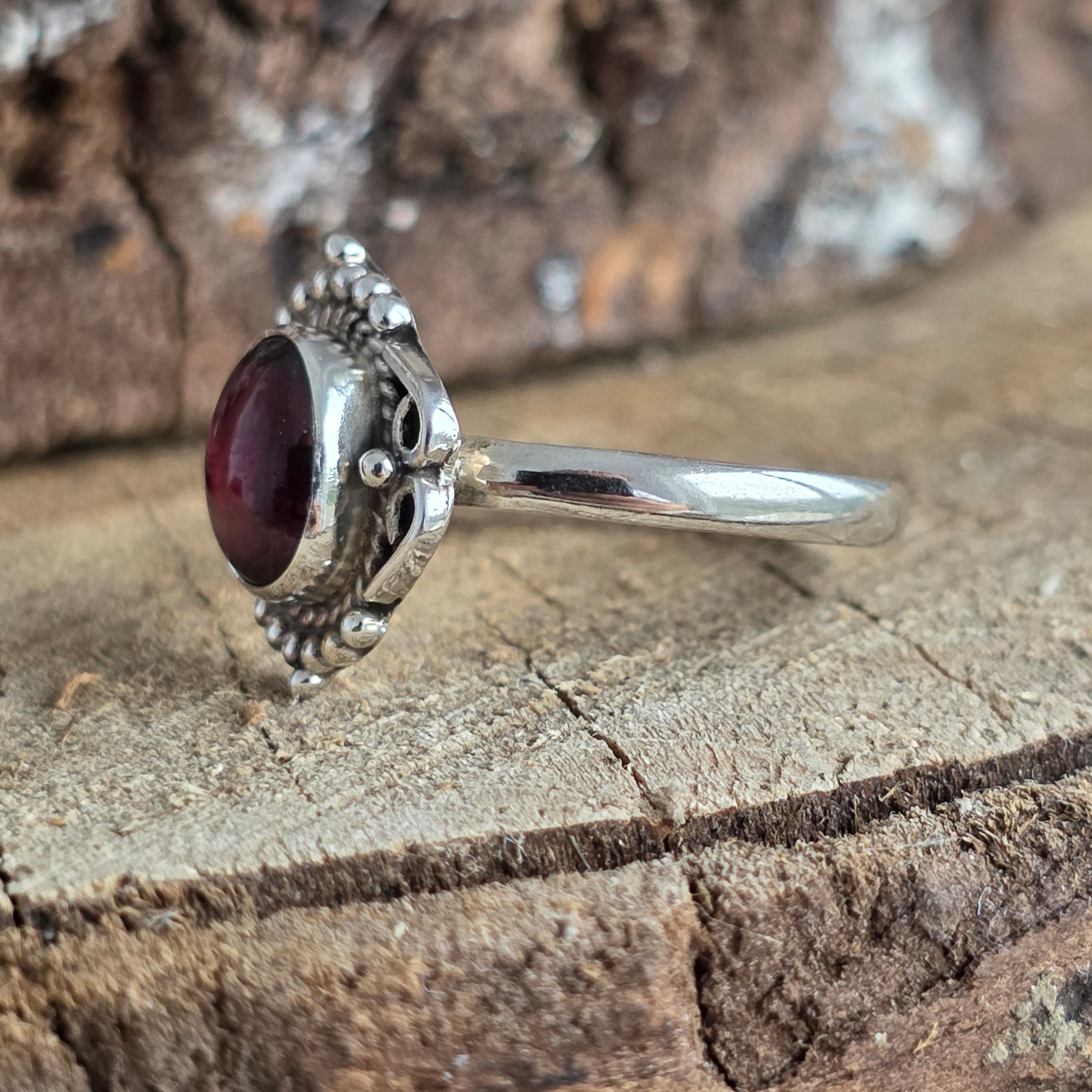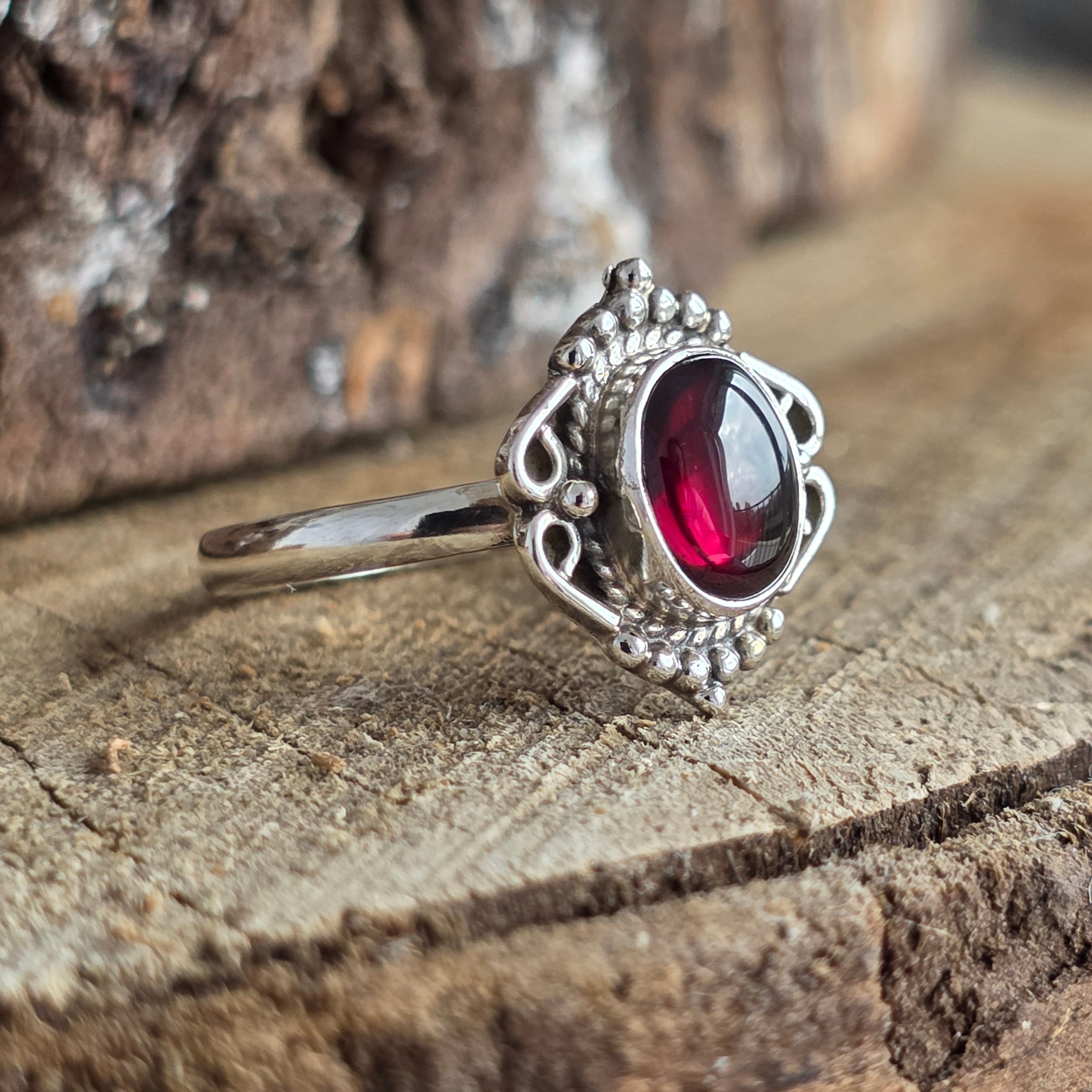Un anillo elegante y con carácter, elaborado en plata 925 y adornado con una piedra natural de granate, con profundos matices rojo rubí que cobran vida con la luz.