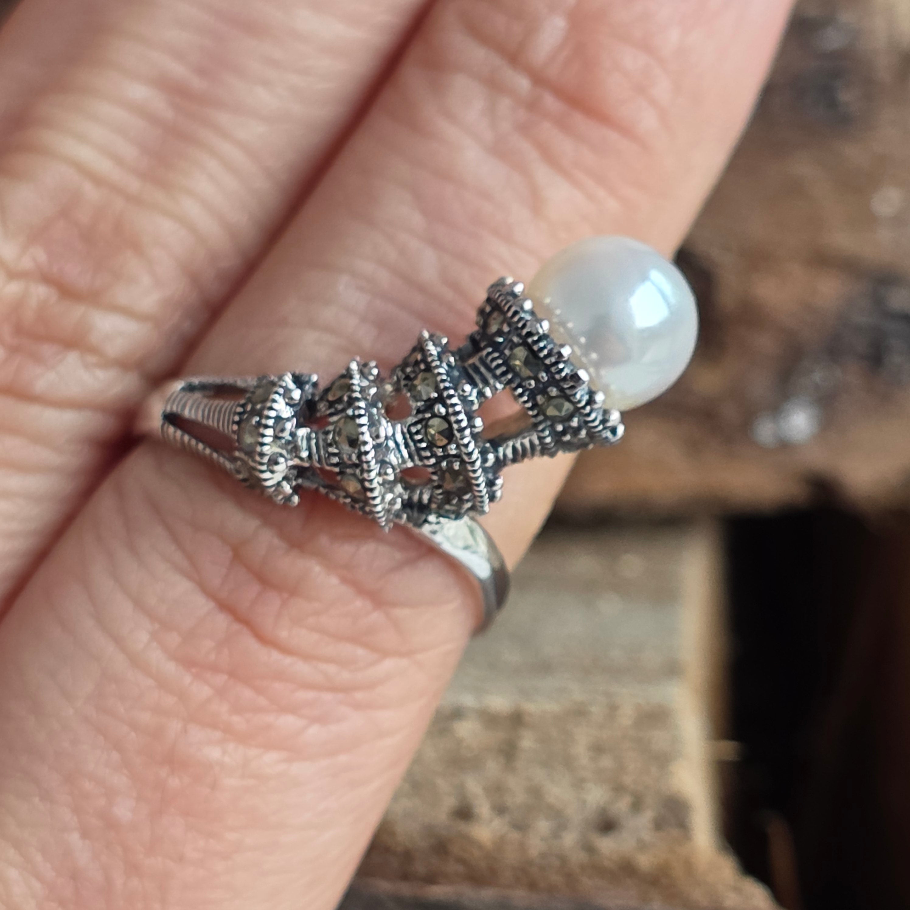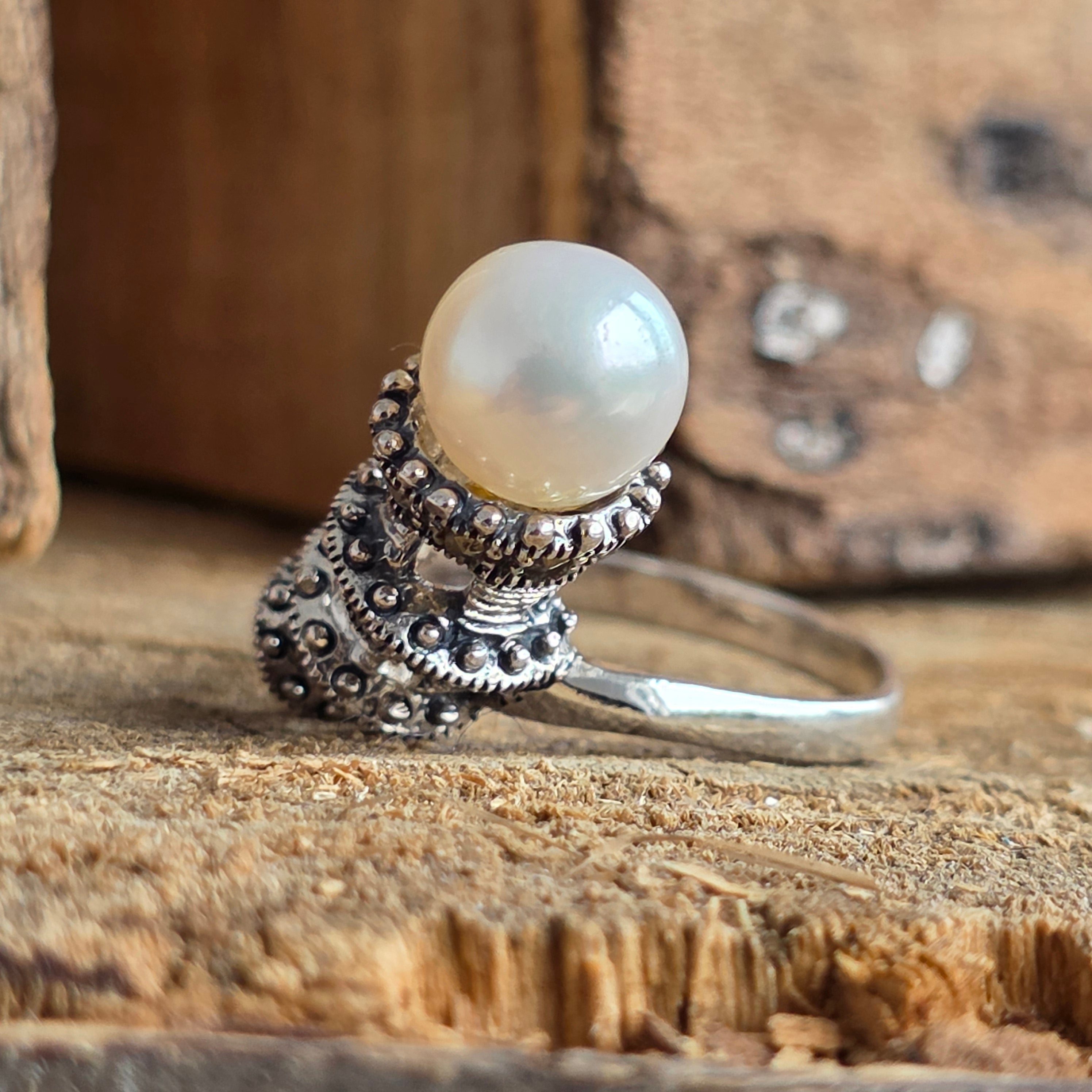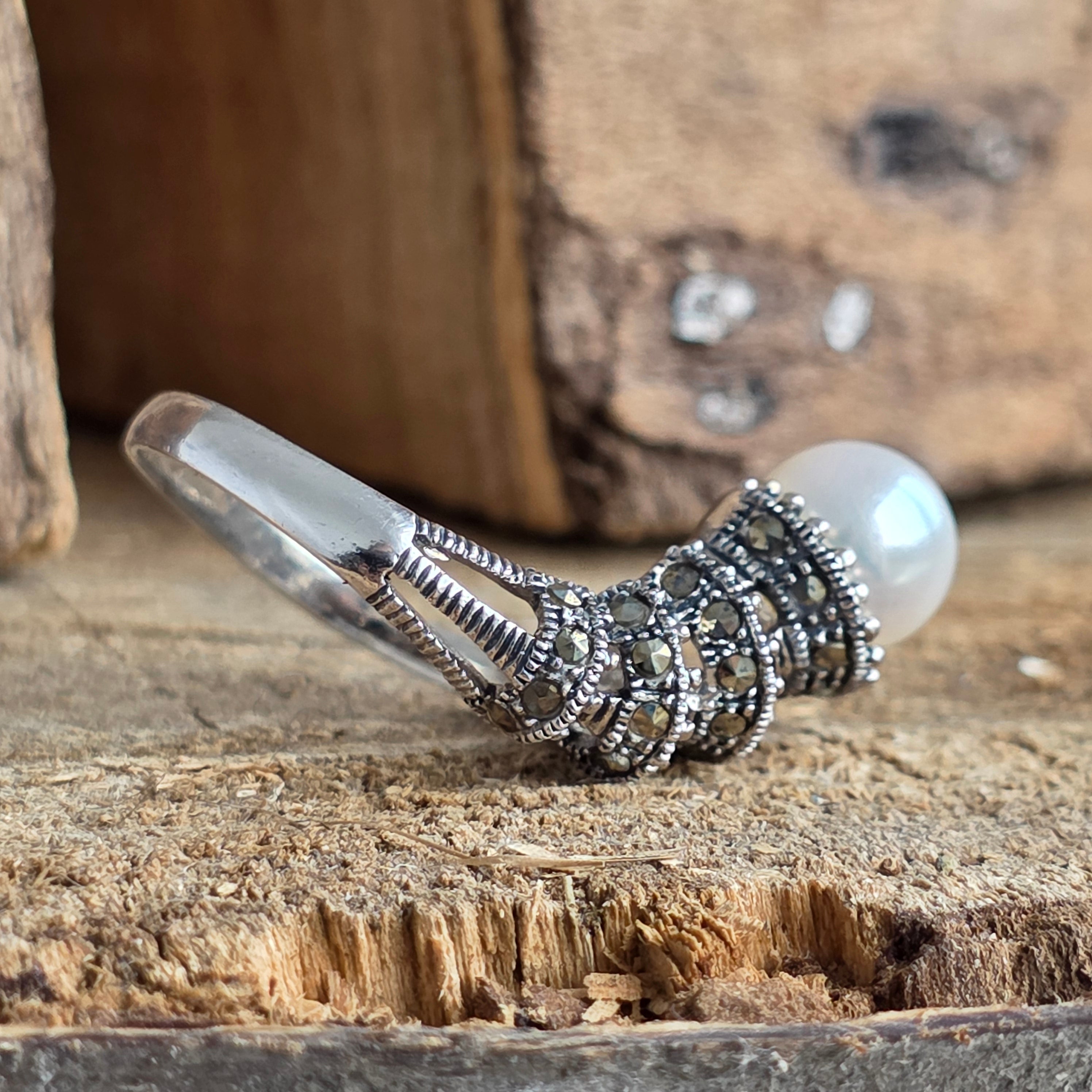 Un símbolo de la elegancia atemporal, este anillo de plata 925 combina la luz aterciopelada de la perla natural con los reflejos metálicos de la marcasita, en un diseño que evoca el encanto de la joyería clásica.