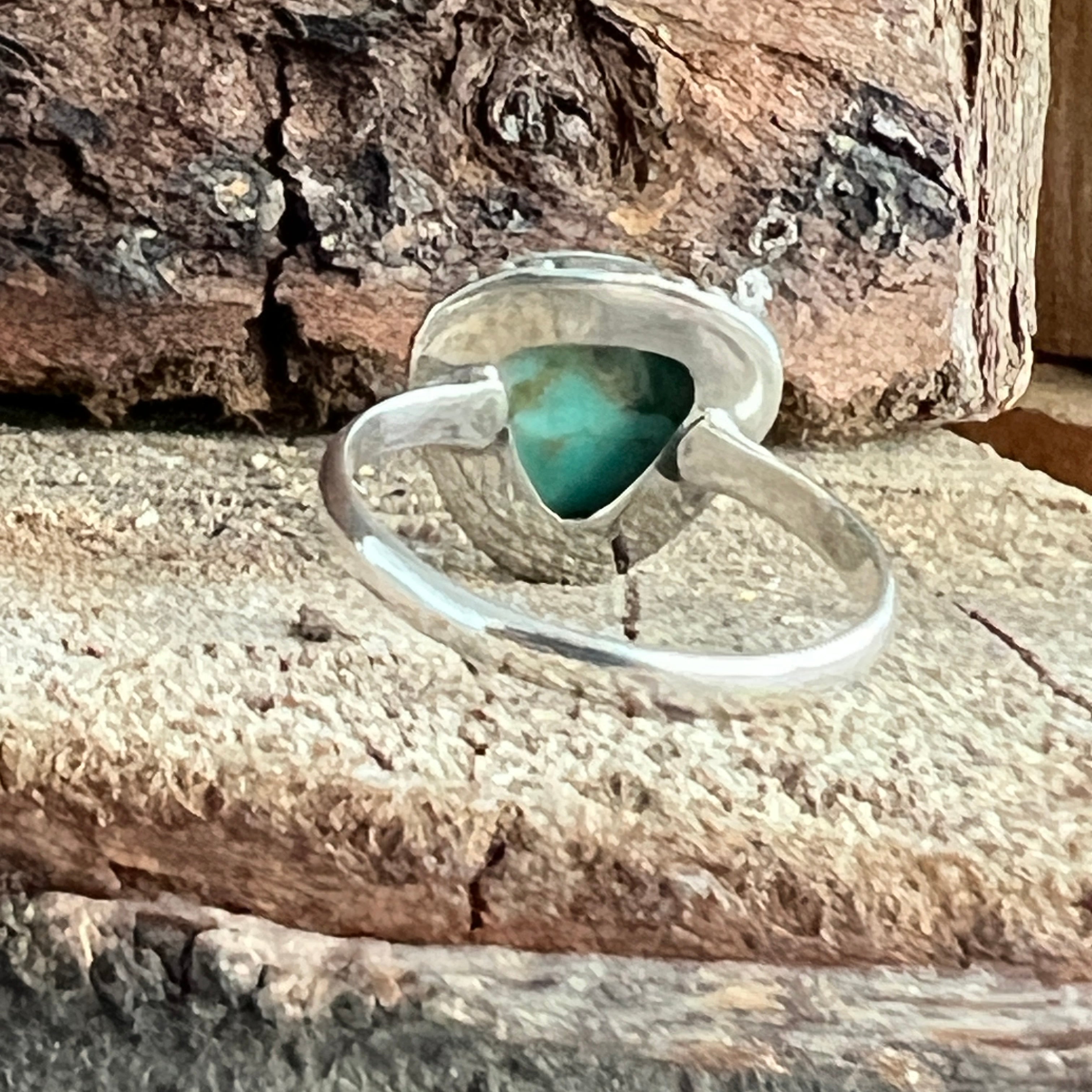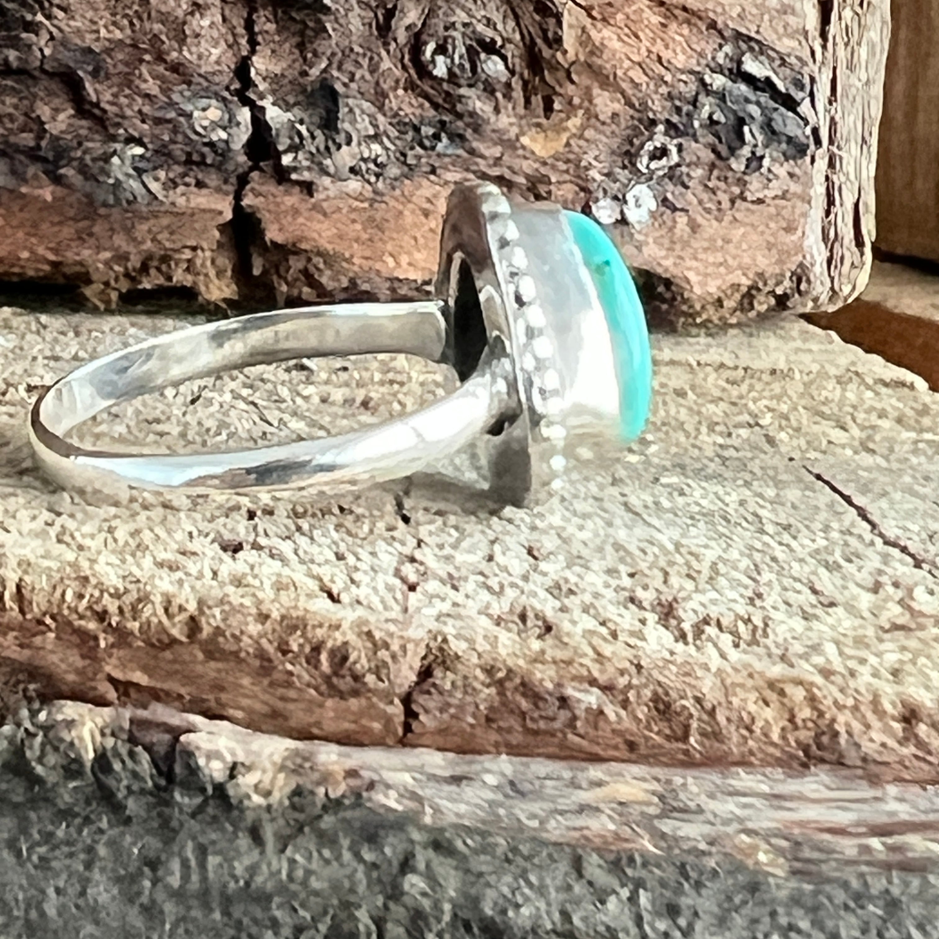 Un anillo elegante de plata 925,con una piedra natural de turquesa con tonalidades que varían entre azul cielo y verde acuático, atravesada por finas vetas marrones y grises. El diseño minimalista tipo plain collet deja toda la atención en la piedra, resaltando su belleza orgánica y textura auténtica.