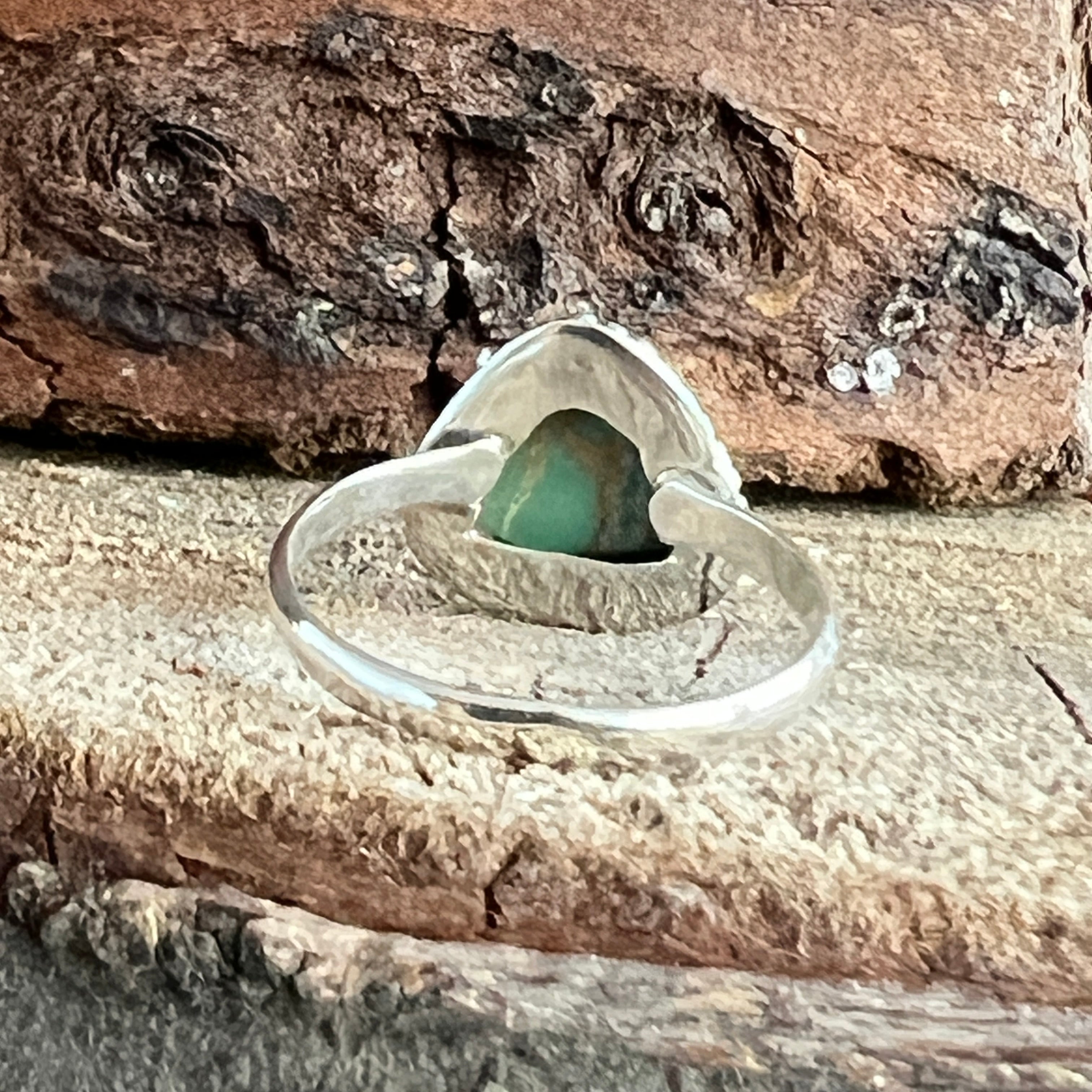 Un elegante anillo de plata 925, con una piedra natural de turquesa con tonalidades que varían entre azul cielo y verde acuático, atravesada por finas vetas marrones y grises. El diseño minimalista tipo plain collet deja toda la atención en la piedra, resaltando su belleza orgánica y su textura auténtica.