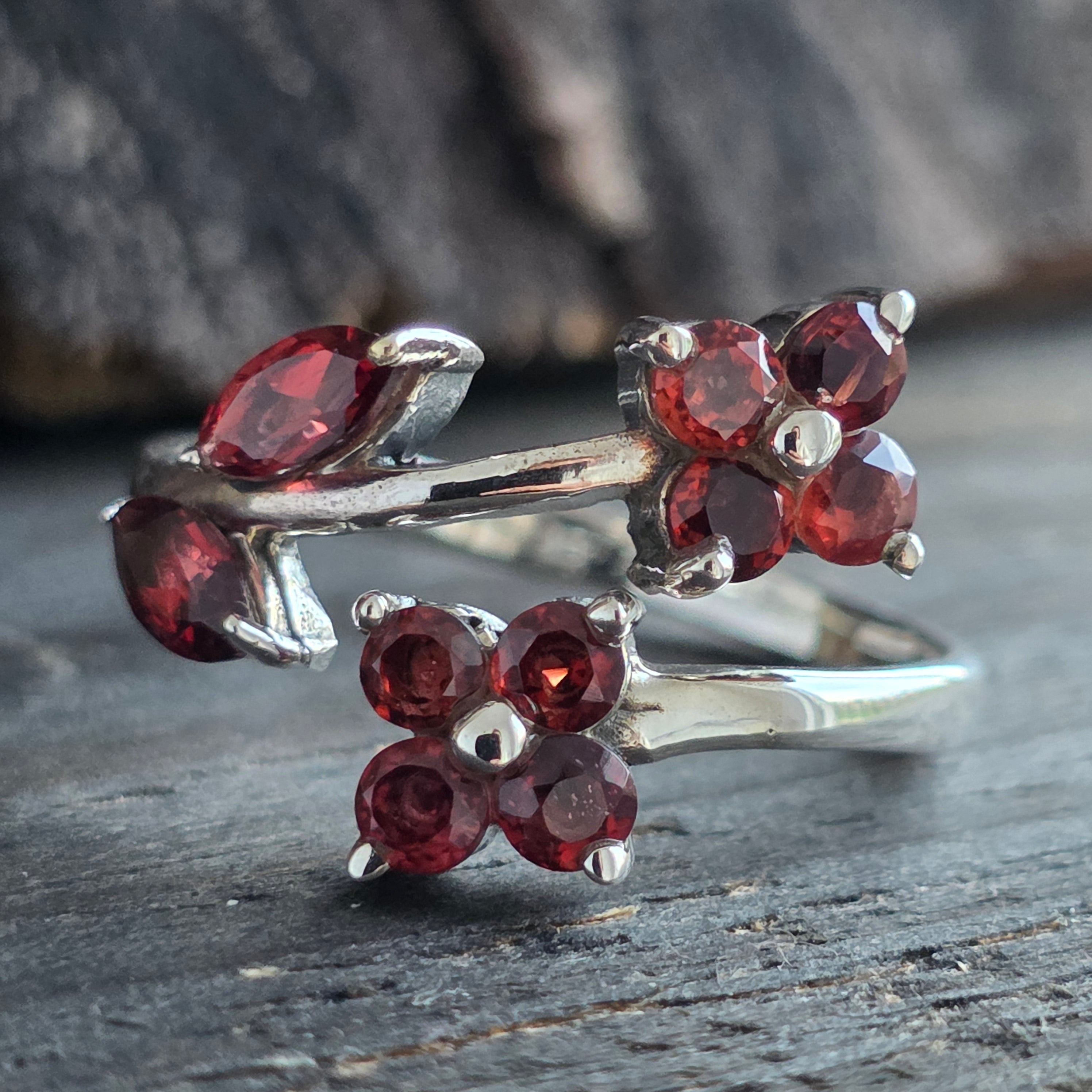 Un anillo elegante y con carácter, elaborado en plata 925 y adornado con una piedra natural de granate, con profundos matices rojo rubí que cobran vida con la luz.