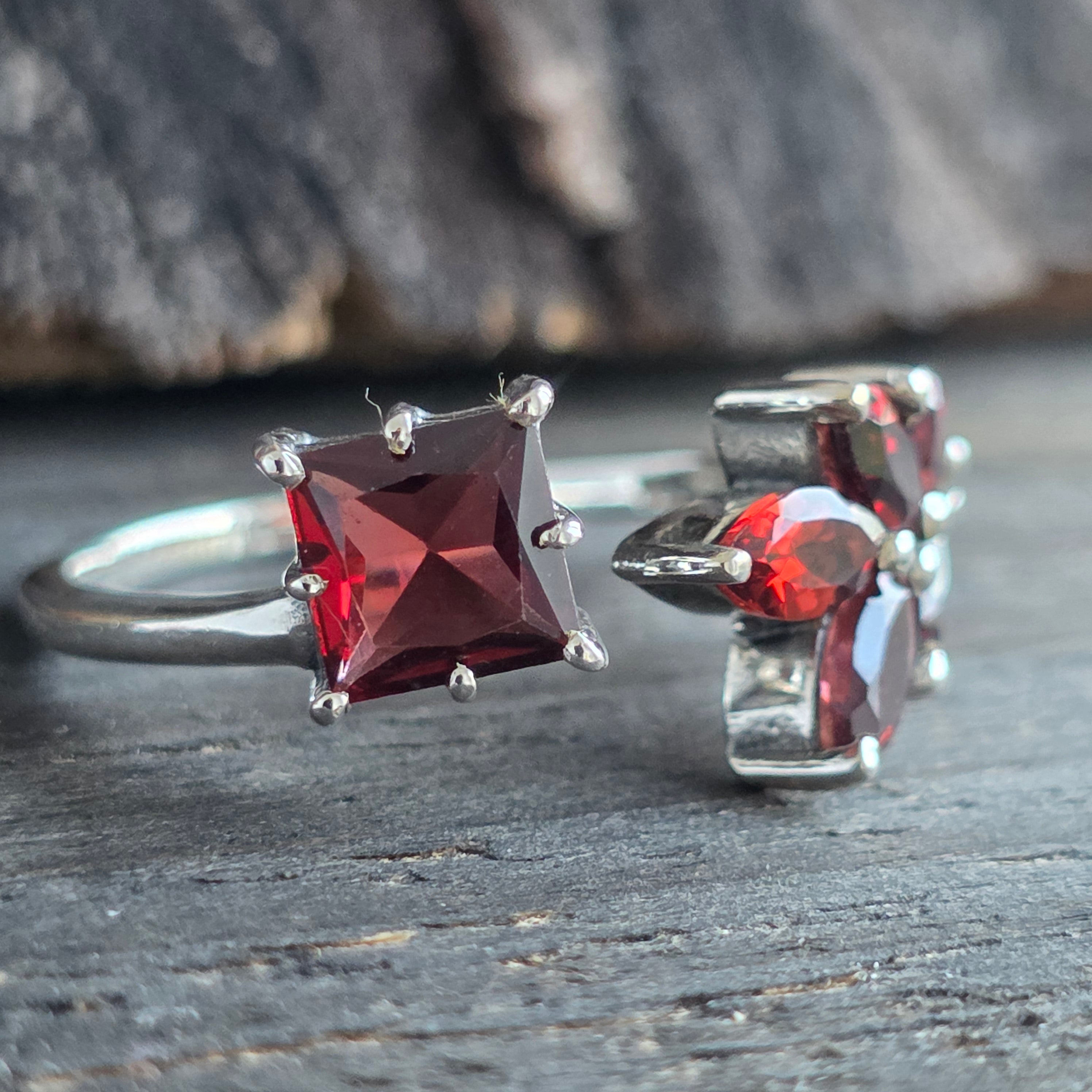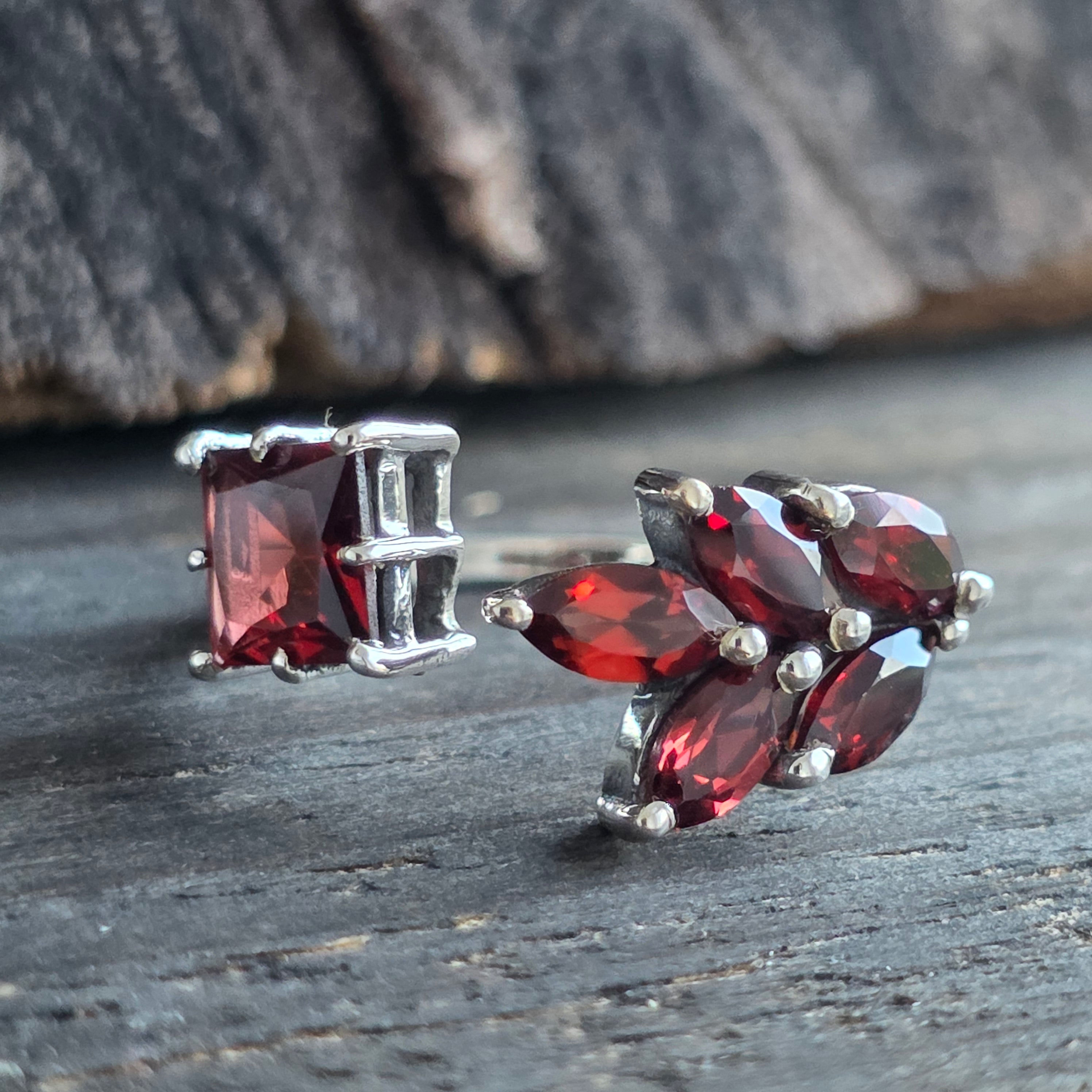 Un anillo elegante y con carácter, elaborado en plata 925 y adornado con una piedra natural de granate, con profundos matices rojo rubí que cobran vida con la luz.