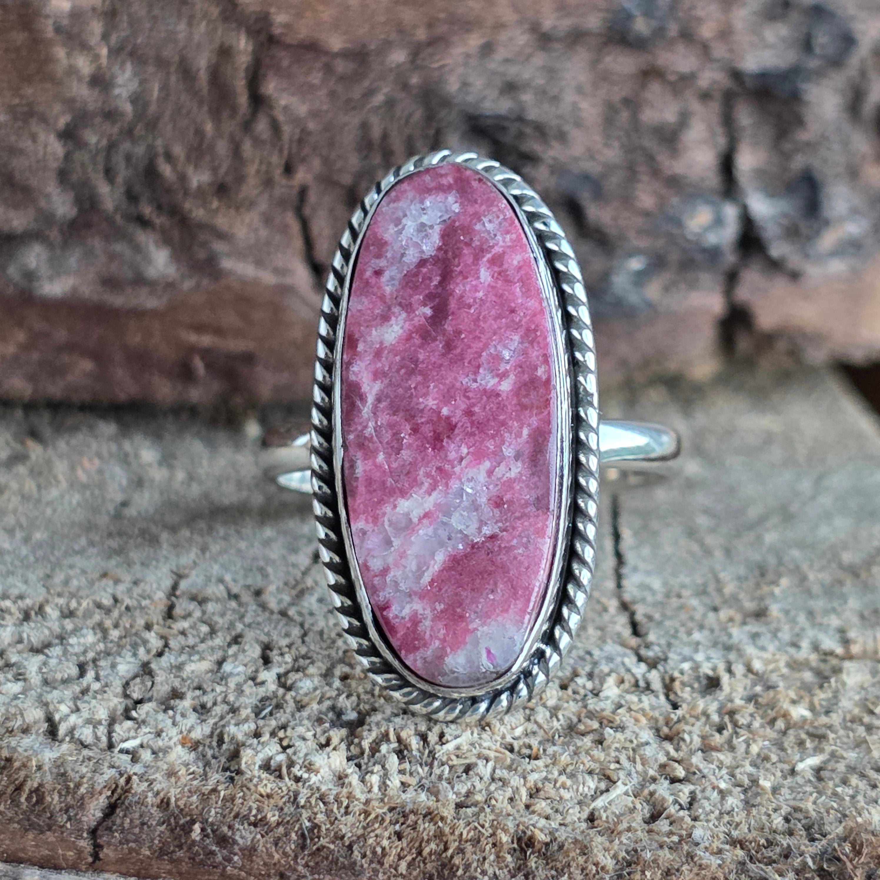 Un anillo de plata 925 que lleva en sí la energía de la tierra nórdica – Tulit, una variedad rosa de zoisita, con textura natural y finas variaciones de color entre rosa salmón, fucsia y blanco calcáreo.