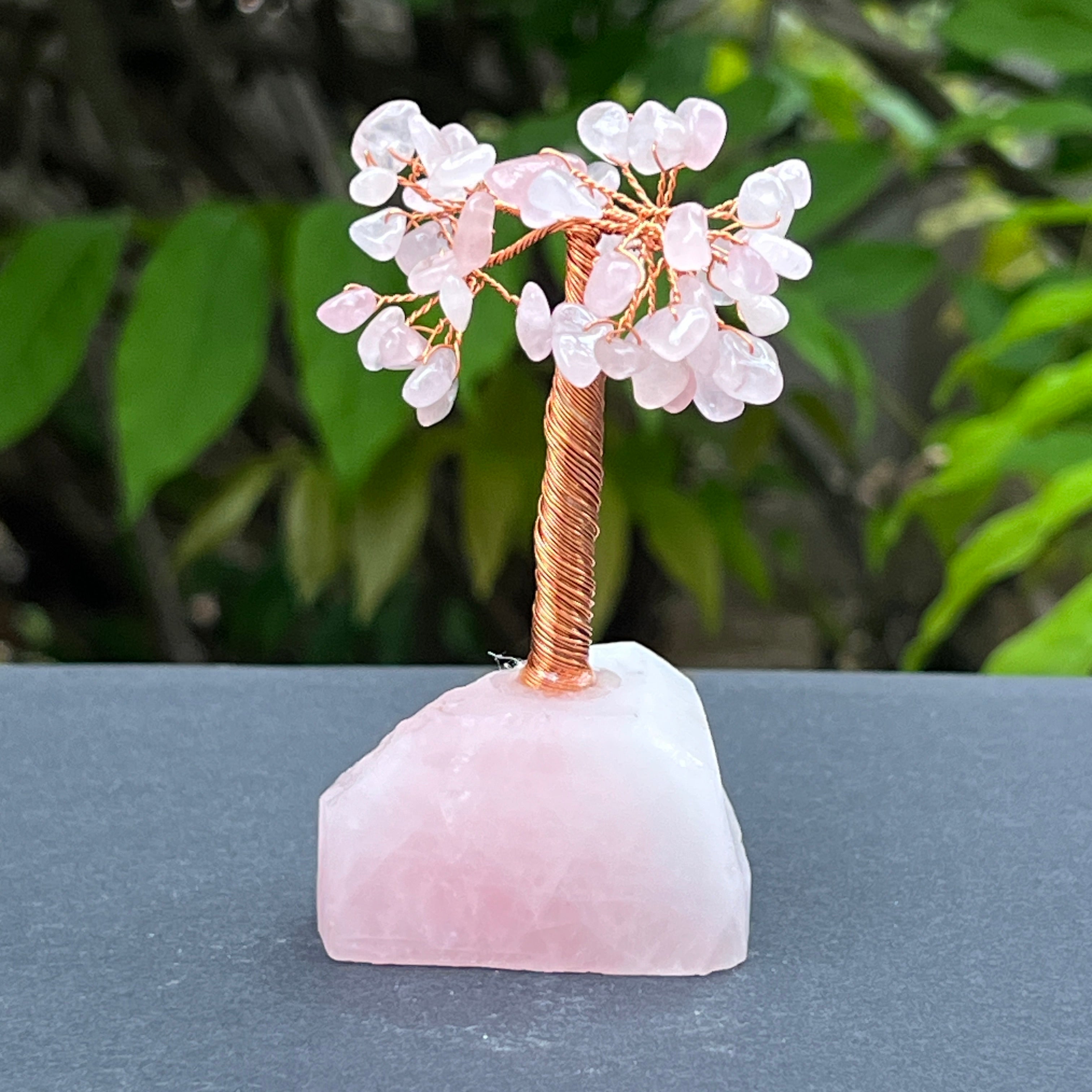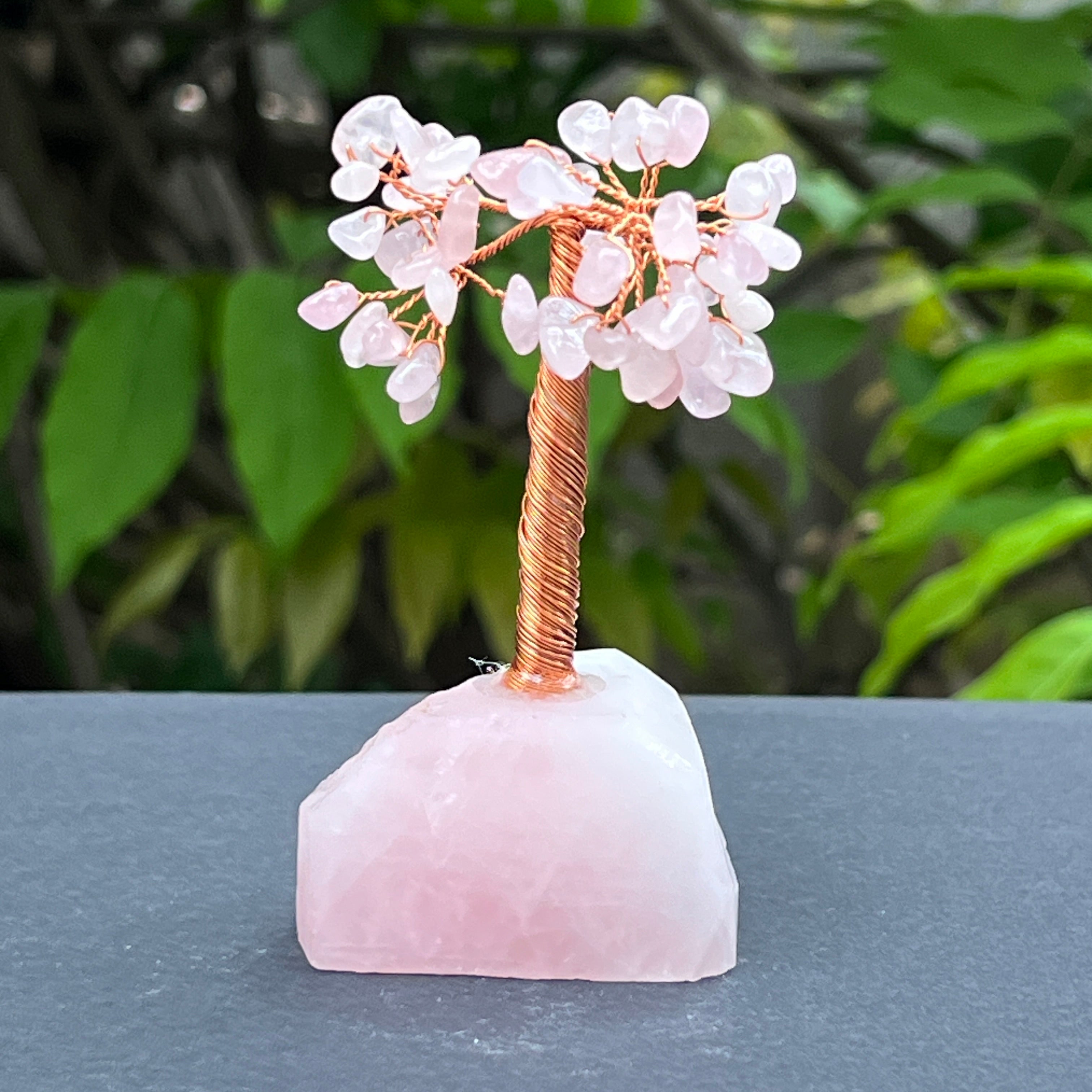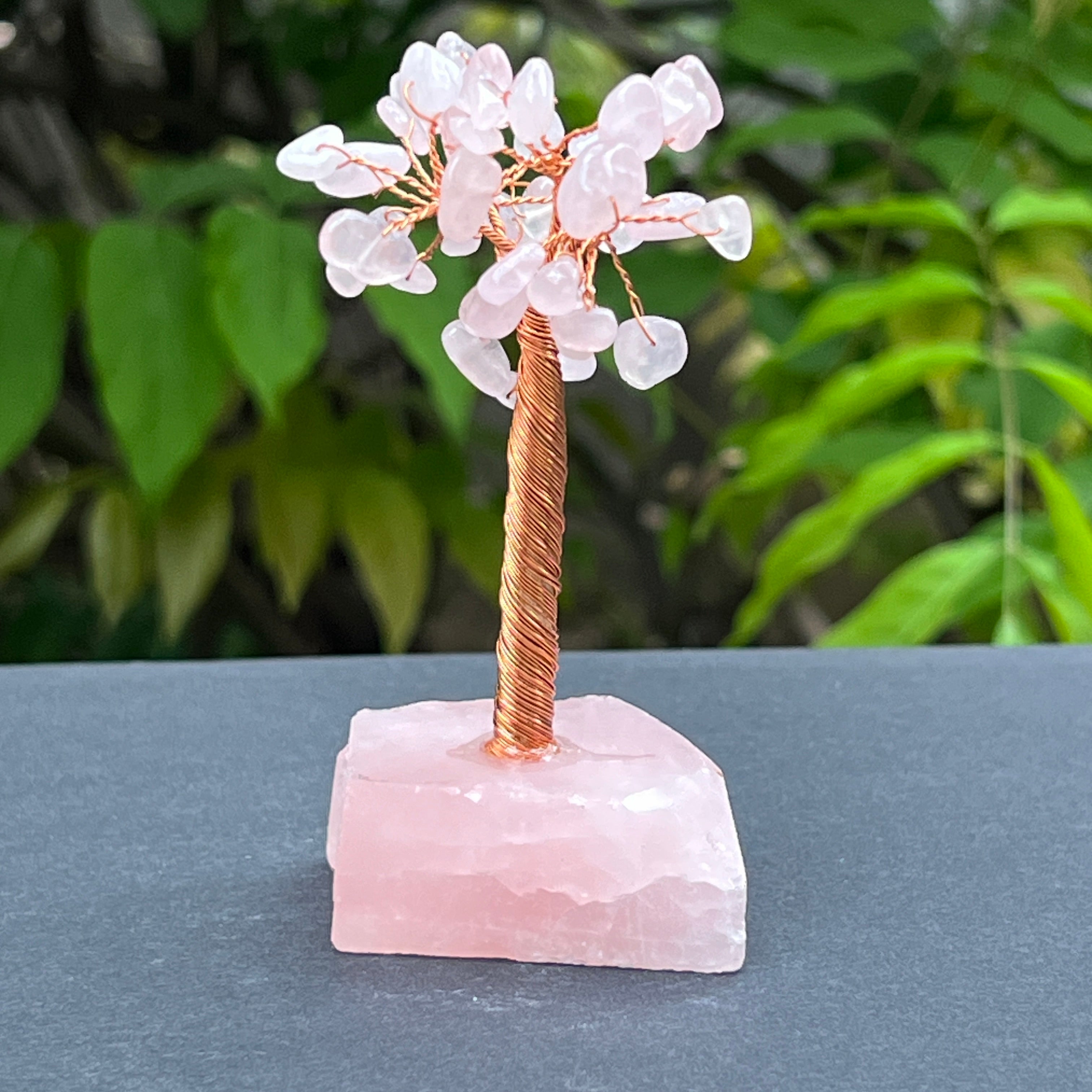 🔮 Materiales: cuarzo rosa natural (hojas y base), cobre