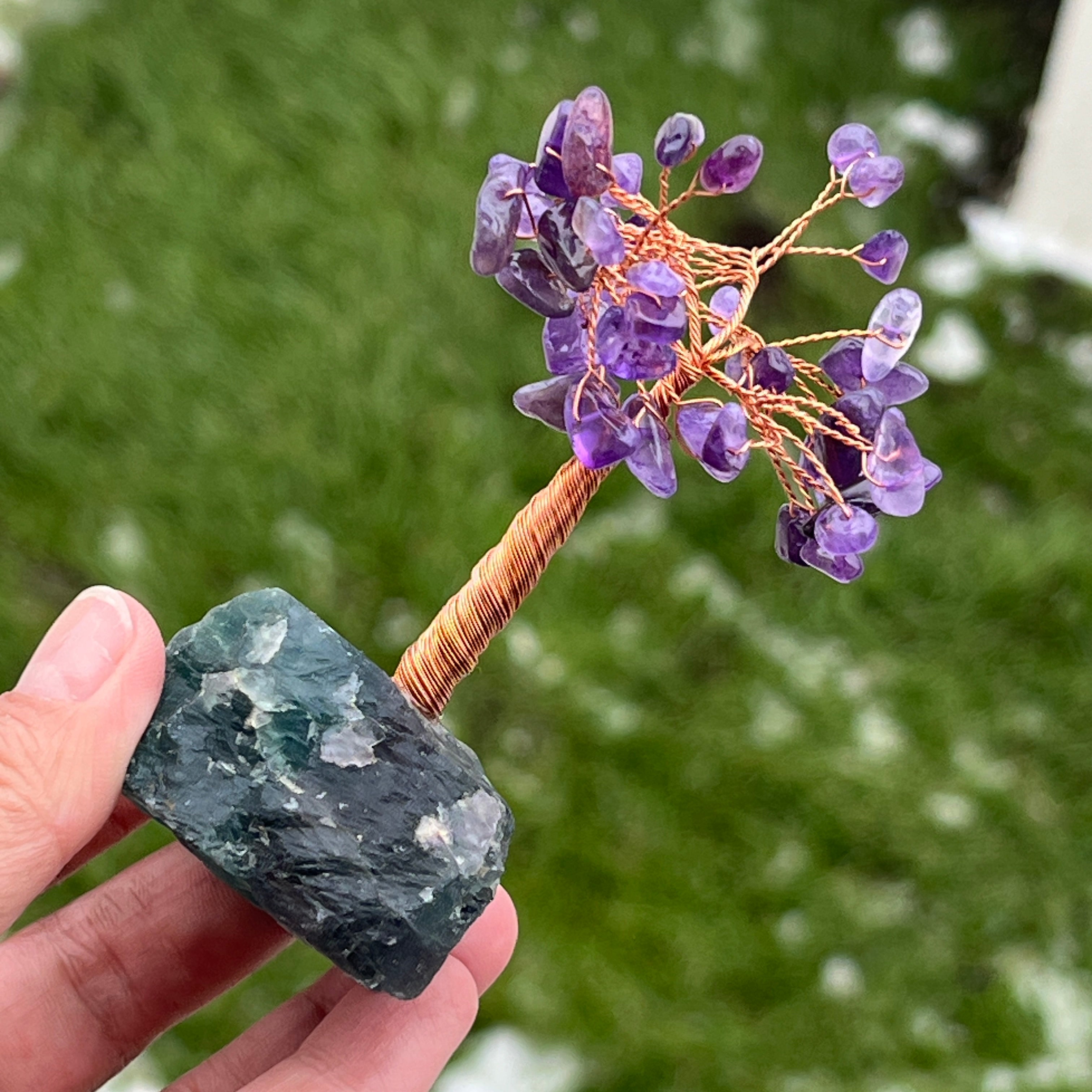 Este árbol de feng shui está hecho a mano con cristales naturales y materiales cuidadosamente seleccionados para favorecer el flujo armonioso de energía en su espacio. Las hojas son de amatista – una piedra reconocida en el feng shui por la calma y claridad mental que aporta – y la base consiste en fluorita cruda, el símbolo del amor incondicional y la curación emocional.
