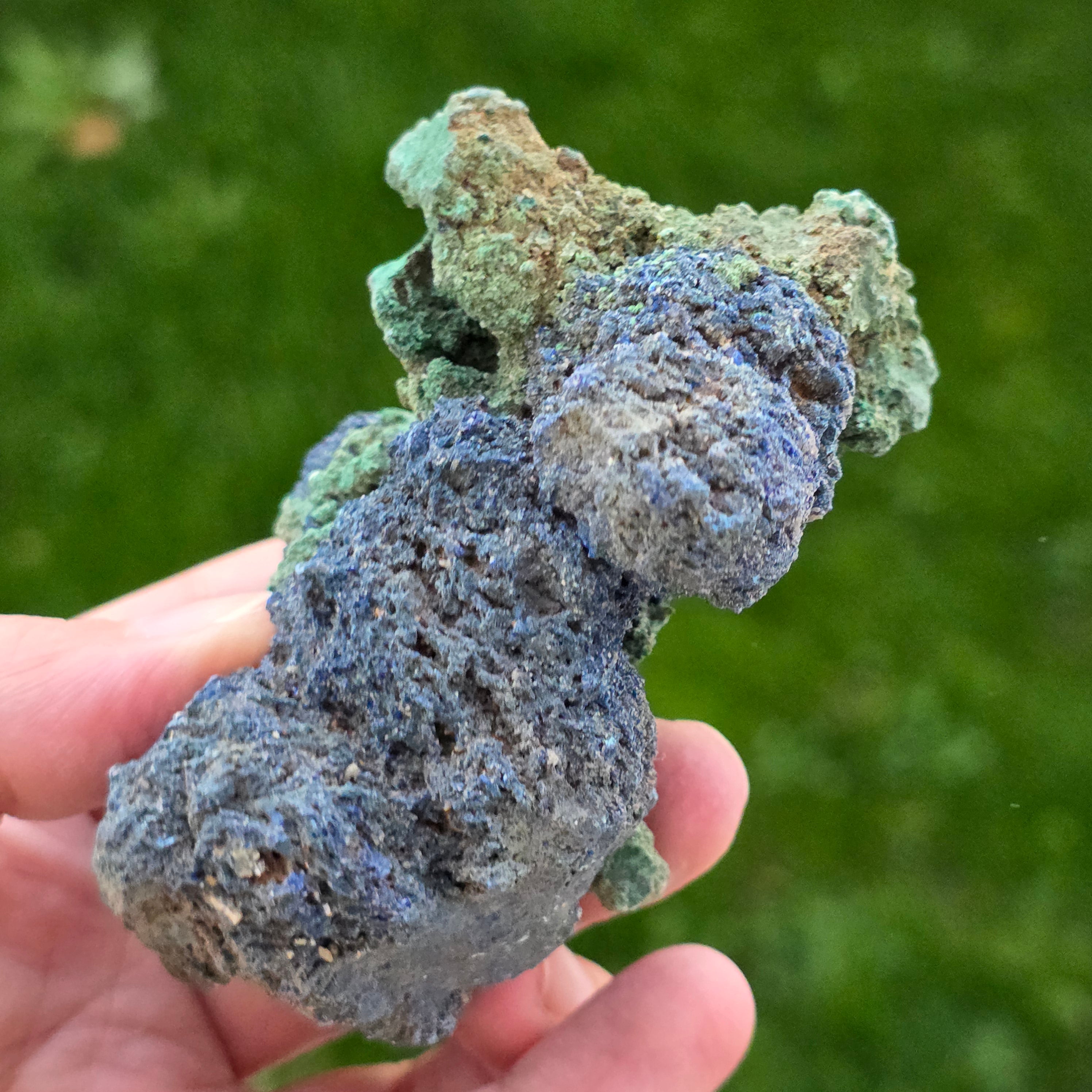 La azurita se forma principalmente en las zonas de oxidación de los depósitos de cobre. El proceso de formación implica la interacción del agua subterránea rica en carbonato con los minerales de cobre, resultando en la cristalización de la azurita en las fracturas y cavidades de las rocas. A menudo, la azurita se asocia con la malaquita, otro mineral de cobre que tiene un color verde intenso. Ambos minerales se forman en condiciones similares y, a veces, se encuentran juntos en forma de piedras de azurita-malaquita.