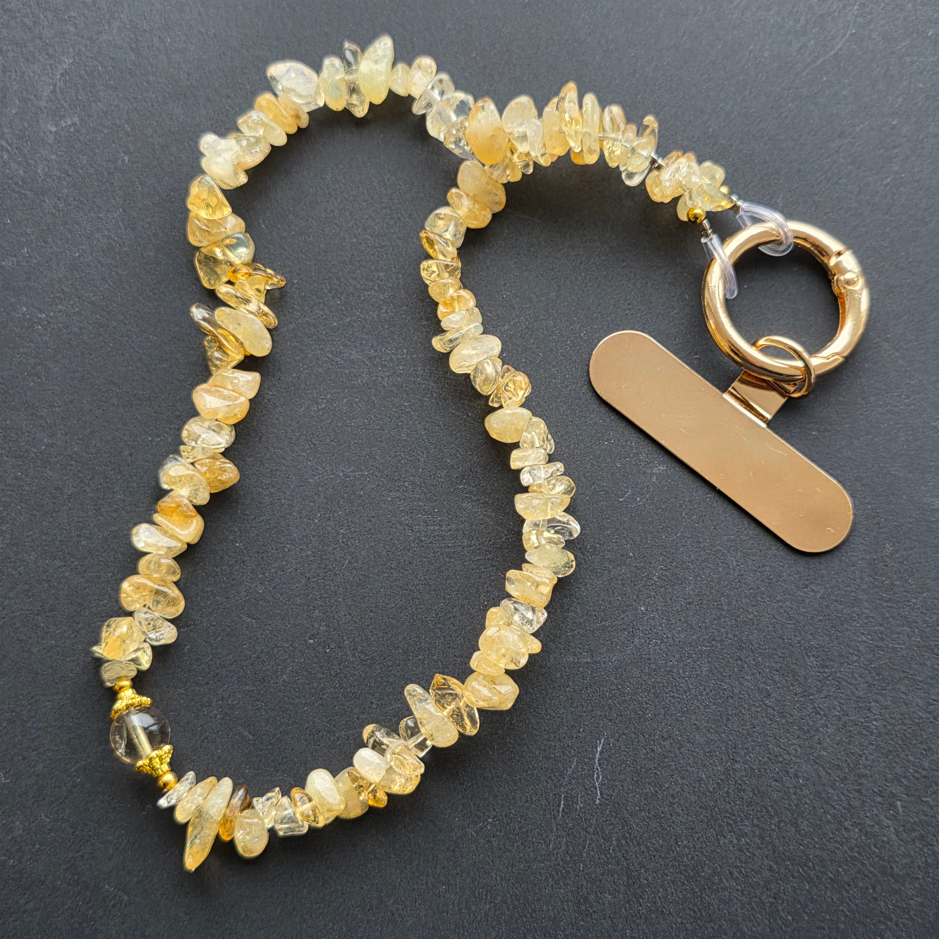 El citrino es la piedra de la energía solar, asociada con el optimismo, la claridad mental y el buen estado de ánimo. Sus chips amarillo-dorados aportan un toque luminoso y alegre al teléfono, transformando un accesorio práctico en un detalle elegante y lleno de vitalidad.