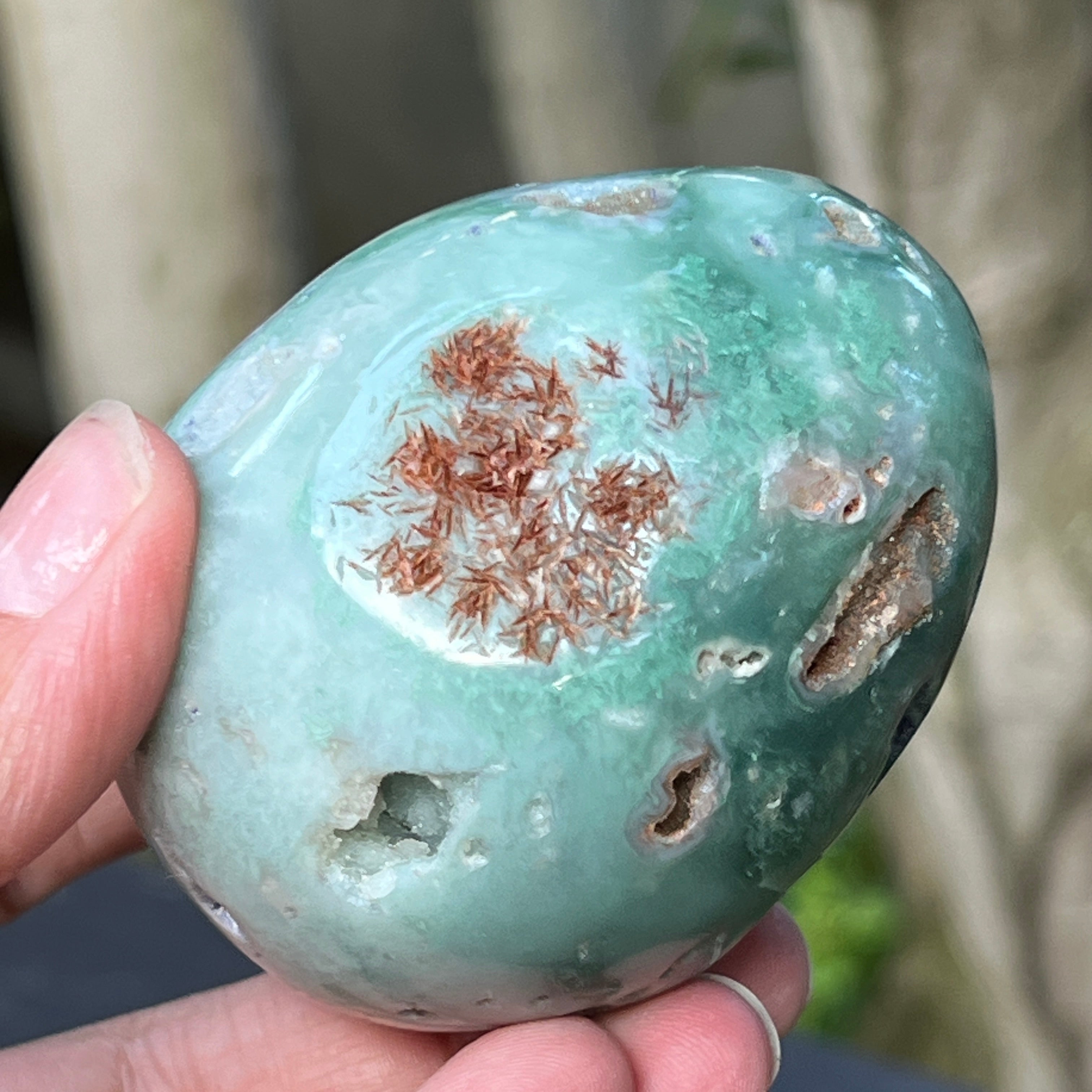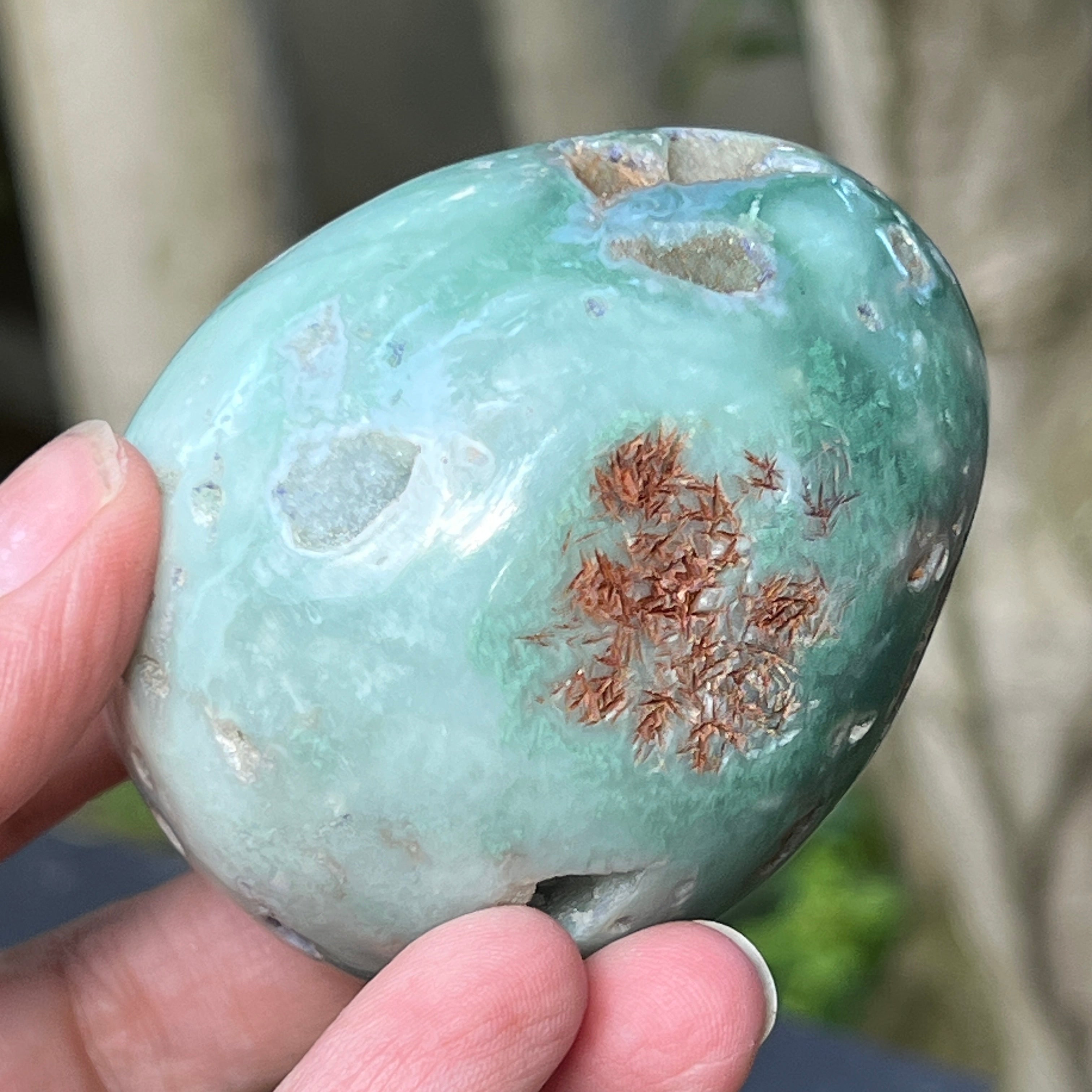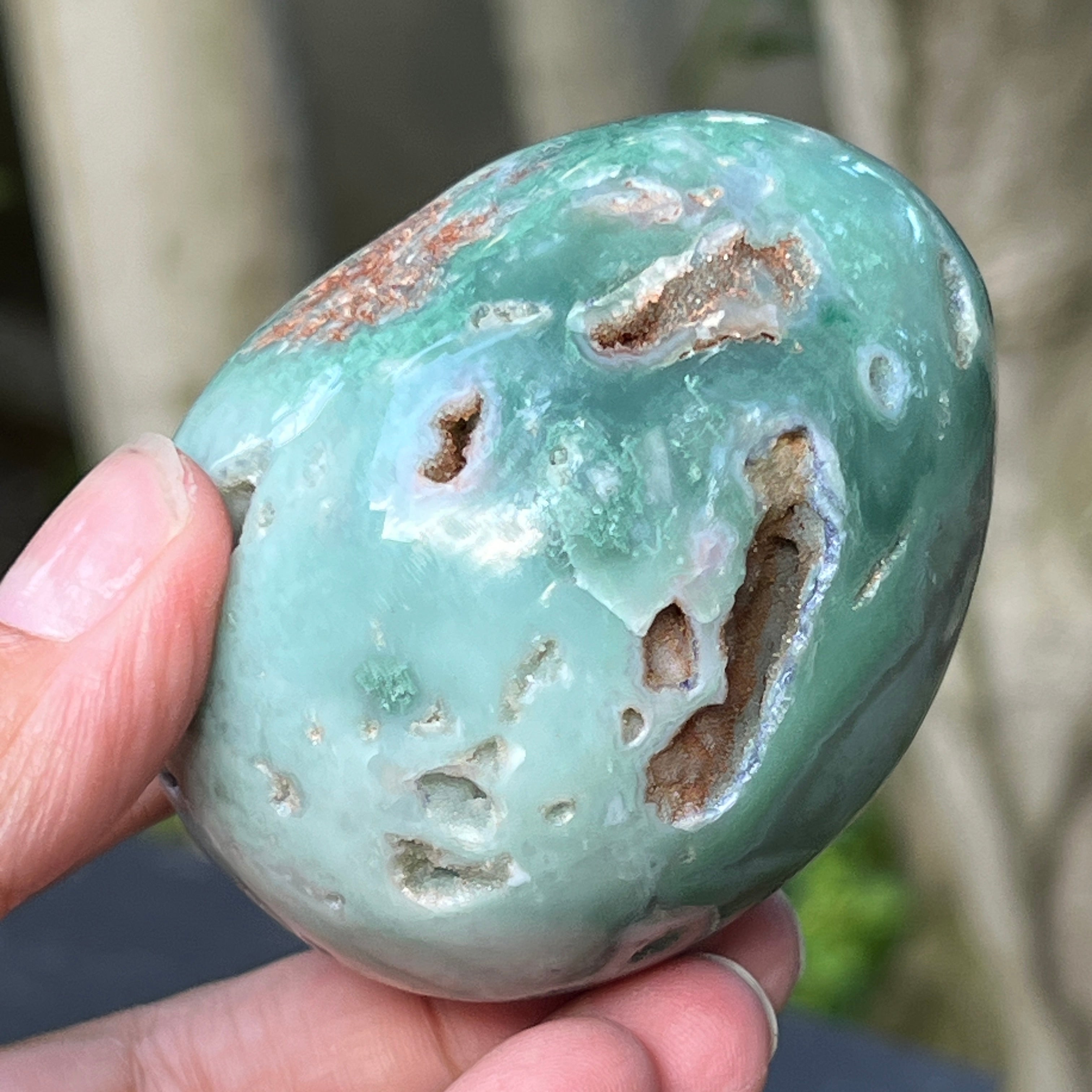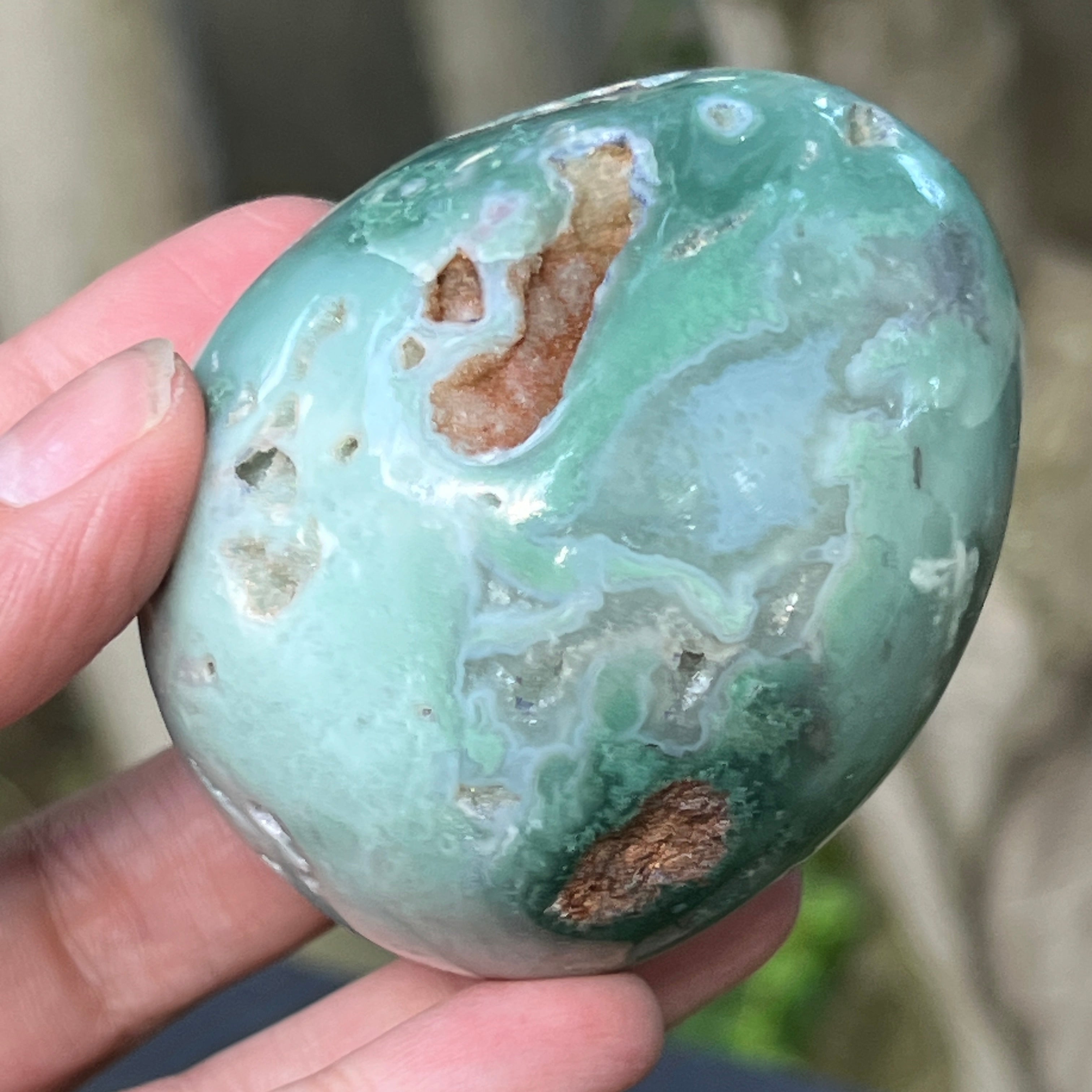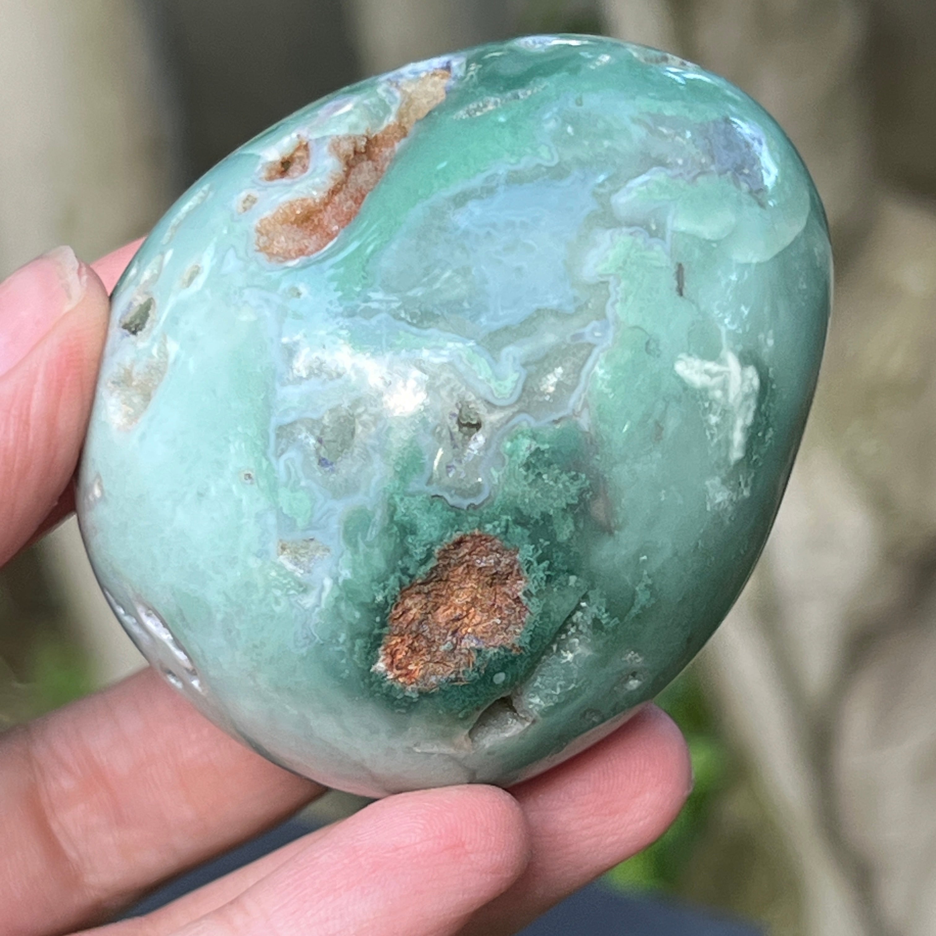 Es una forma natural, no alterada, de una calcedonia con cromo, un mineral difícil de encontrar, extraído exclusivamente de Zimbabue y apreciado por su color vivo, que no proviene del níquel (como en la crisoprasa), sino del cromo que late profundamente en su estructura cristalina. En esta variante especial, las inserciones de azul y verde crean un juego cromático fascinante, con transiciones suaves entre translúcido y opaco, entre denso y aireado.