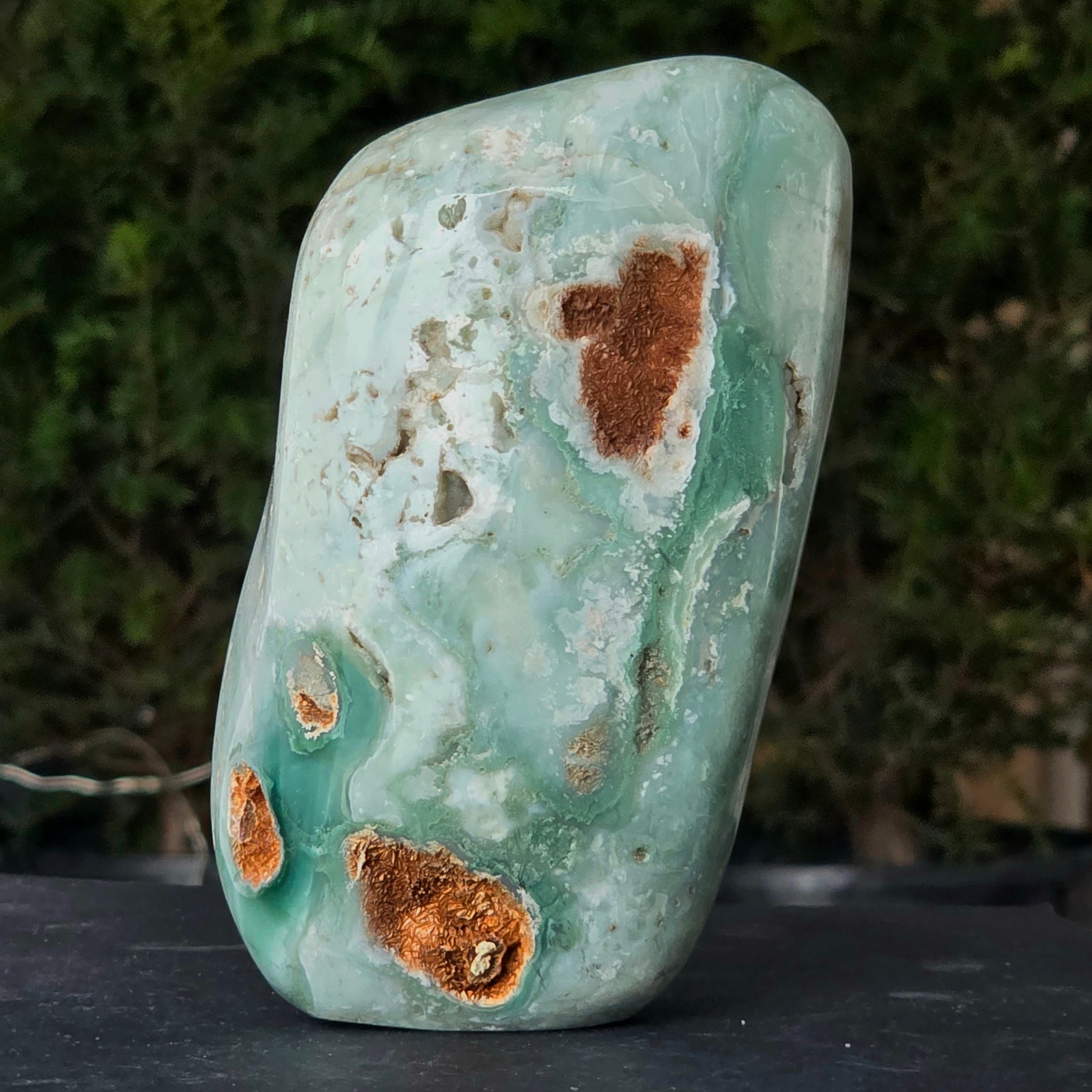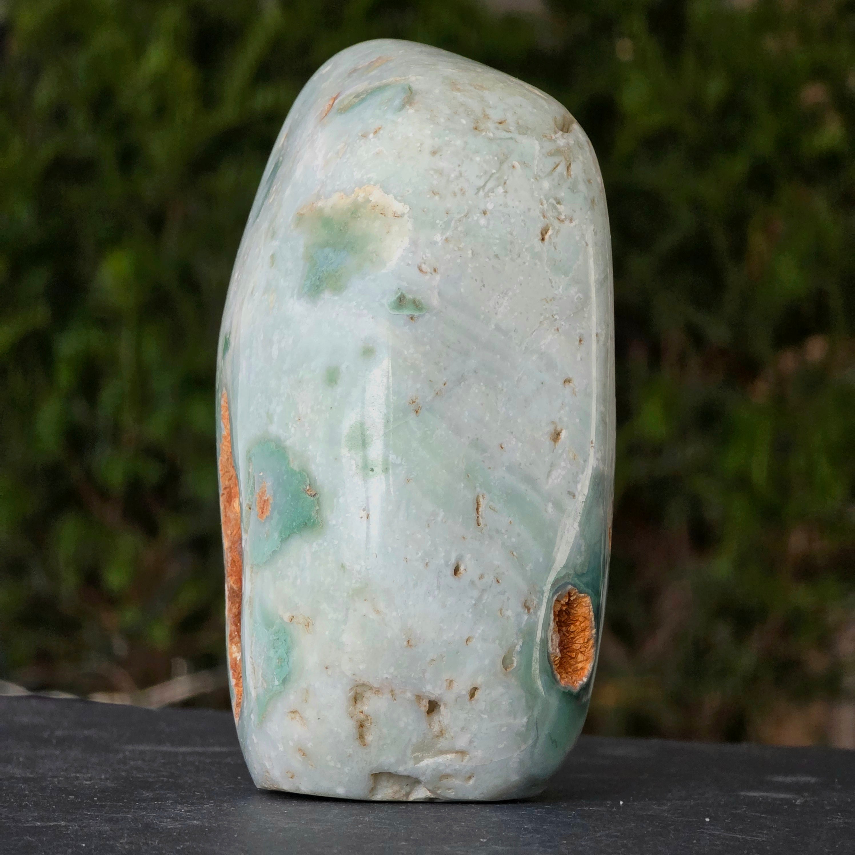 Es una forma natural, intacta, de una calcedonia cromada, un mineral difícil de encontrar, extraído exclusivamente en Zimbabue y apreciado por su color vivo, que no proviene del níquel (como en la crisoprasa), sino del cromo que late profundamente en su estructura cristalina. En esta versión especial, las inserciones de azul y verde crean un juego cromático fascinante, con transiciones suaves entre translúcido y opaco, entre denso y aireado.