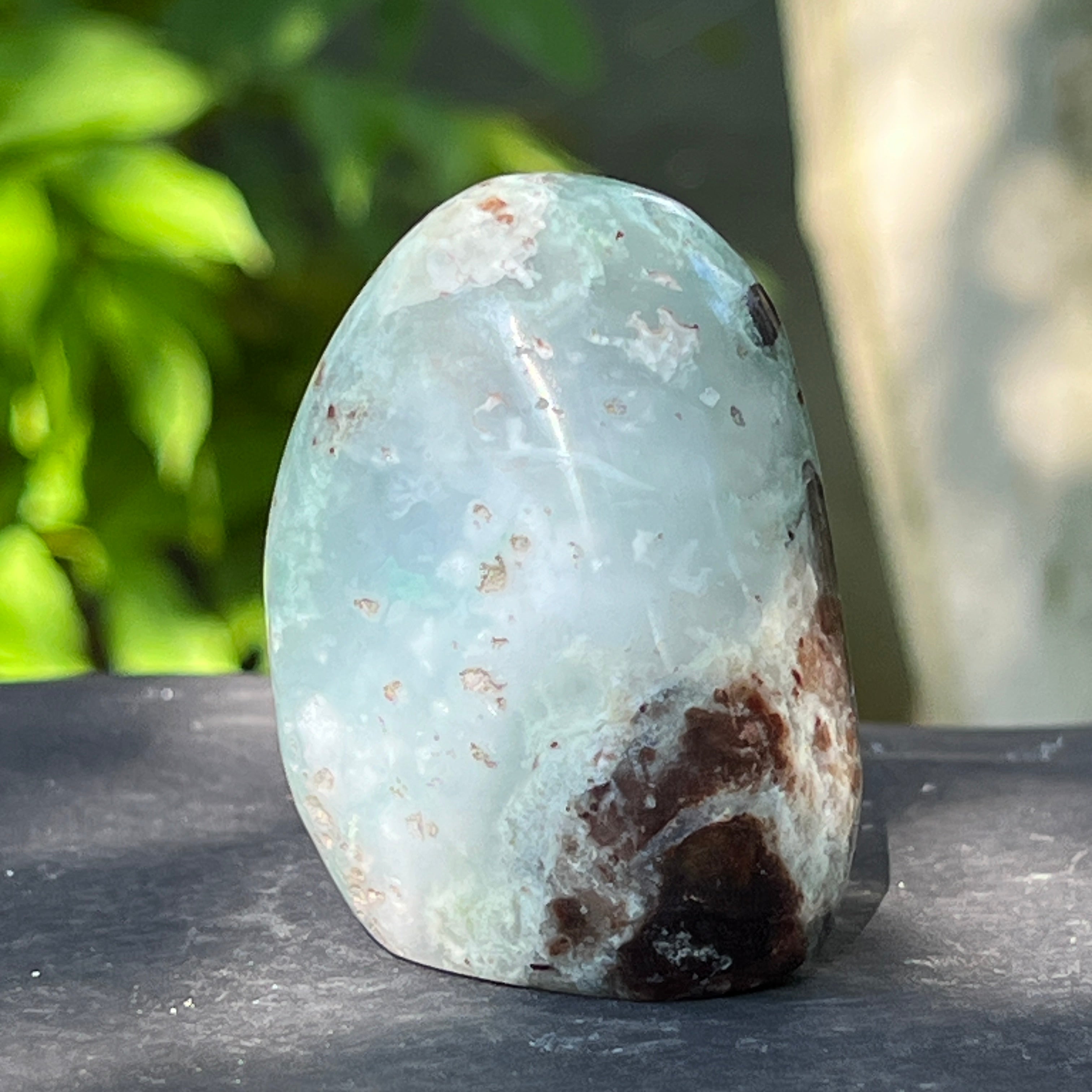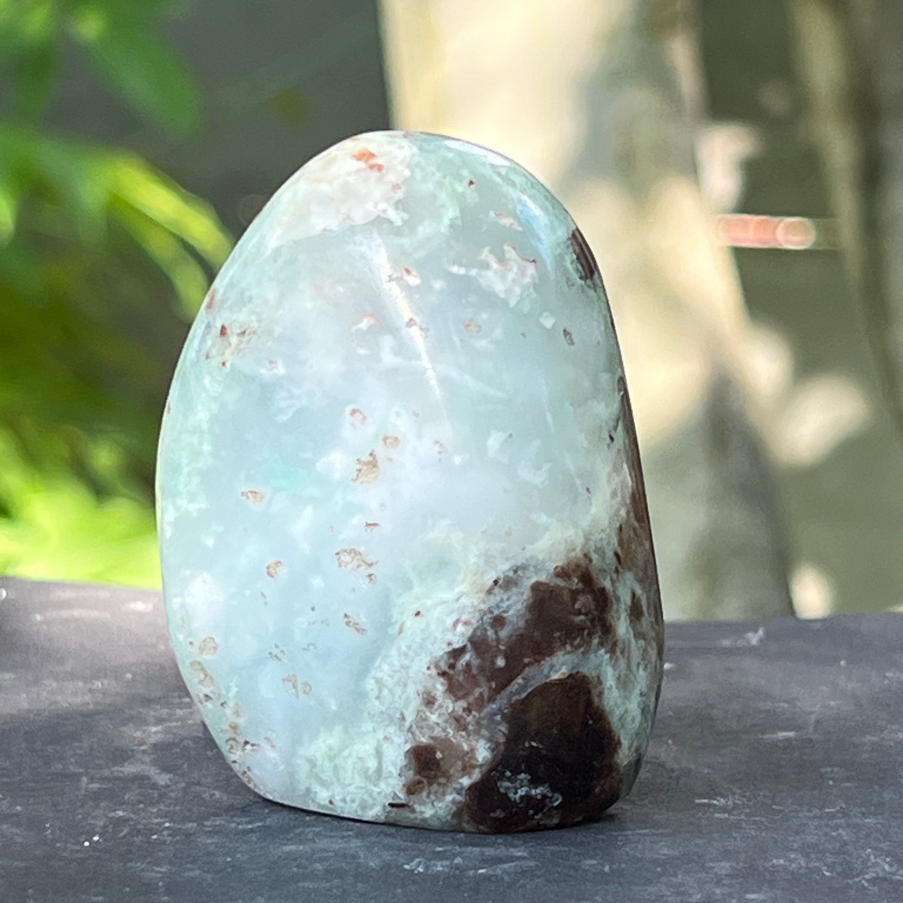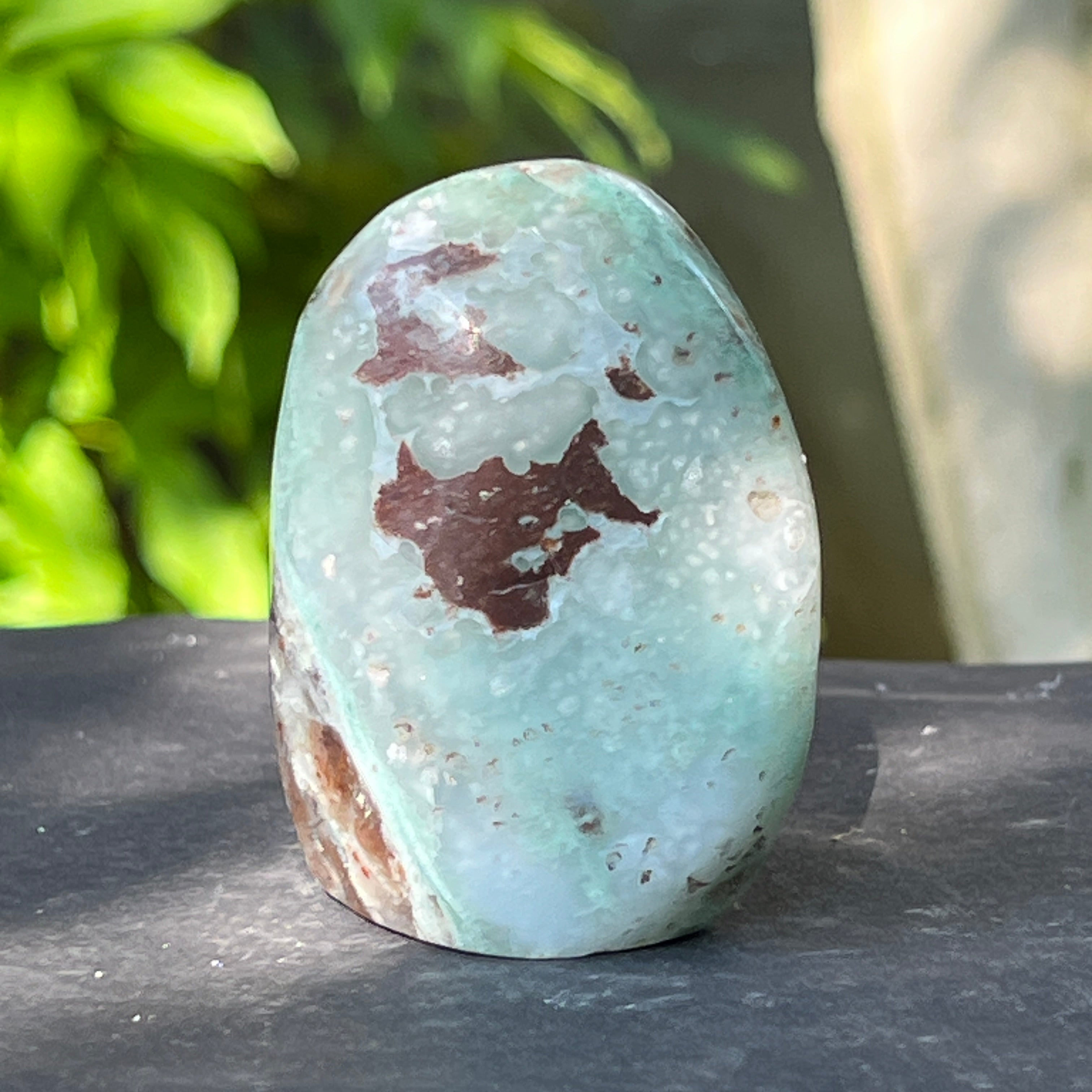 Es una forma natural, no alterada, de una calcedonia cromífera – un mineral difícil de encontrar, extraído exclusivamente en Zimbabue y apreciado por su color vivo, que no proviene del níquel (como en la crisoprasa), sino del cromo que pulsa profundamente en su estructura cristalina. En esta variante especial, las inserciones de azul y verde crean un juego cromático fascinante, con transiciones suaves entre translúcido y opaco, entre denso y aireado.