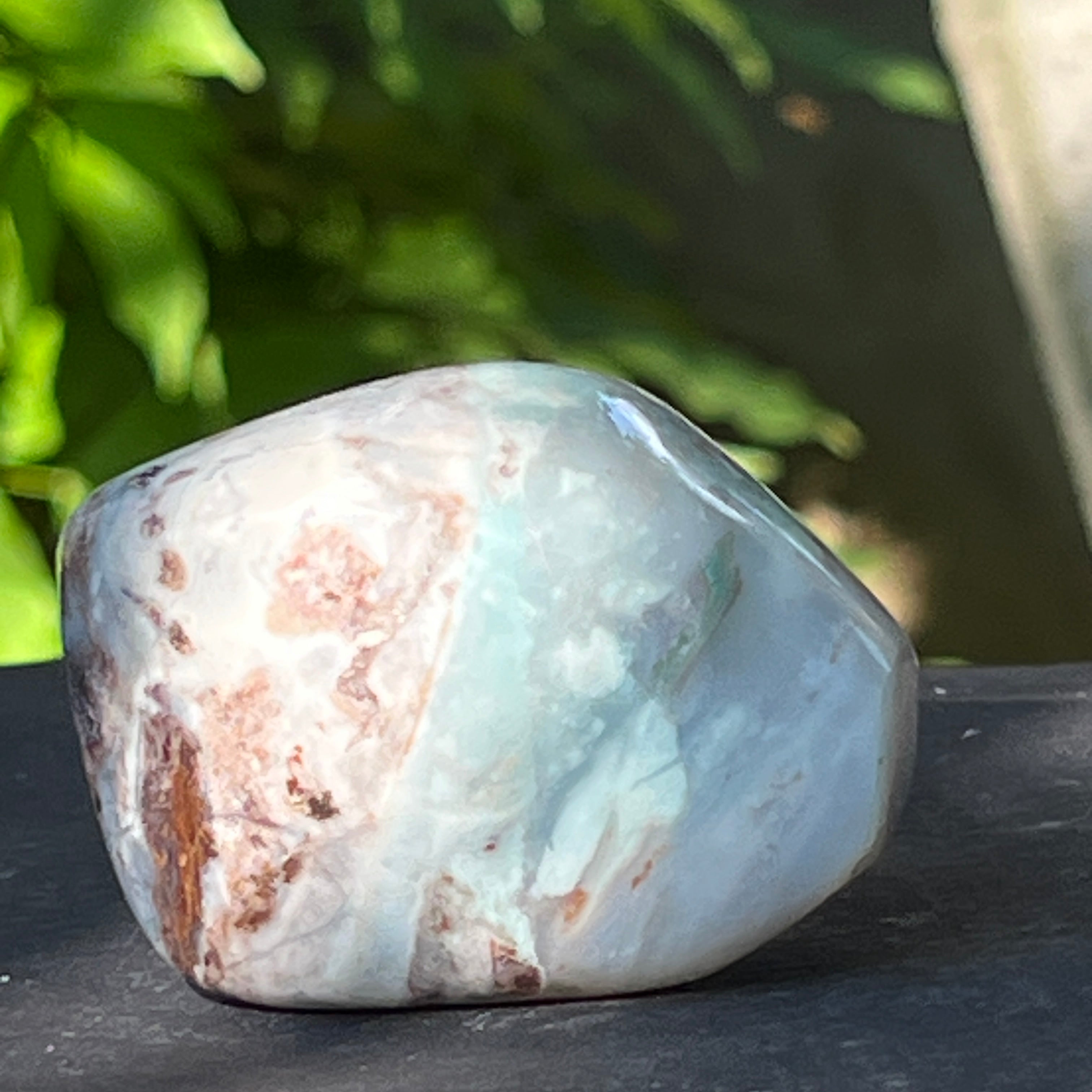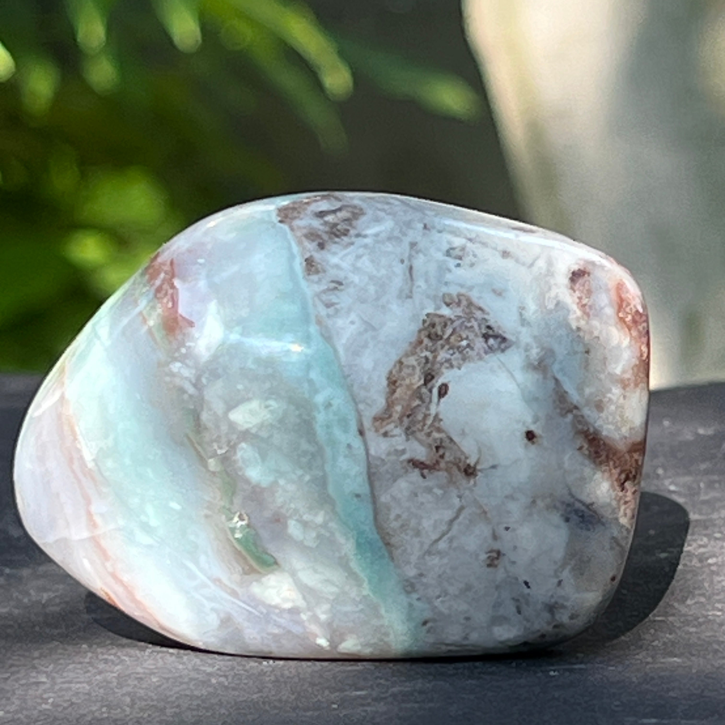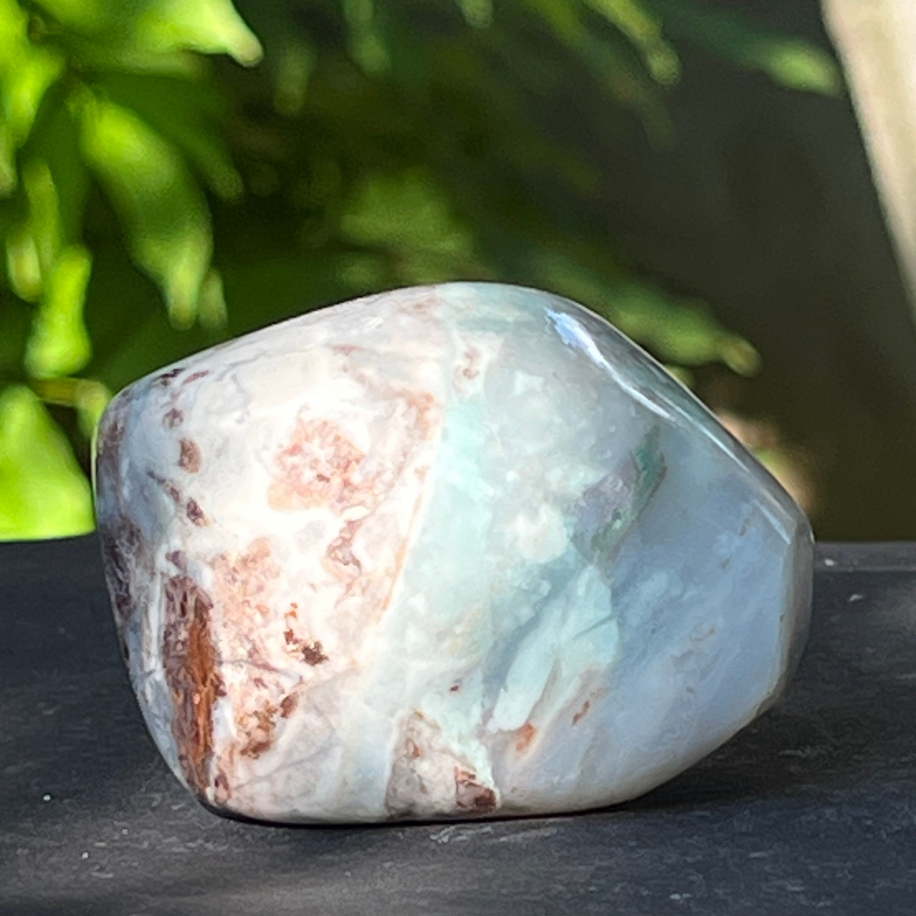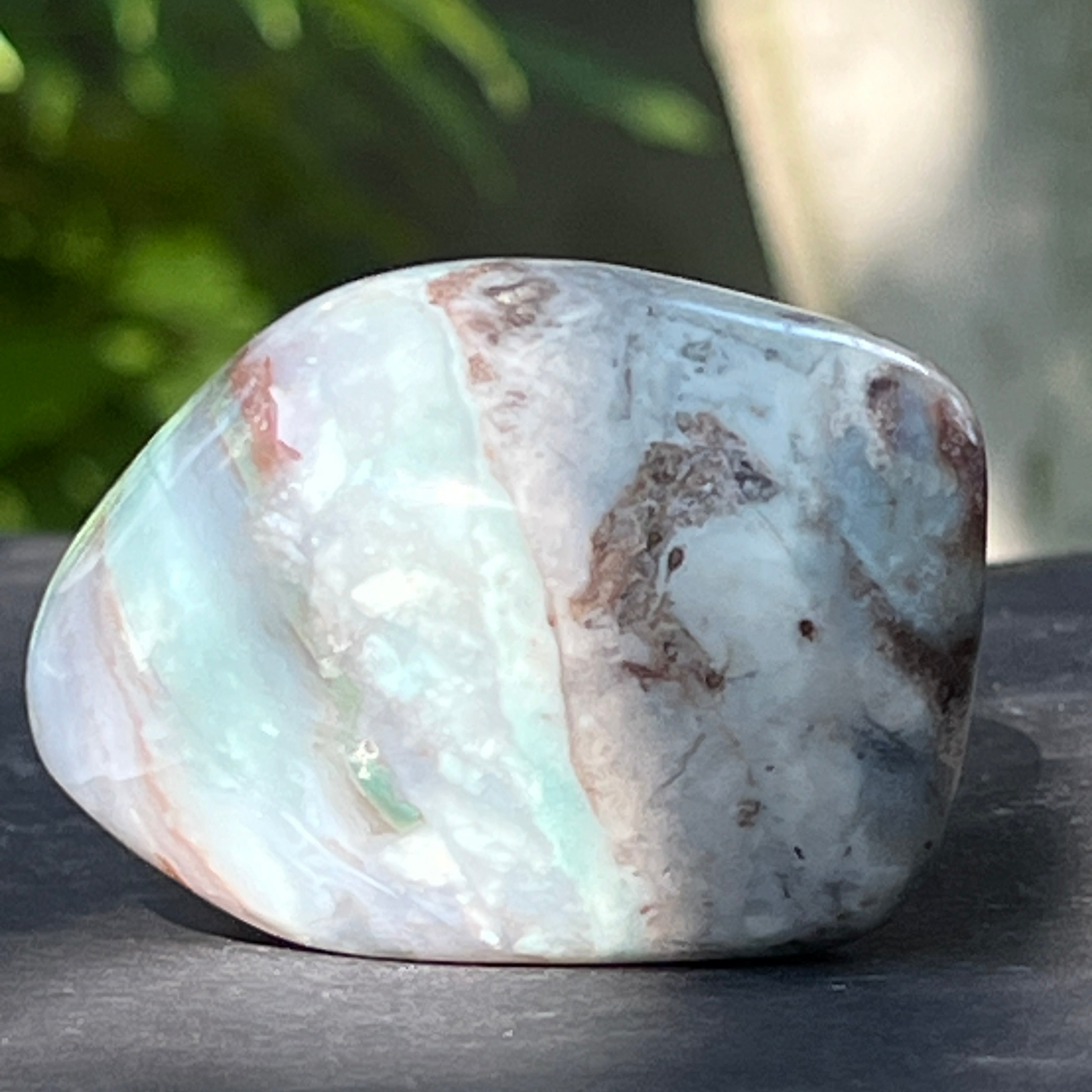 Es una forma natural, sin alteraciones, de una calcedonia cromífera, un mineral difícil de encontrar, extraído exclusivamente en Zimbabue y apreciado por su color vivo, que no proviene del níquel (como en el crisoprasa), sino del cromo que pulsa en lo profundo de su estructura cristalina. En esta variante particular, las inserciones de azul y verde crean un juego cromático fascinante, con transiciones suaves entre lo translúcido y lo opaco, entre lo denso y lo liviano.