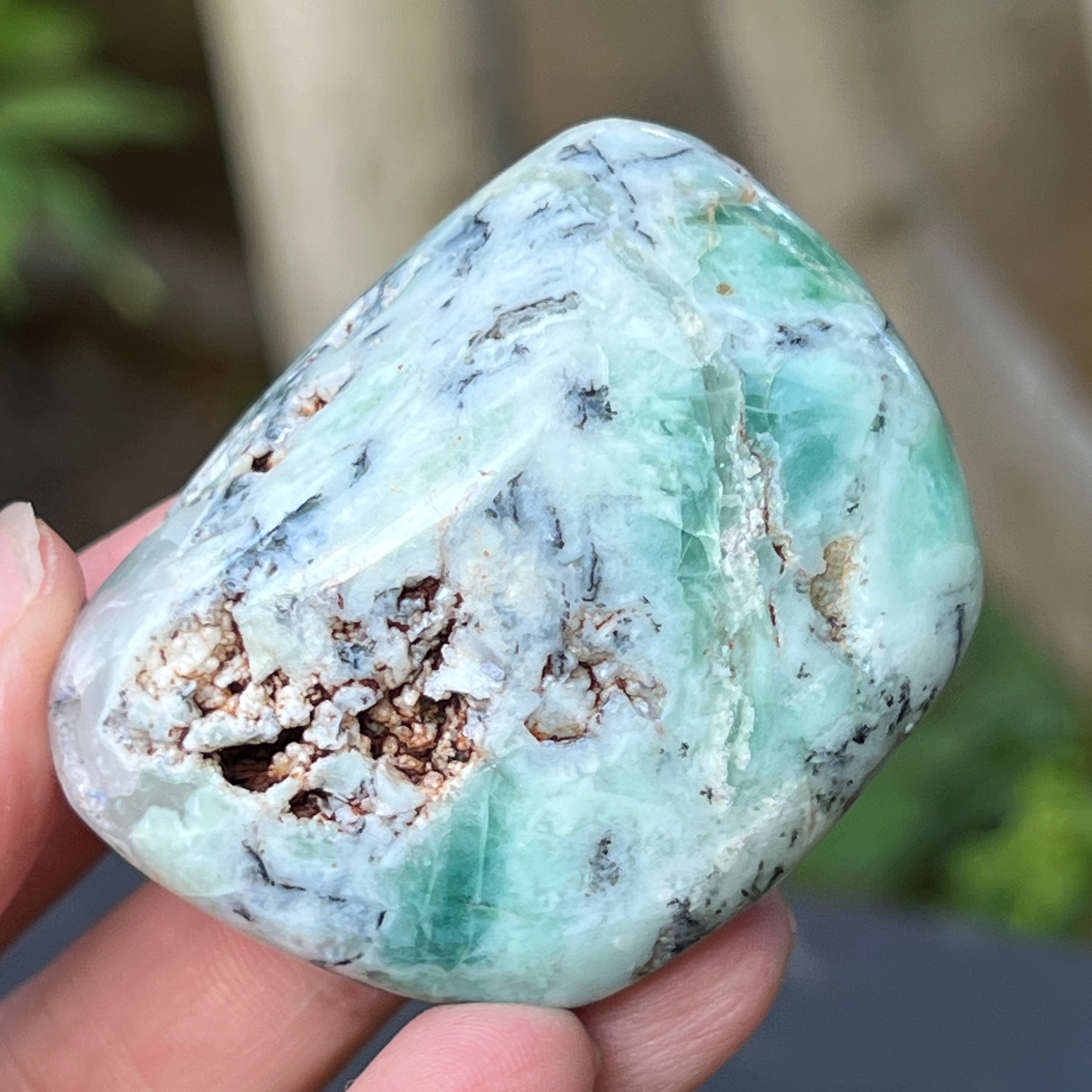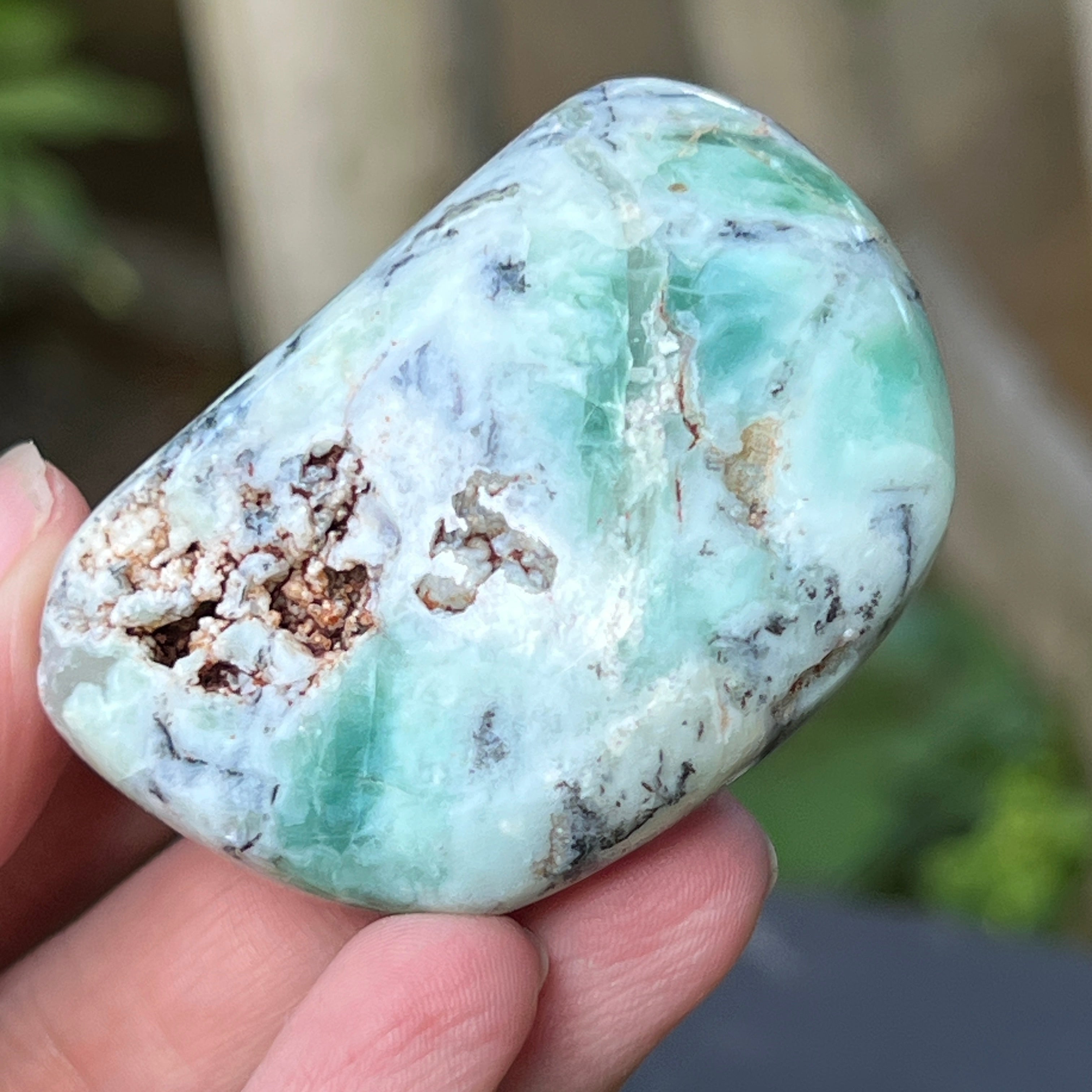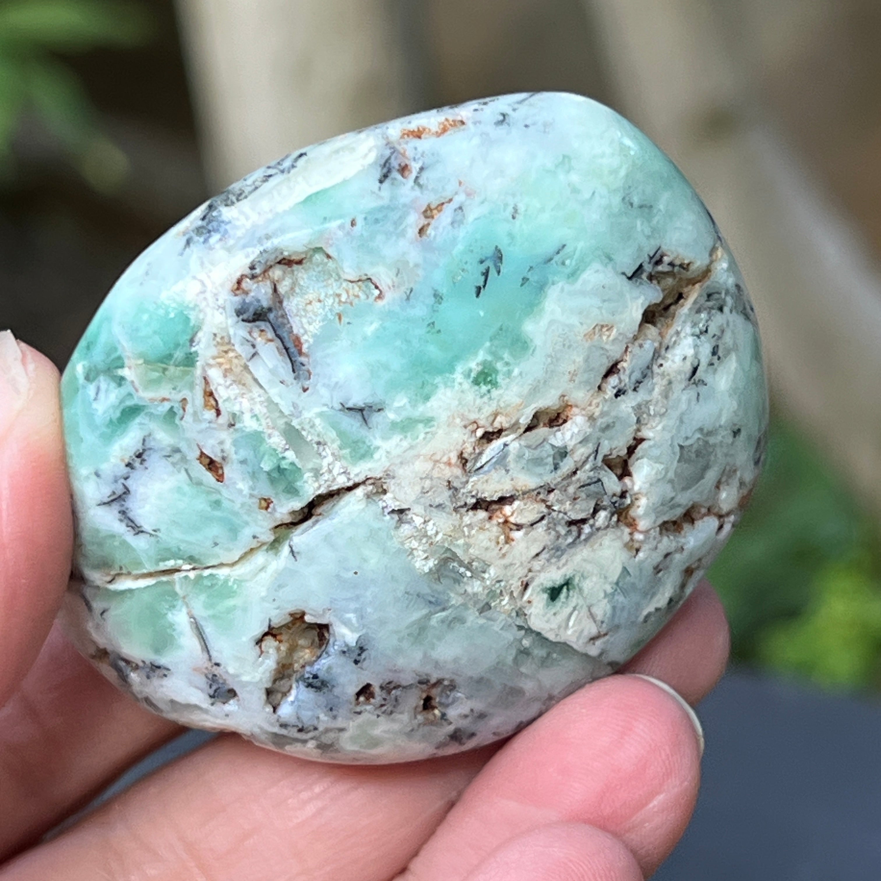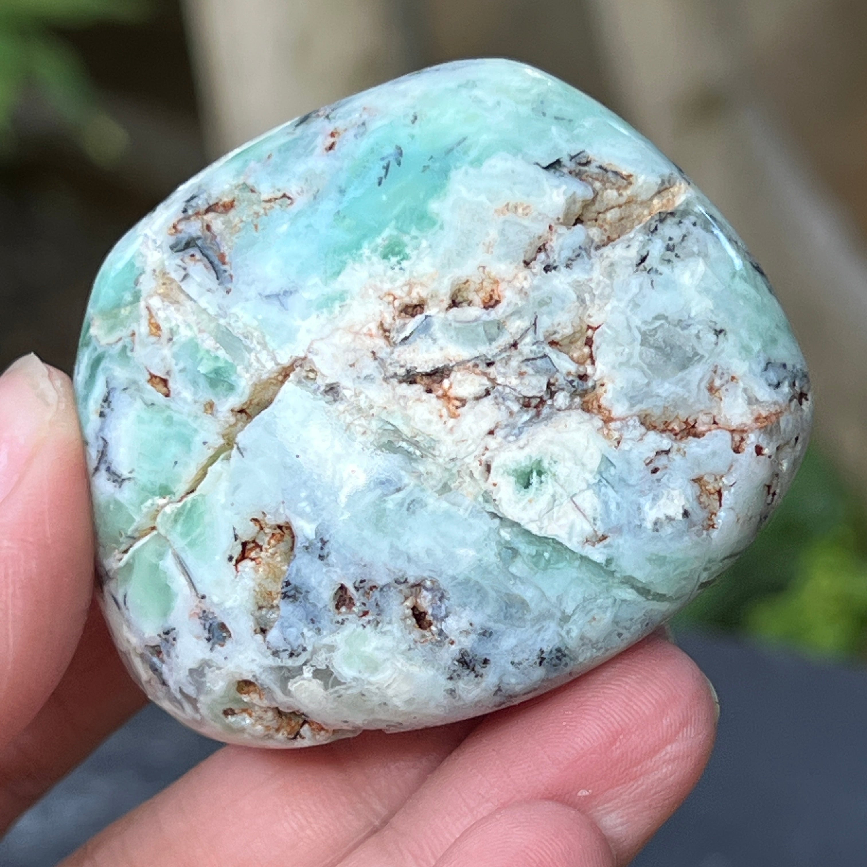 Es una forma natural, sin alterar, de calcedonia cromífera, un mineral difícil de encontrar, extraído exclusivamente en Zimbabwe y apreciado por su color vivo, que no proviene del níquel (como en la crisoprasa), sino del cromo que late en lo profundo de su estructura cristalina. En esta variante particular, las inserciones de azul y verde crean un juego cromático fascinante, con transiciones suaves entre translúcido y opaco, entre denso y aireado.