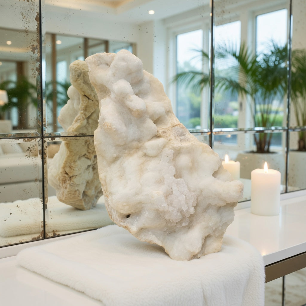 El color blanco-crema, con matices beige discretos, se realza con el brillo sutil de los microcristales en la superficie, que reflejan la luz de manera suave y elegante. Los detalles finos, el aspecto coraliforme y la forma armoniosa hacen de esta pieza una presencia visual notable.