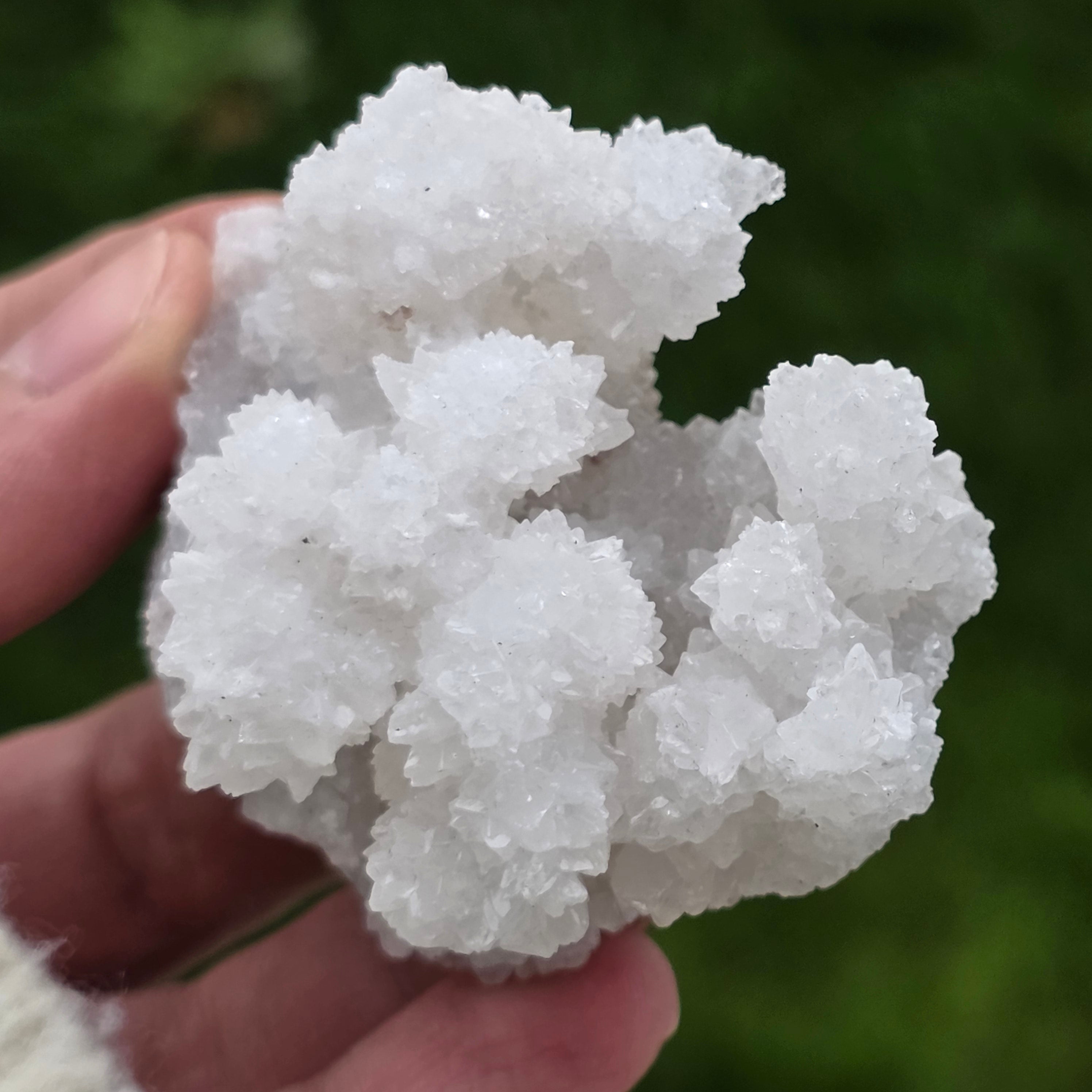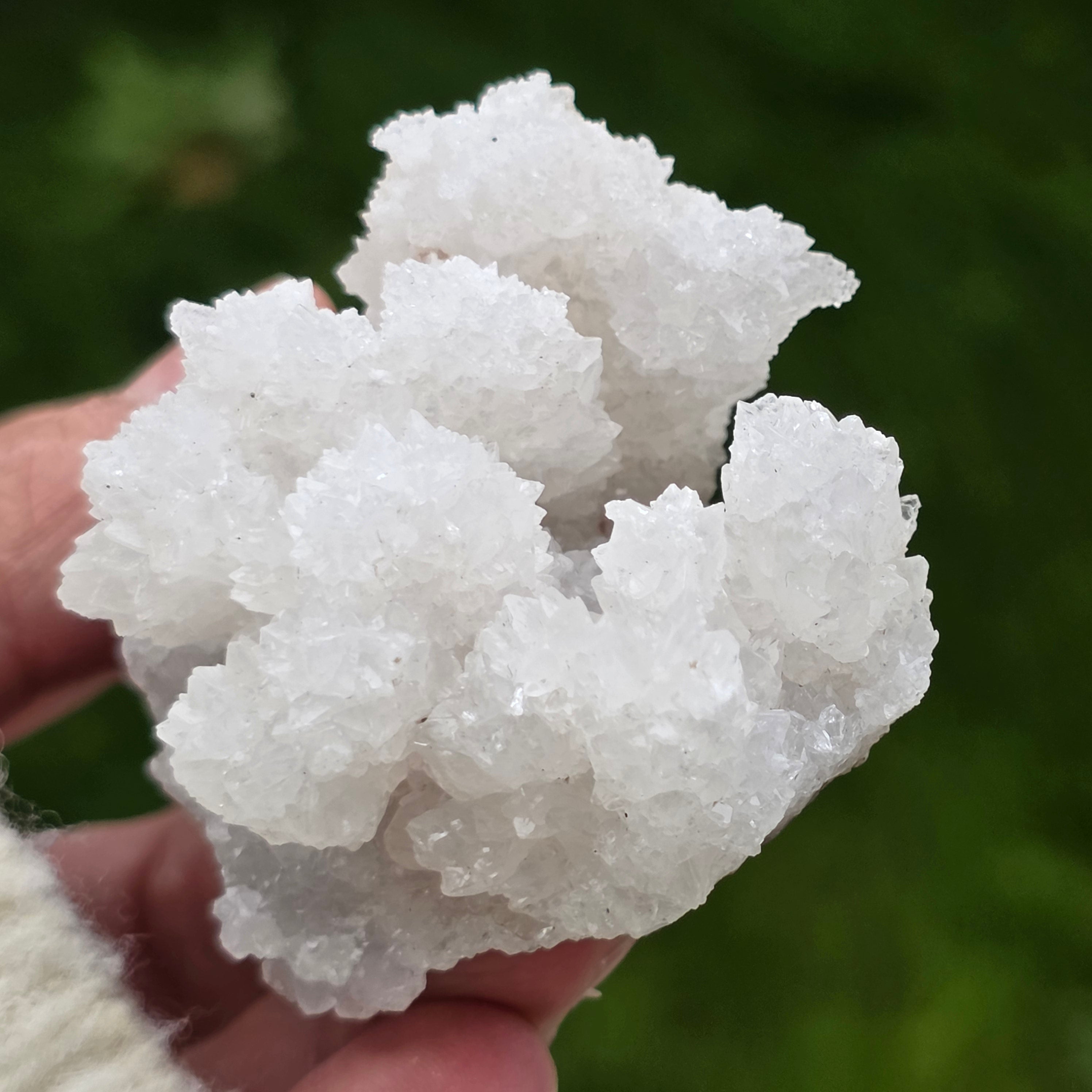 Los cristales están dispuestos en estructuras irregulares y redondeadas, con superficies ligeramente brillantes, que recuerdan a las formaciones halladas en el interior de las cuevas. La textura rica y el volumen bien definido otorgan a cada ejemplar un carácter auténtico y expresivo, muy apreciado en colecciones de minerales y como pieza decorativa natural.