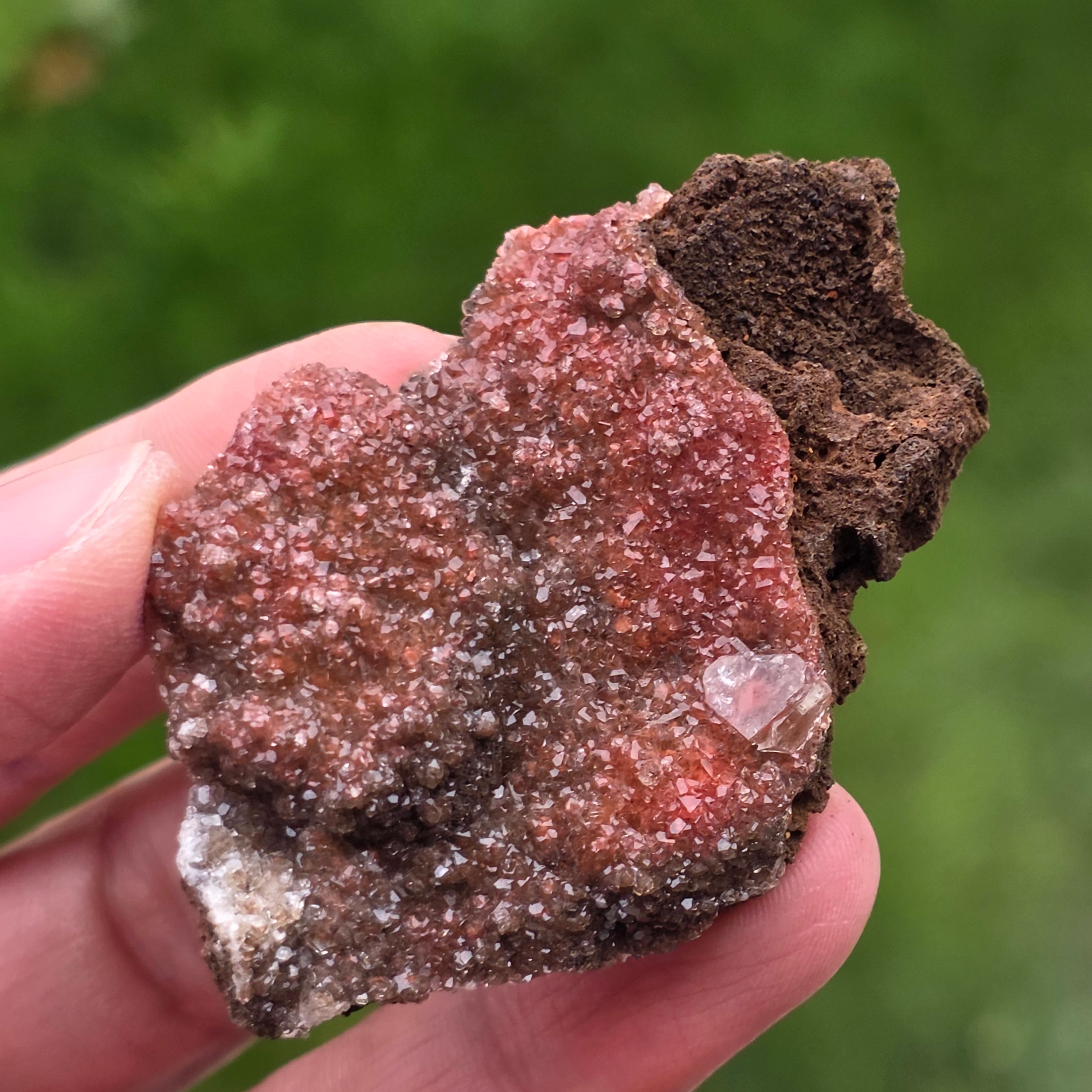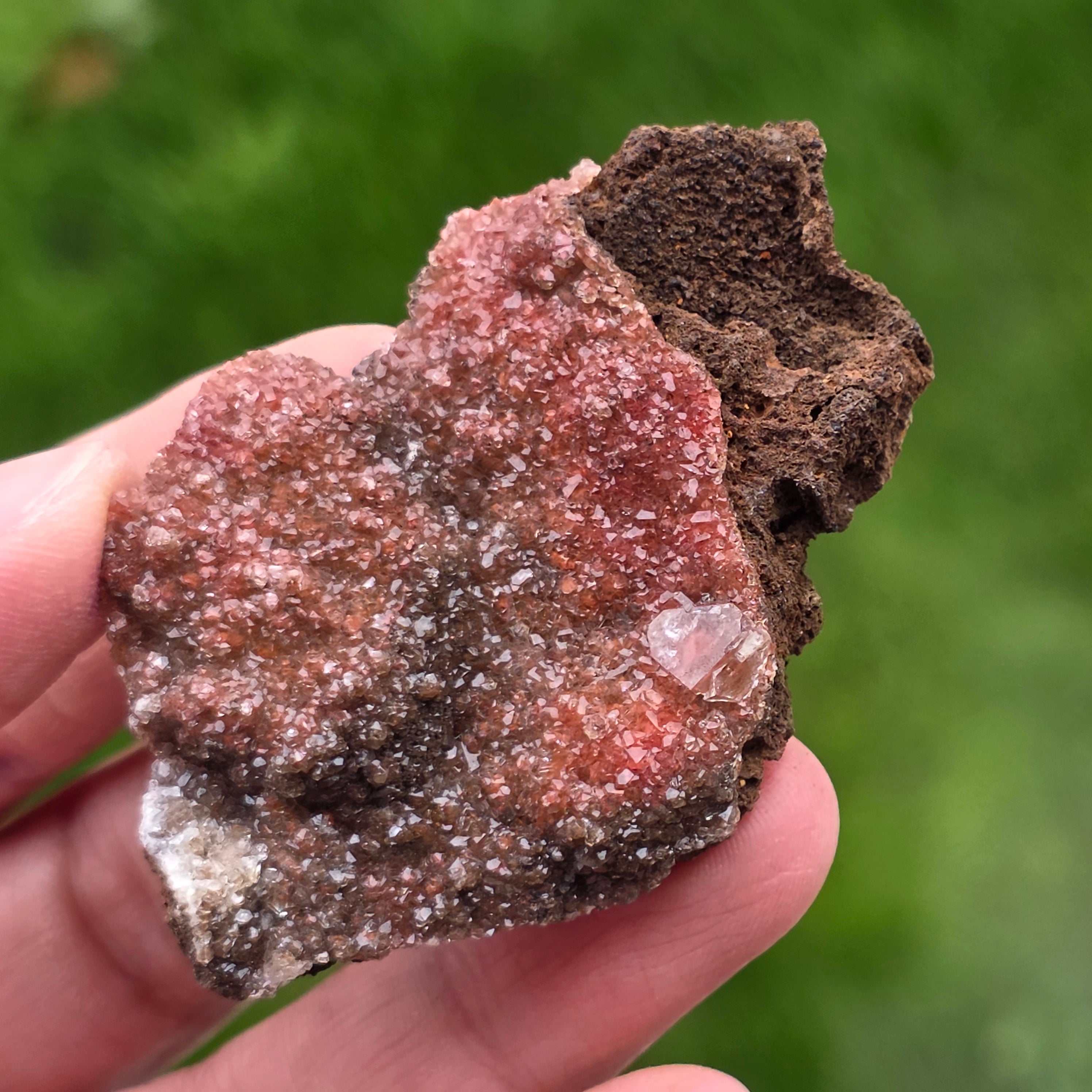Los cristales de calcita presentan el hábito específico llamado "calcita diamante", caracterizado por terminaciones bien definidas y caras brillantes, que reflejan la luz de manera sutil pero expresiva. La disposición compacta de los cristales crea una superficie brillante, con textura rica, siendo cada pieza diferente en forma, intensidad del color y distribución de los cristales.