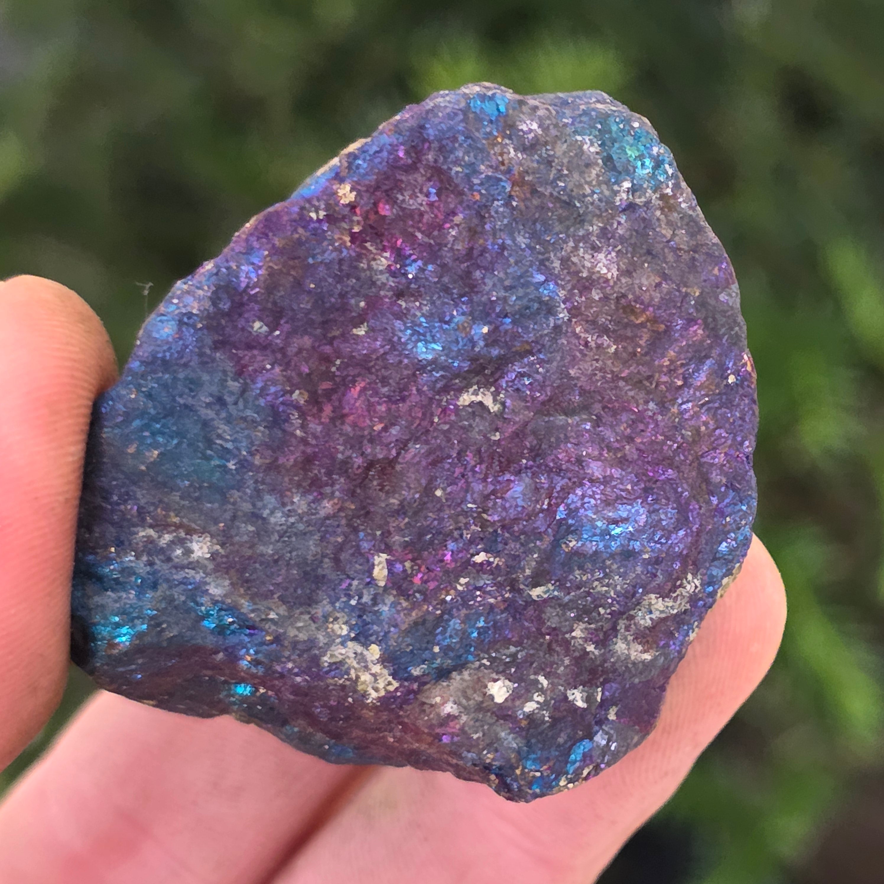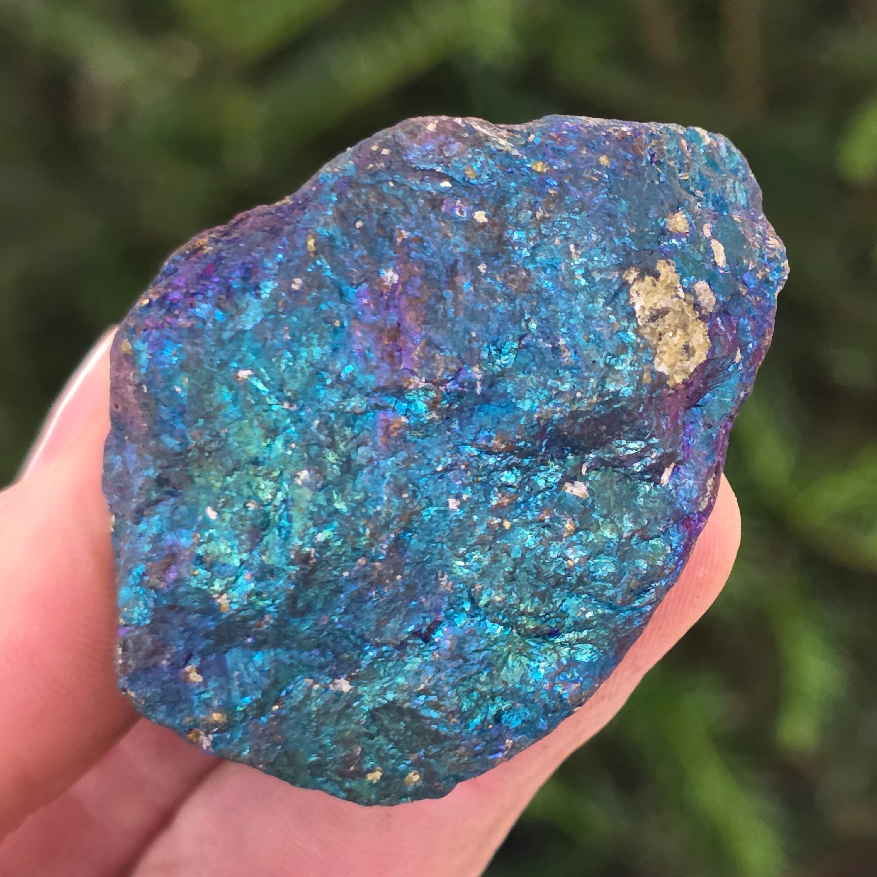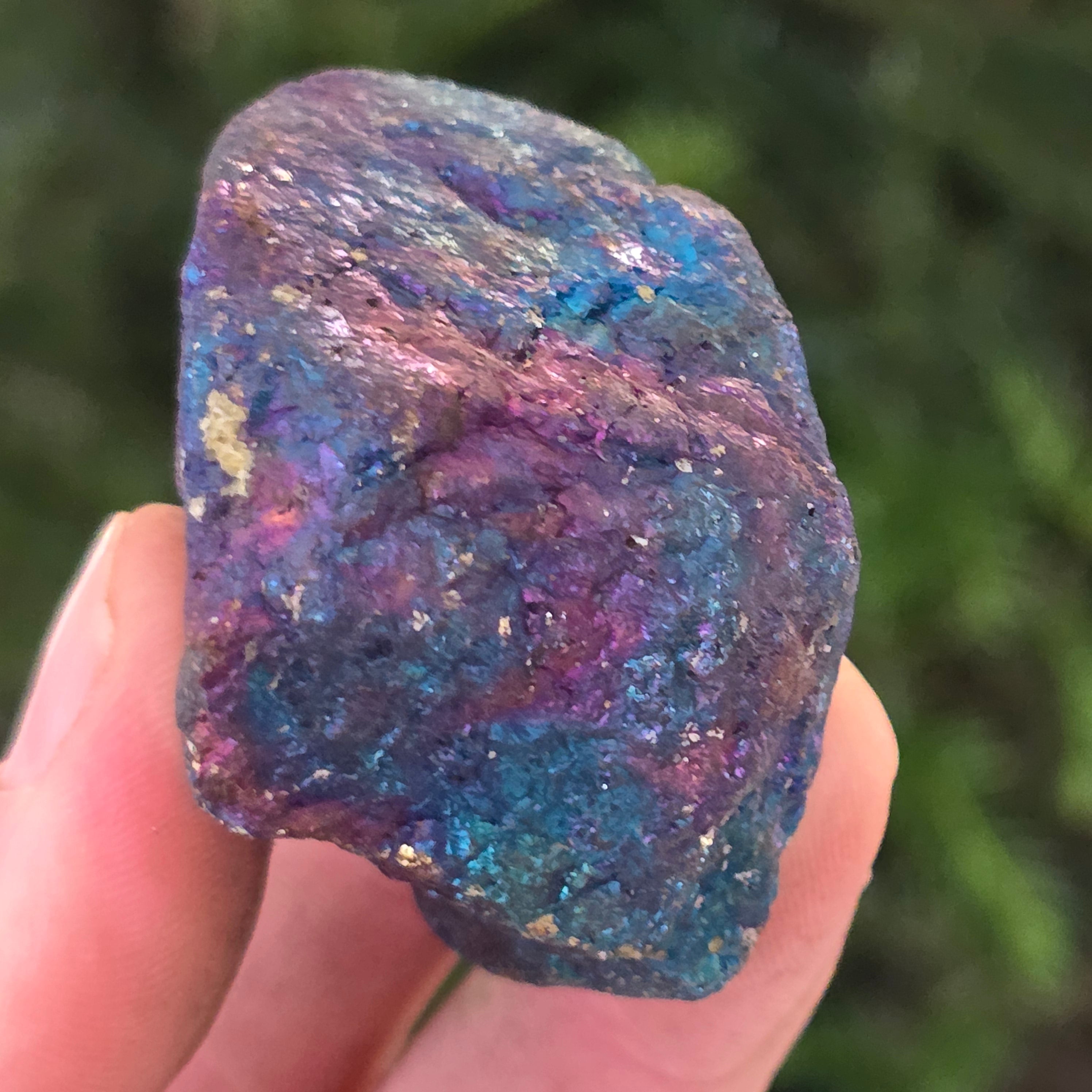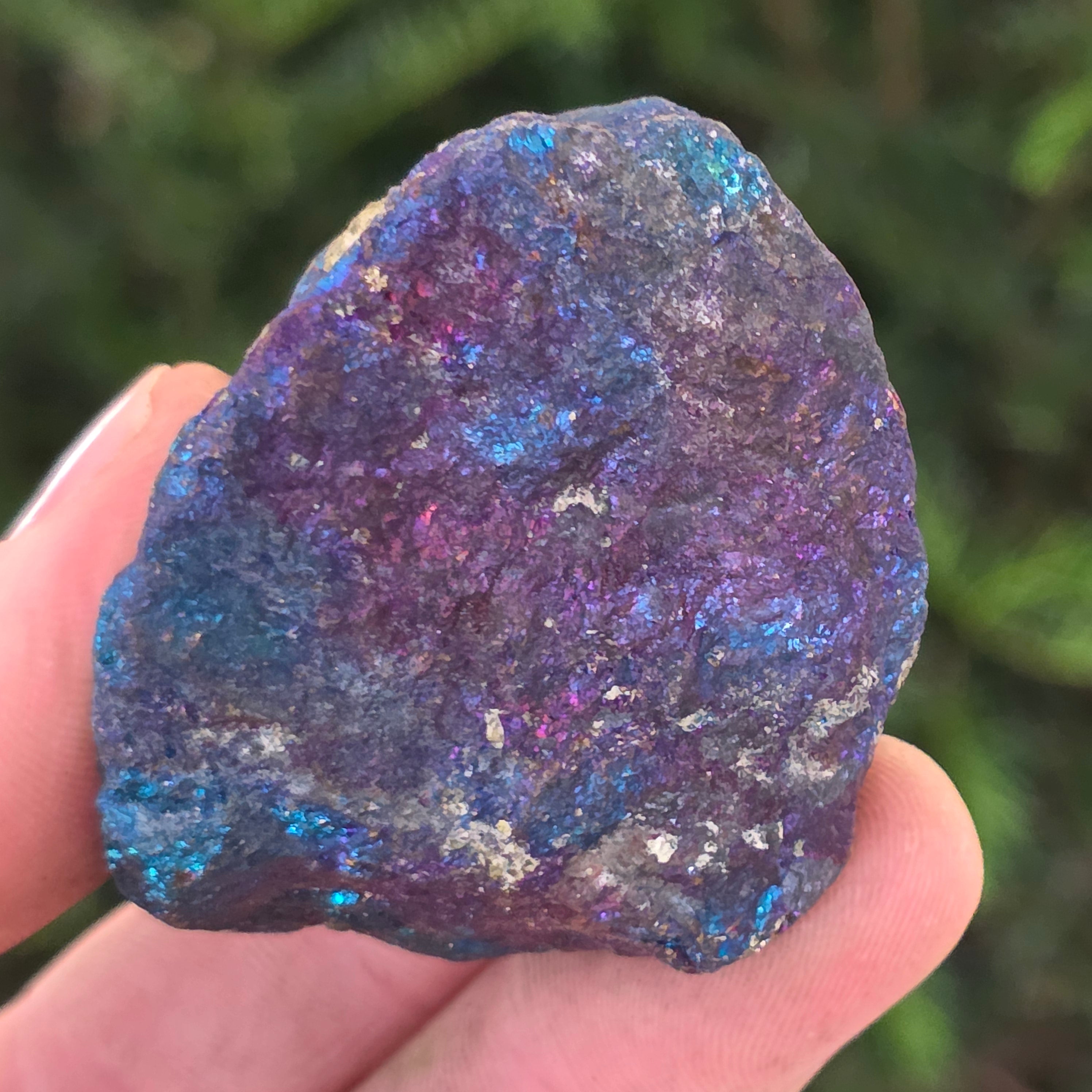 La calcopirita azul y morada se asocia con el crecimiento espiritual, la intuición y la conexión con energías superiores. Se cree que ayuda a calmar la mente y estimular la creatividad. Sus tonos iridiscentes se relacionan simbólicamente con el equilibrio y la armonía.