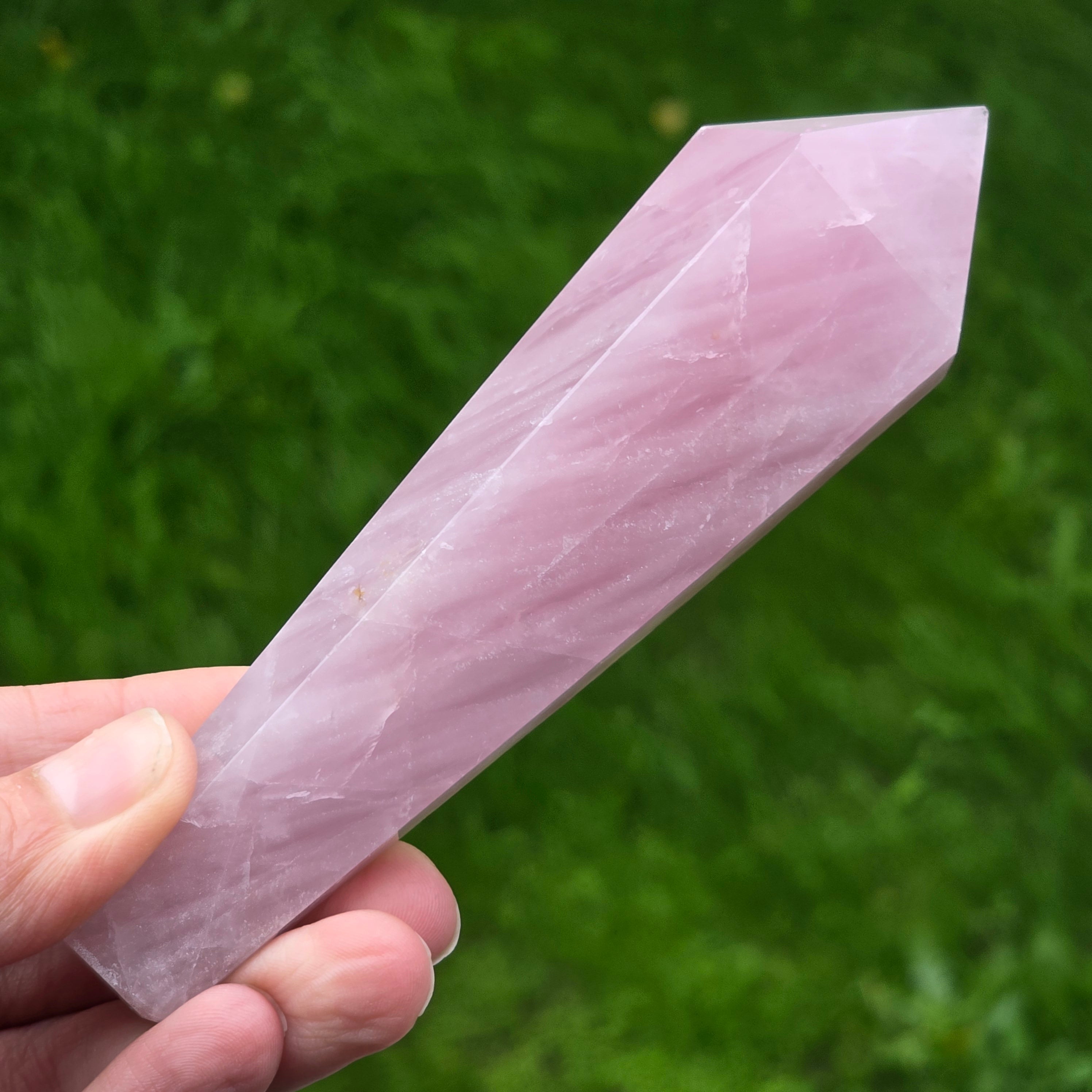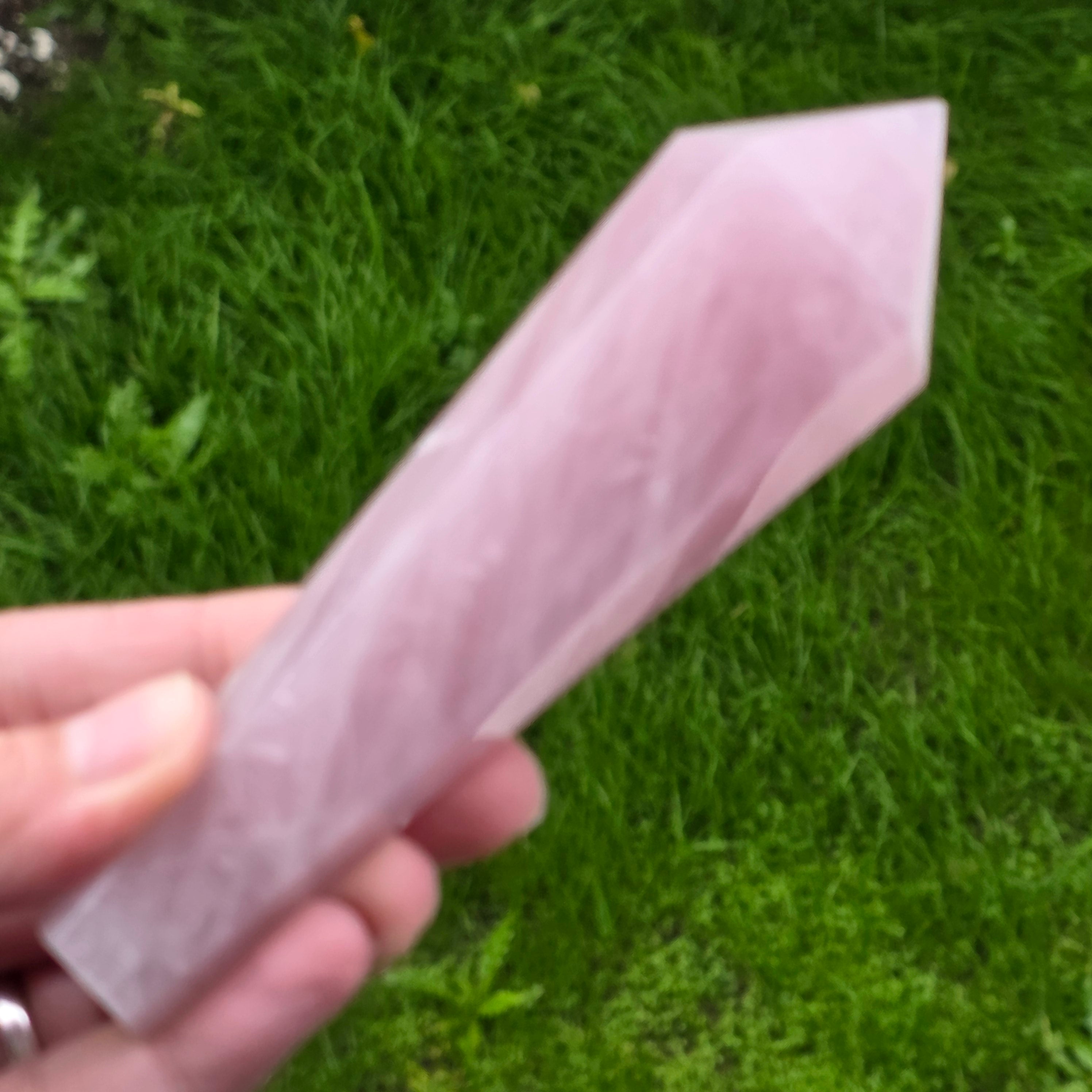 El cetro de cuarzo rosa es una herramienta utilizada especialmente en prácticas energéticas, masajes holísticos y meditación. Su forma alargada y su punta bien definida permiten intención de dirección, equilibrar el flujo de energía y foco de atención en áreas donde necesitas calma o claridad. A menudo se utiliza para masaje energético, siendo ideal para recorridos largos por los meridianos, para relajar los hombros, la espalda o las palmas. En meditación, se puede sostener en la mano para amplificar el estado de paz interior y conexión.