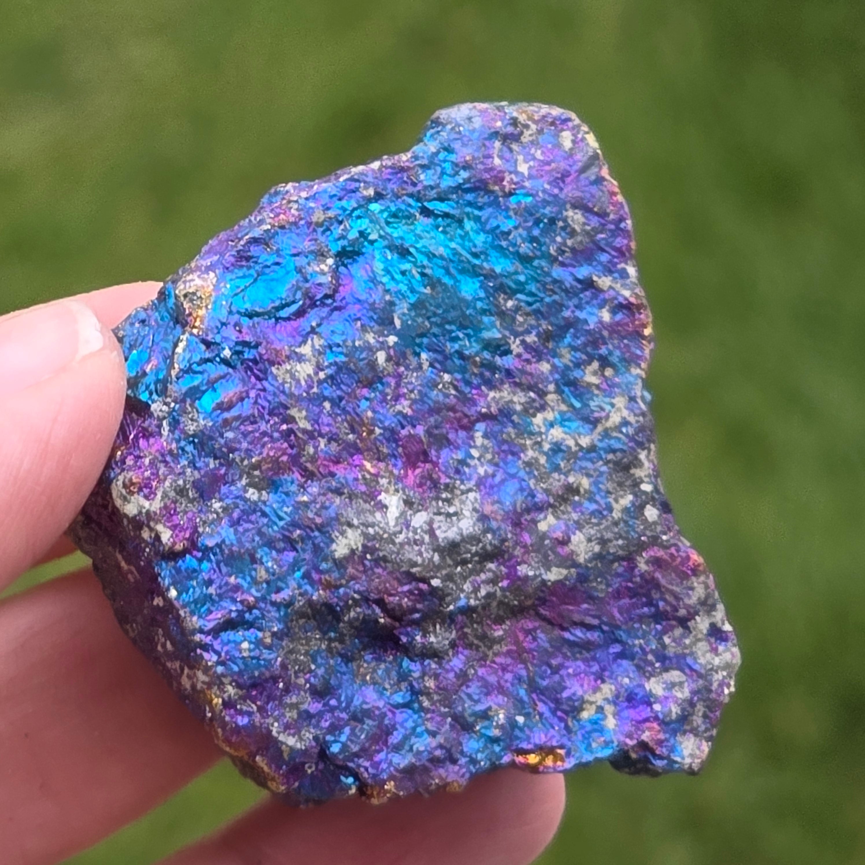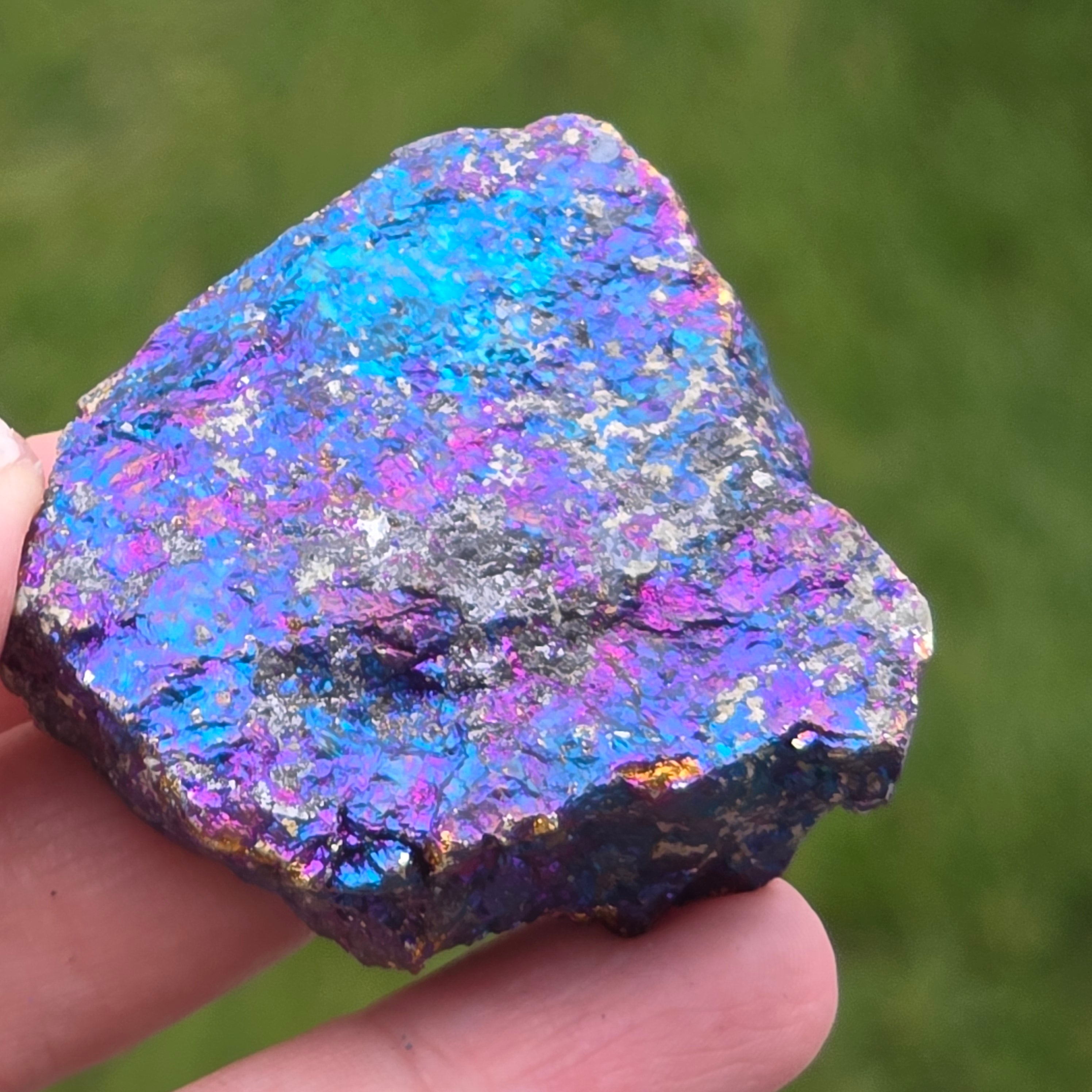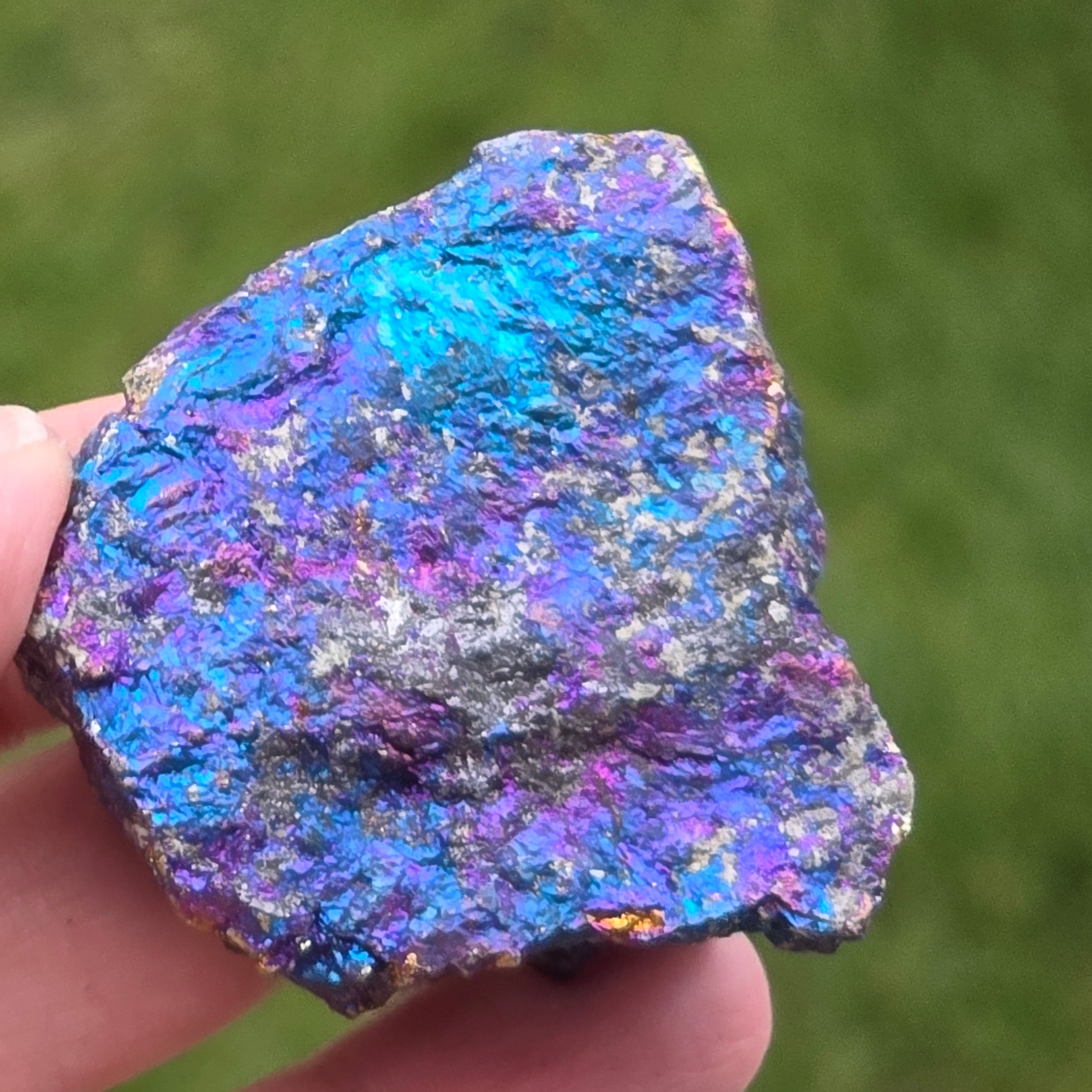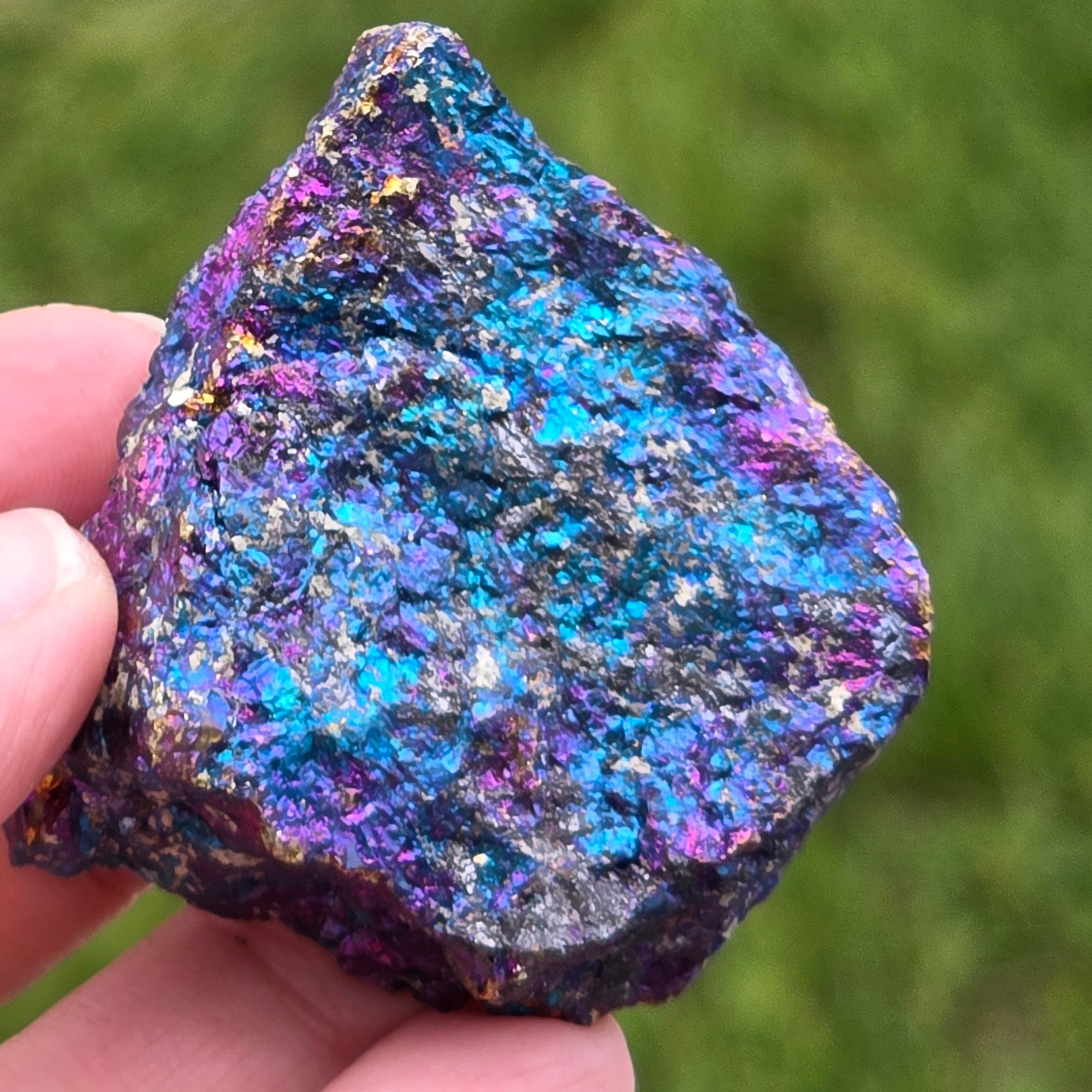 La chalcopyrita azul y la violeta se asocian con el crecimiento espiritual, la intuición y la conexión con energías superiores. Se cree que ayuda a calmar la mente y estimular la creatividad. Sus tonos iridiscentes se relacionan simbólicamente con el equilibrio y la armonía.