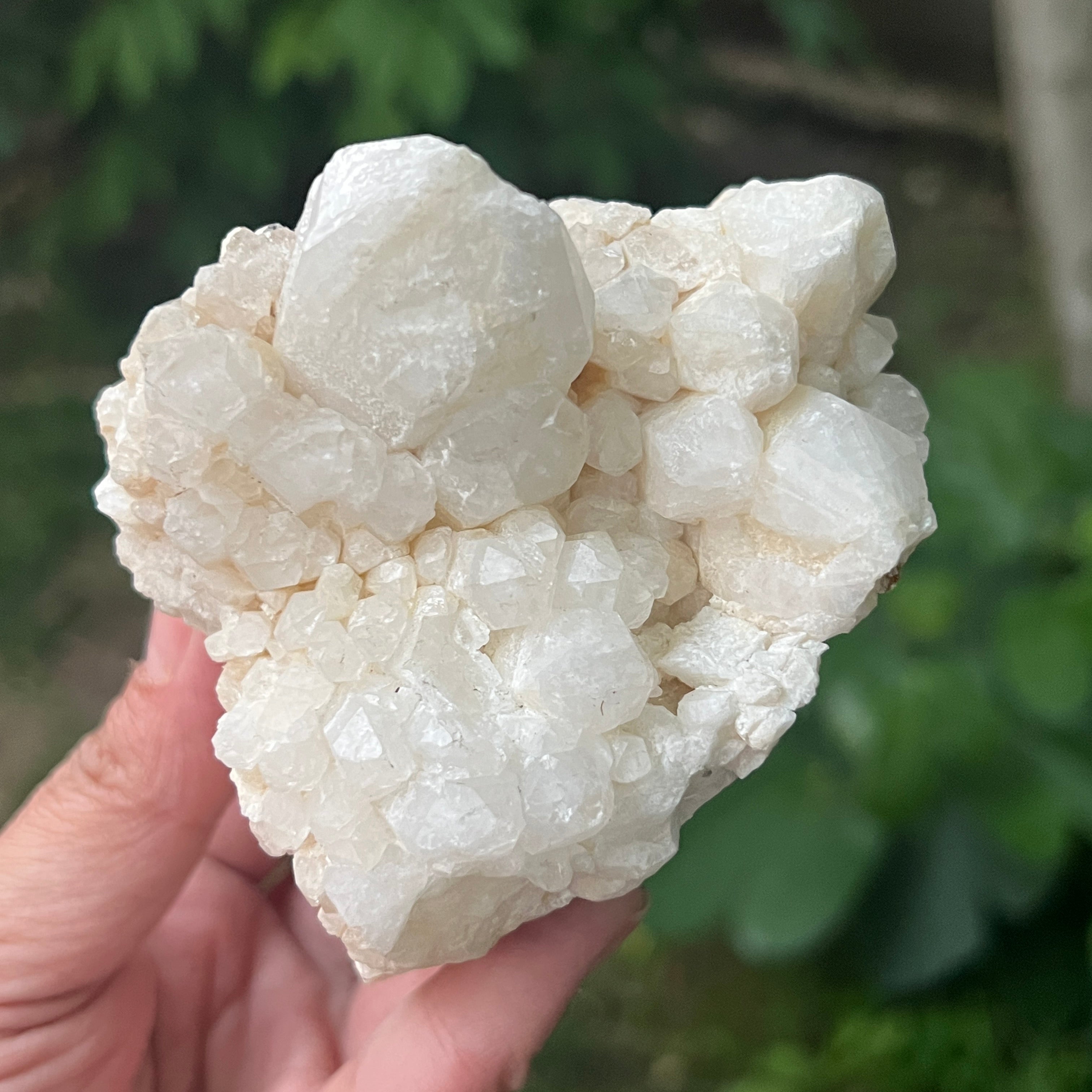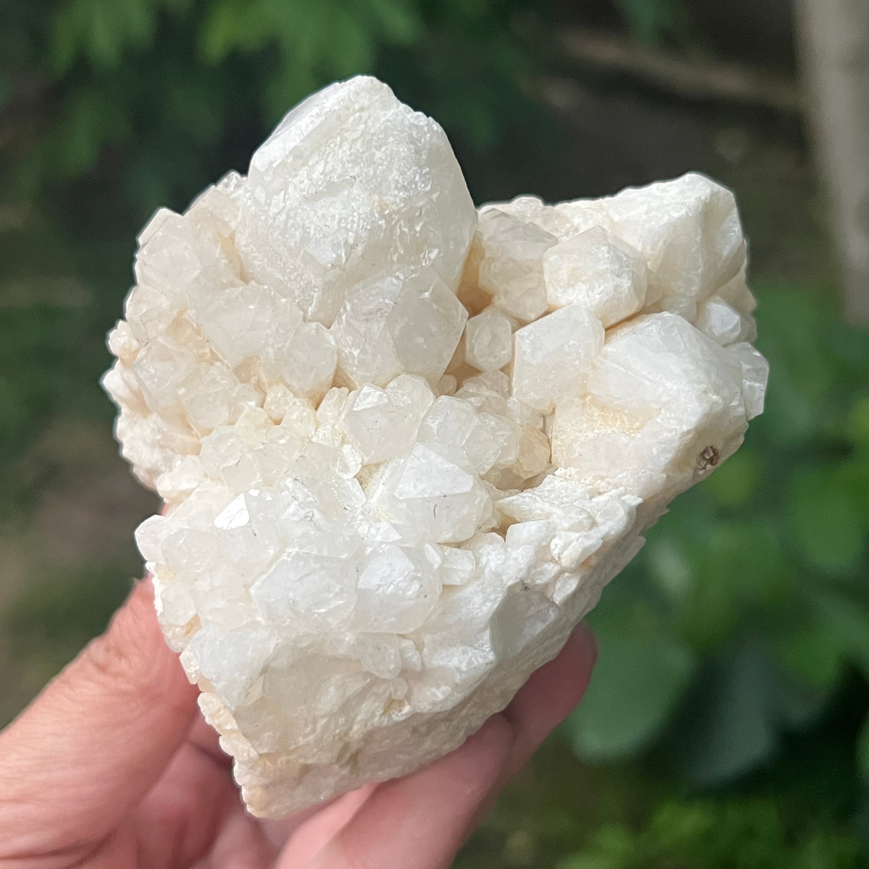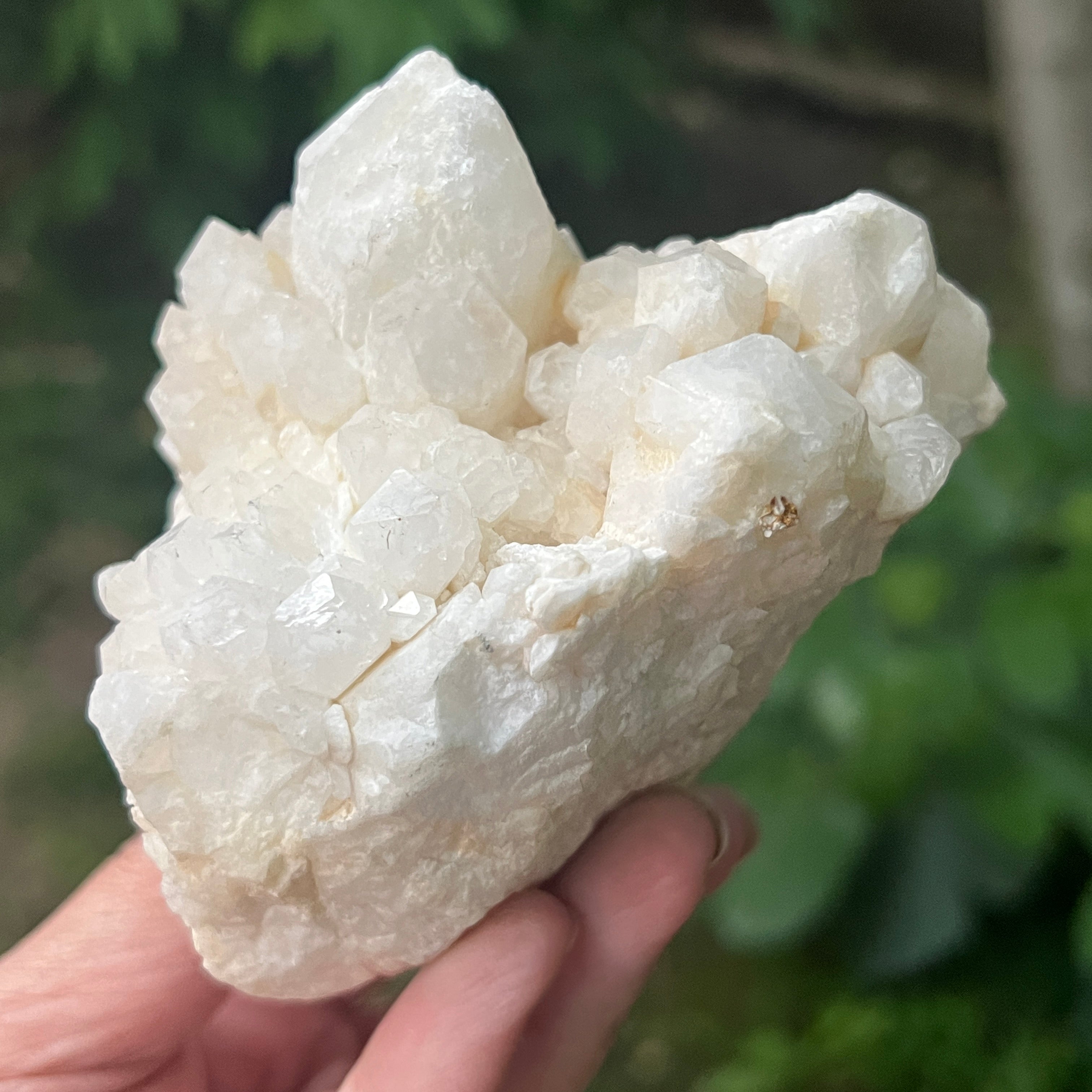 El fenómeno que da lugar a esta forma especial se llama epitaxia secundaria : un proceso en el que pequeños cristales de cuarzo se desarrollan sobre las caras de un cristal matriz, manteniendo la orientación cristalina pero formando una textura compacta, granular y radiante. El resultado es una superficie ricamente texturizada, con una estética orgánica y un sutil juego de luz dependiendo del ángulo desde el que se observe.
