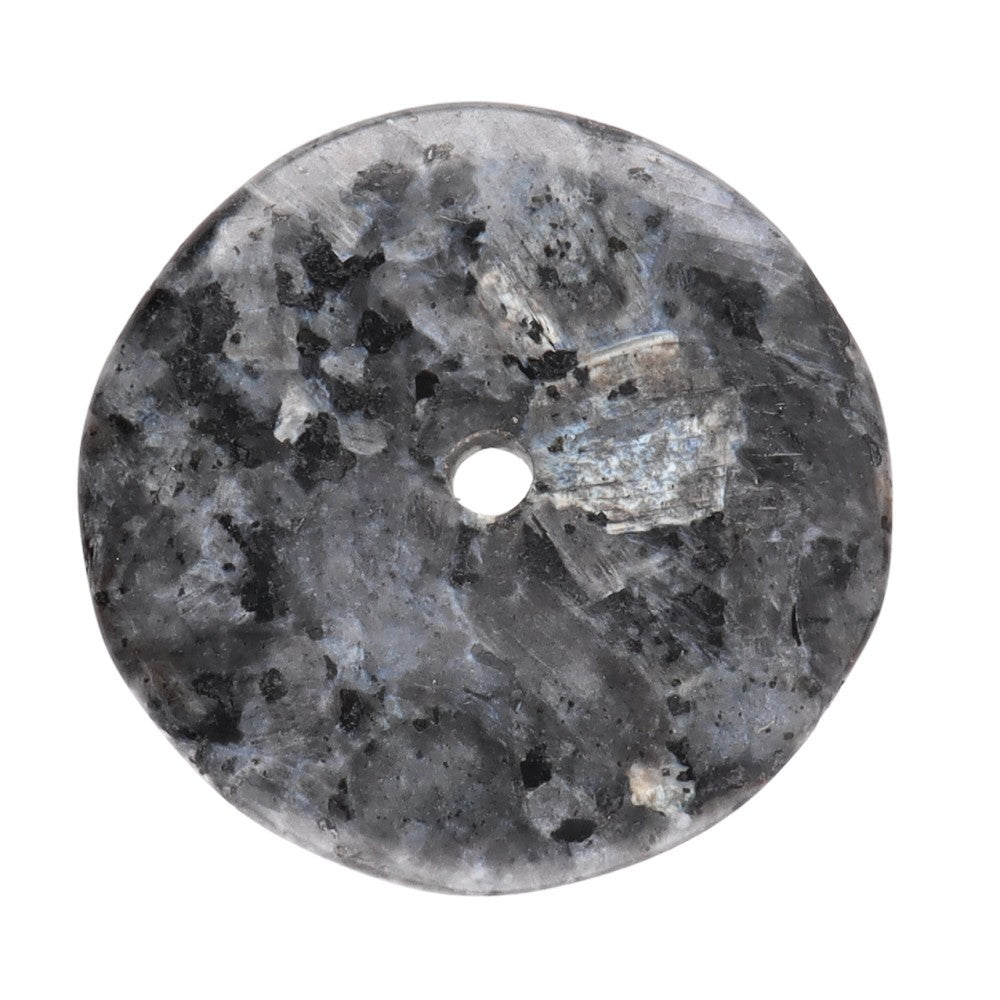 El colgante de piedra larvikita tipo donut L se destaca por sus reflejos plateados azulados, que recuerdan a la luz de la luna reflejada en el agua.