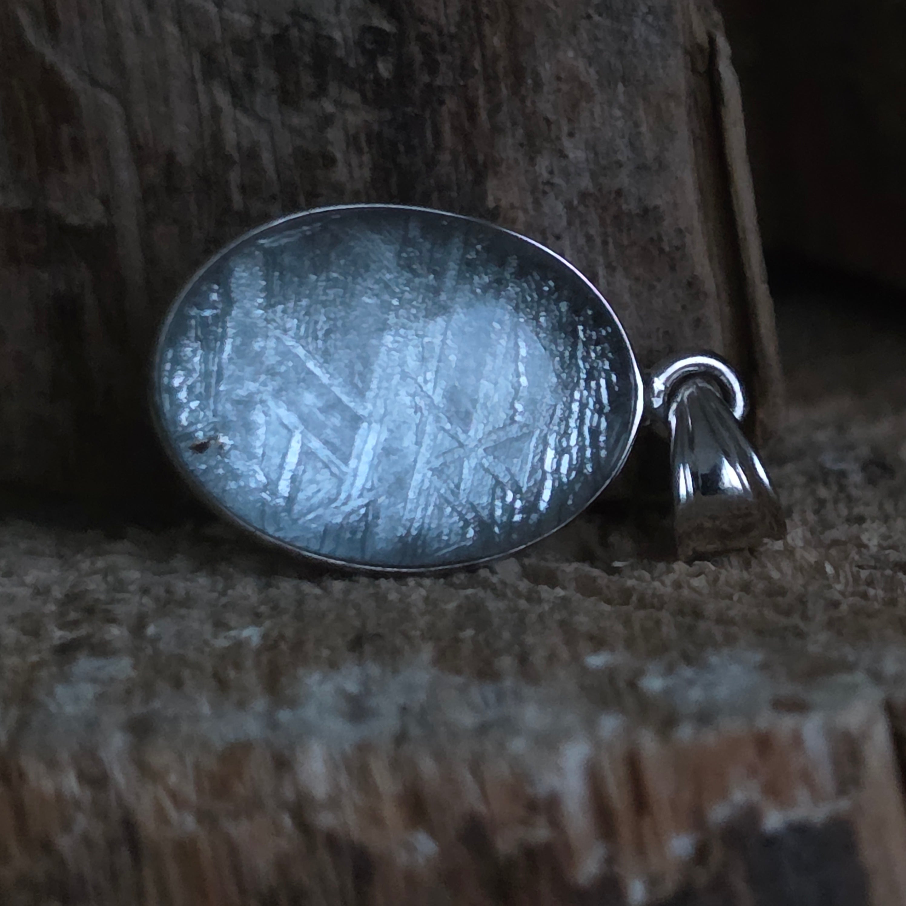 - Materiales: Meteorito natural Muonionalusta, montura de plata o metal.
