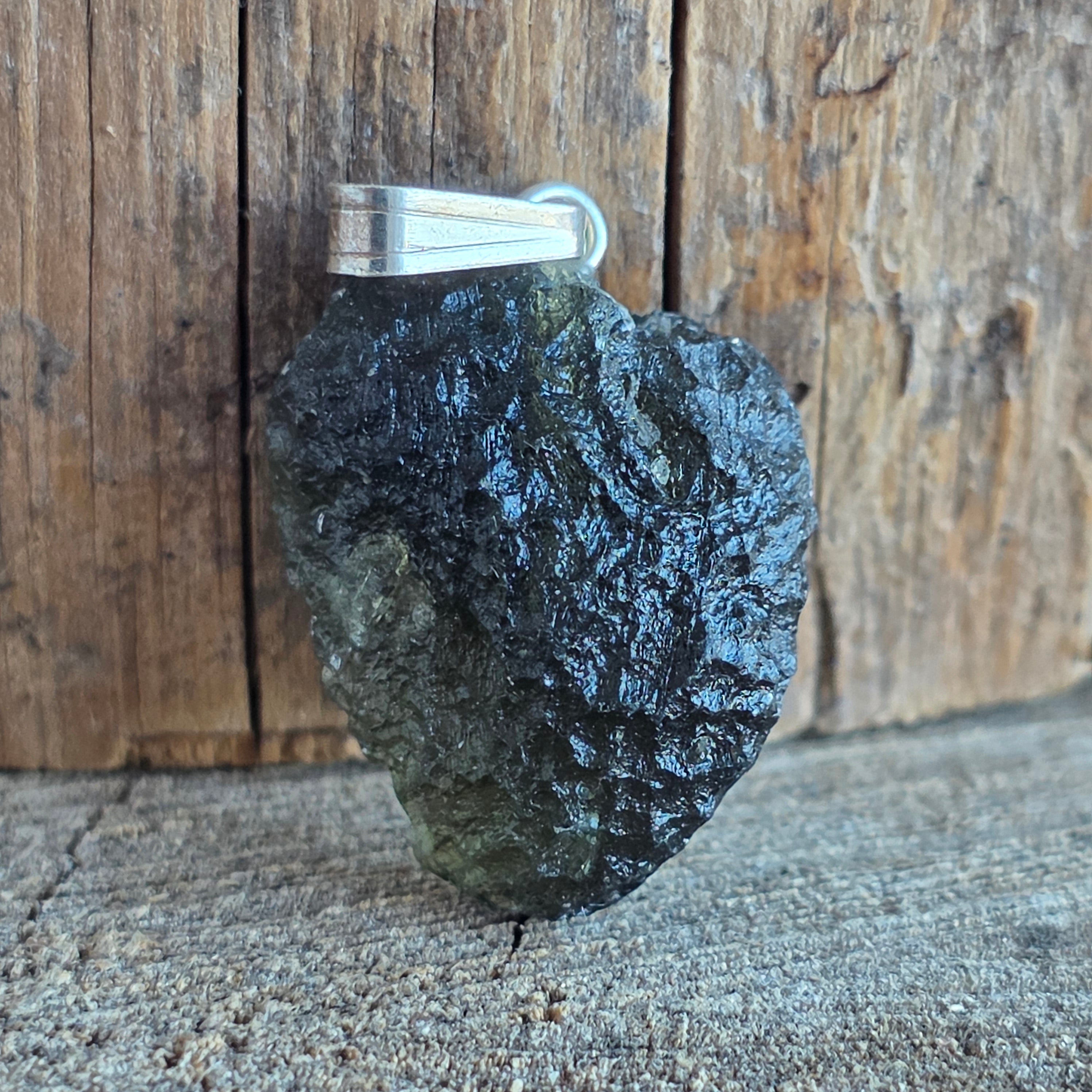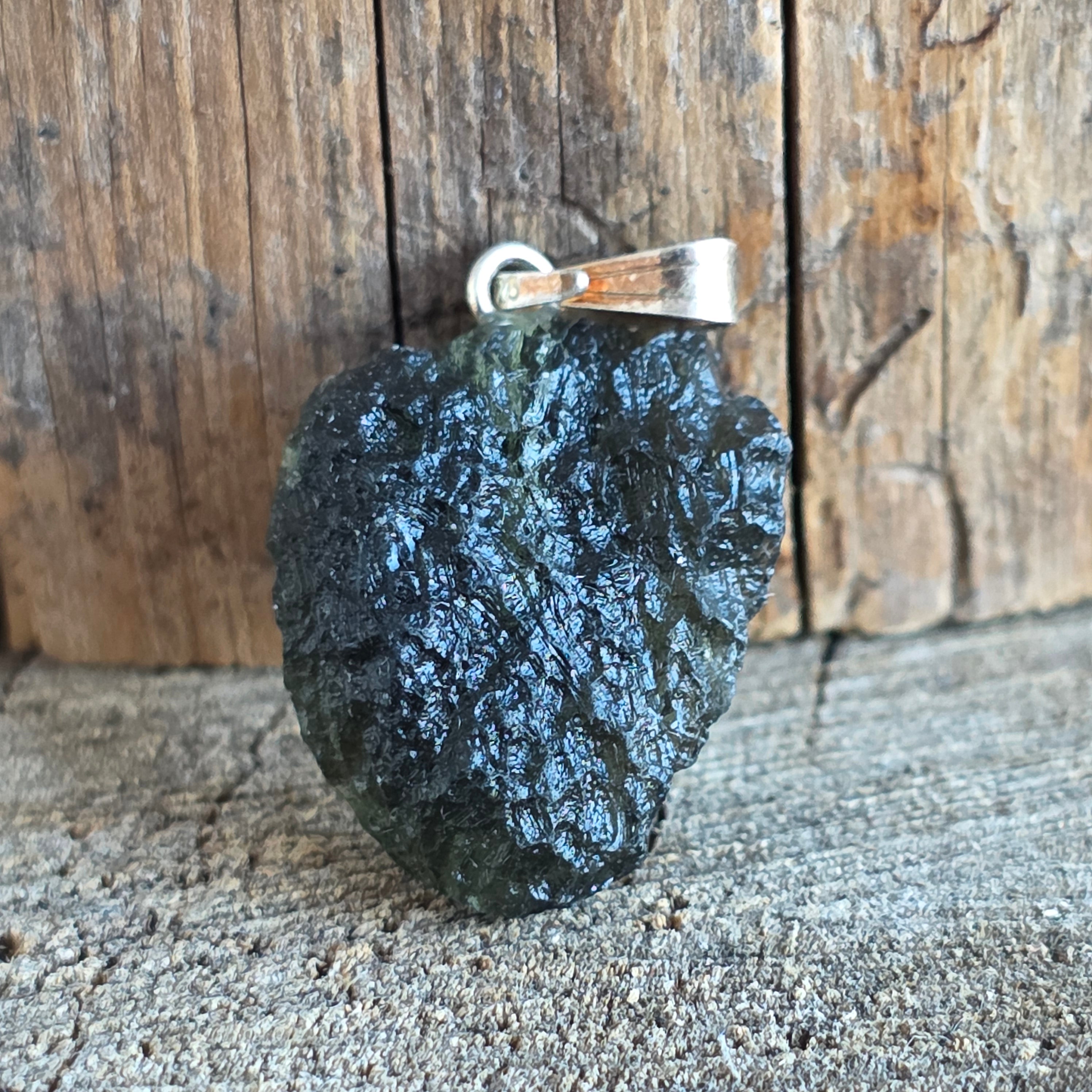 Un colgante raro y auténtico con moldavita cruda, minimalista montado en plata 925 para resaltar su forma natural.