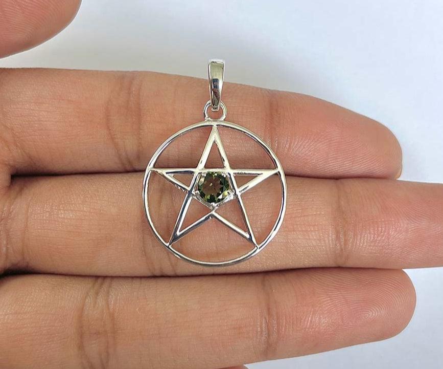 Este colgante especial, realizado en plata 925 y adornado con una moldavita natural facetadaestá enmarcado en un diseño de pentagrama, símbolo de equilibrio y protección. La piedra de moldavita, con sus inconfundibles reflejos verdes, añade un toque de misterio y poder a este talismán de profundo significado.