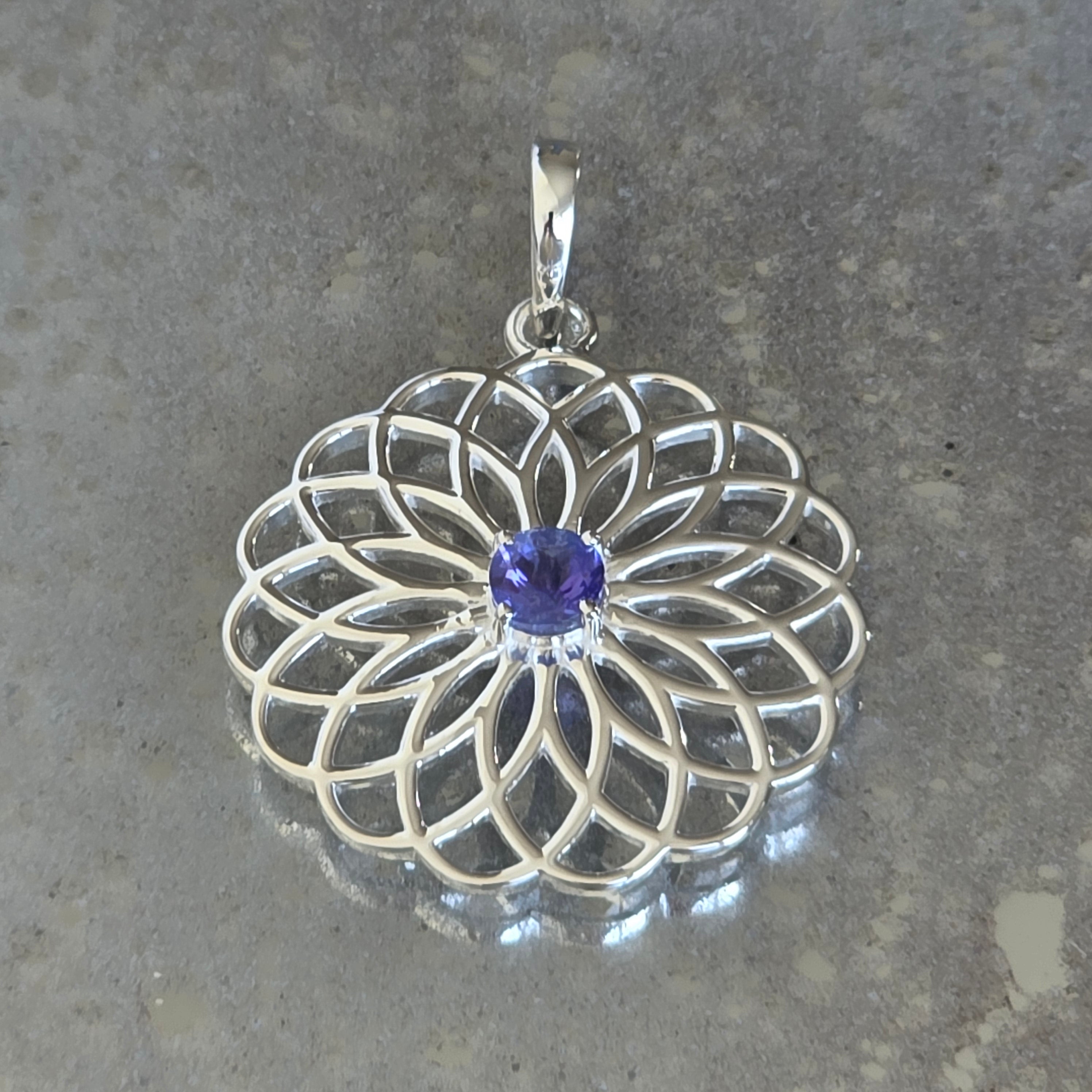 El colgante "Flower of Life" con tanzanita es una joya con un simbolismo profundo, en la que la geometría sagrada se encuentra con la elegancia sutil de una piedra rara.