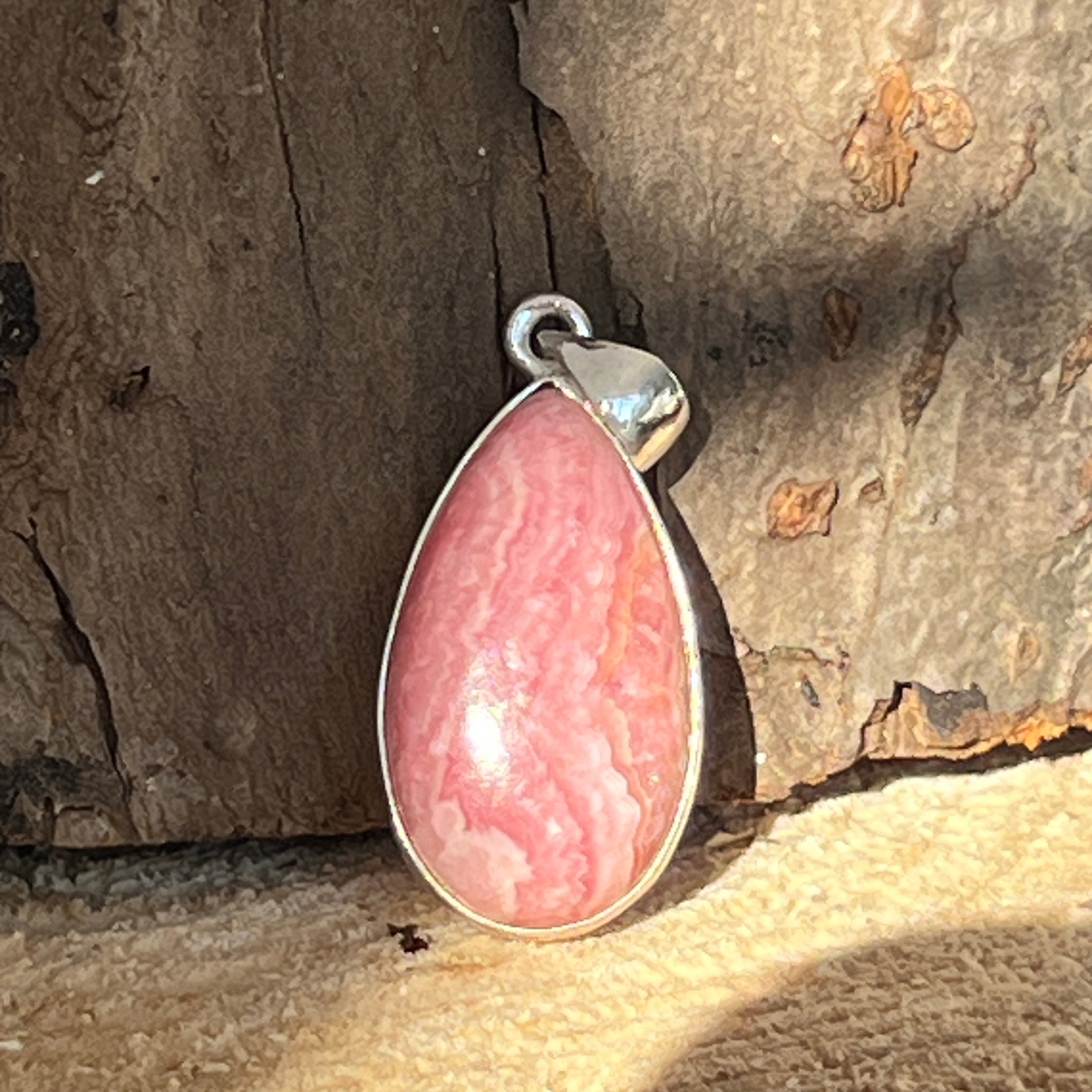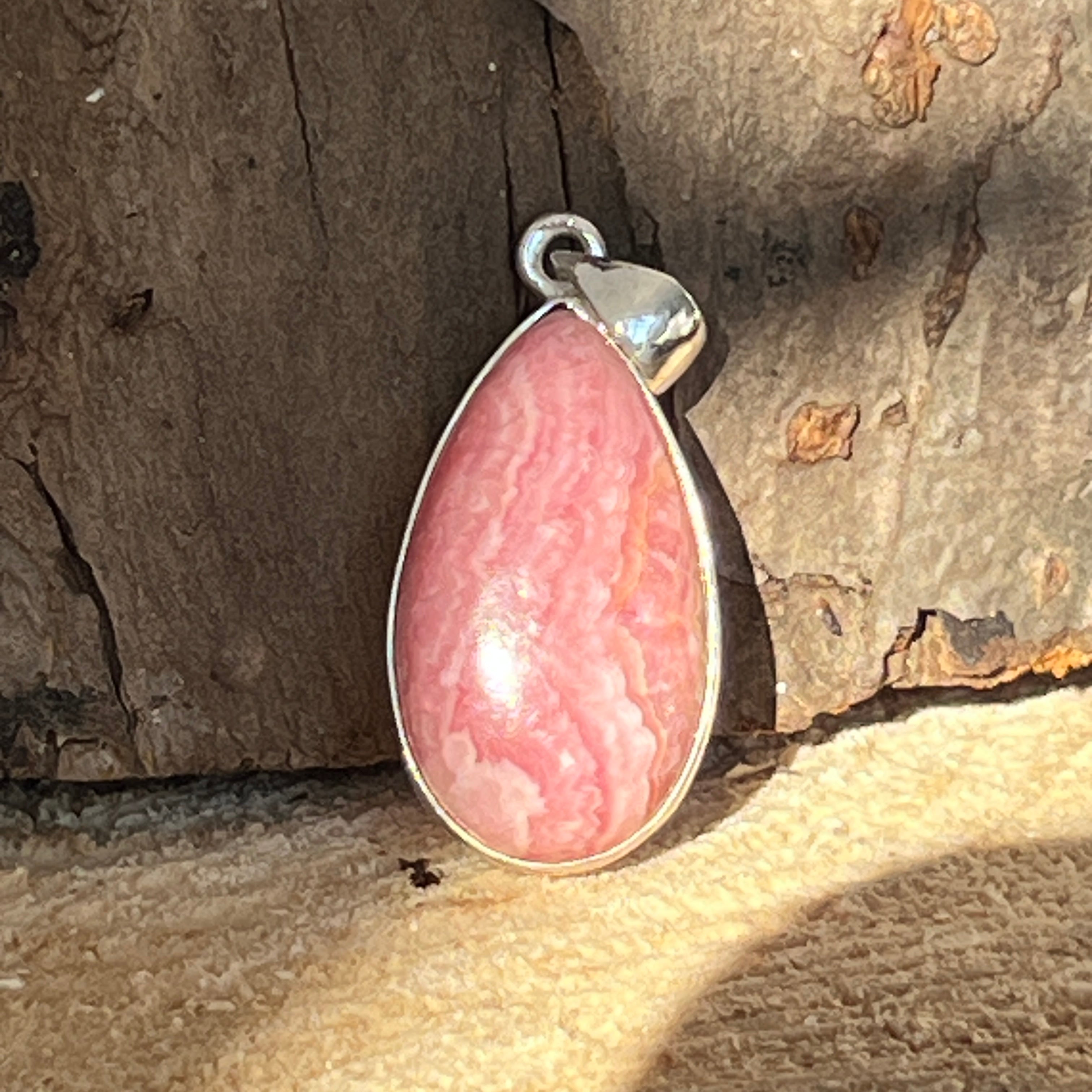 Este colgante con rodocrosita natural en forma de gota, montado en plata 925, es una joya refinada y única gracias a los juegos de color y estrías de la piedra. Cada pieza es diferente, reflejando la belleza auténtica de la naturaleza.