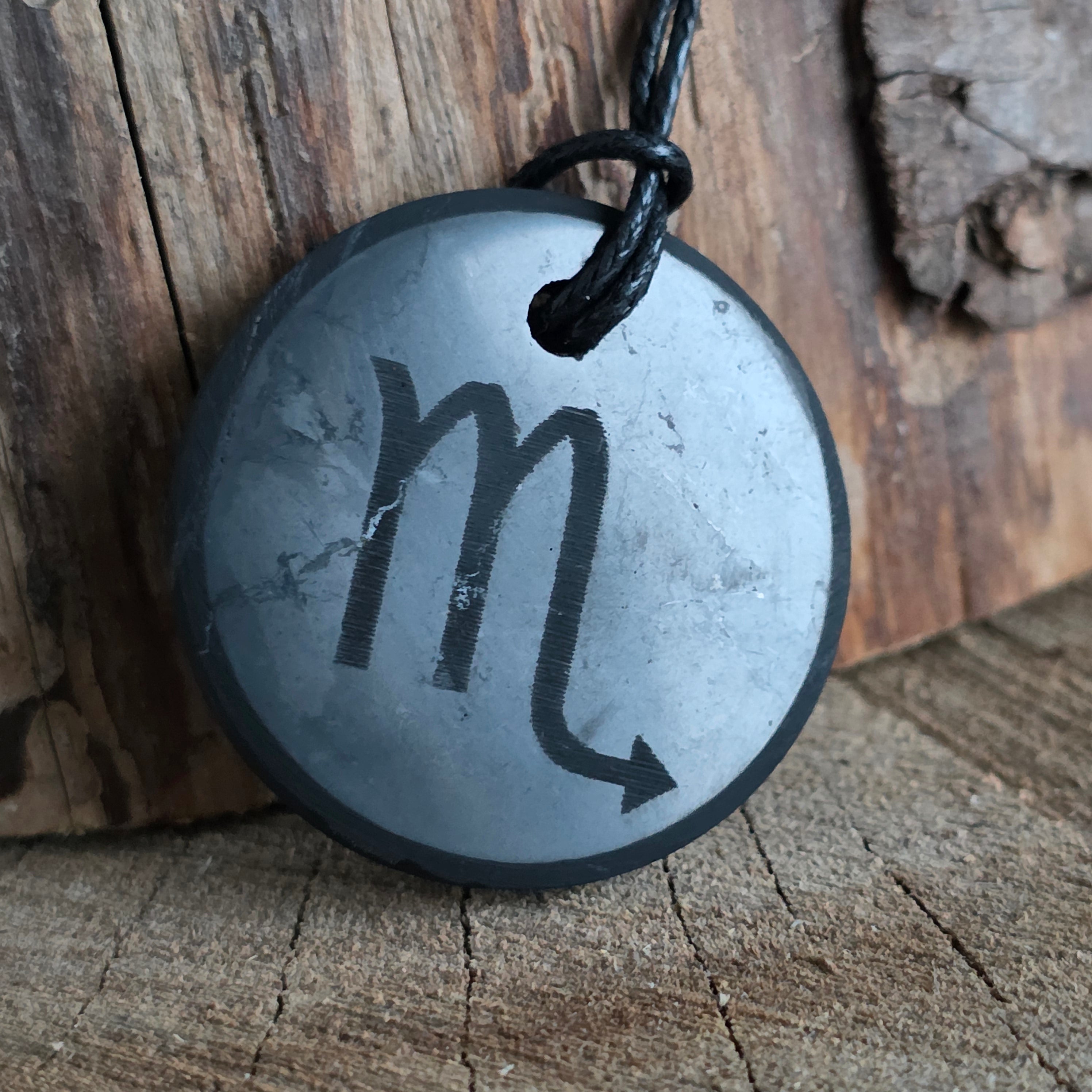 - Forma del colgante: redonda, grabada con el símbolo astrológico de Escorpio en ambos lados