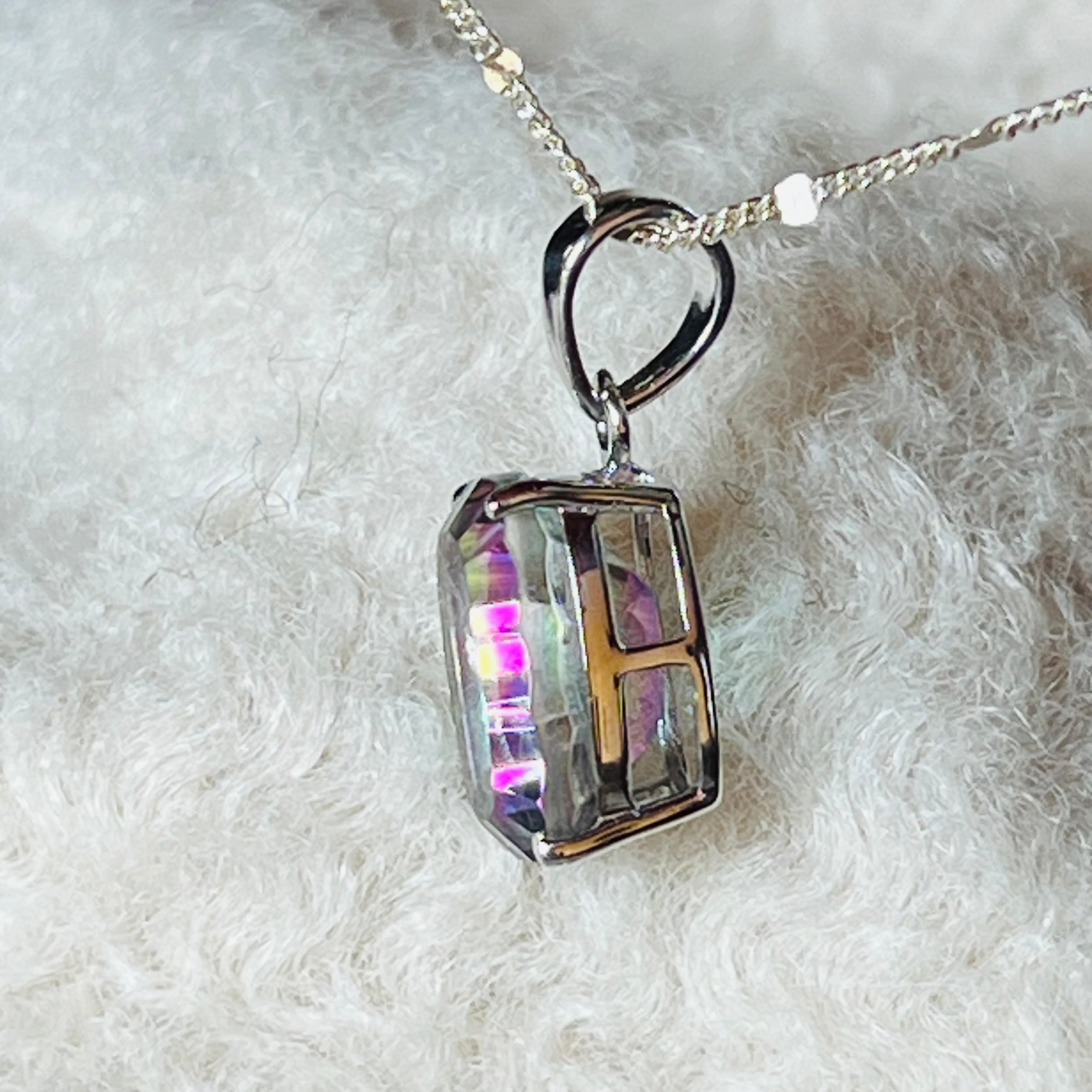 El Topacio Místico se destaca por sus matices iridiscentes, que pueden variar desde el verde, azul y violeta hasta el rojo y el amarillo. Esta variedad de colores se obtiene mediante un tratamiento especial con vapores metálicos, que crea una capa fina en la superficie del topacio.