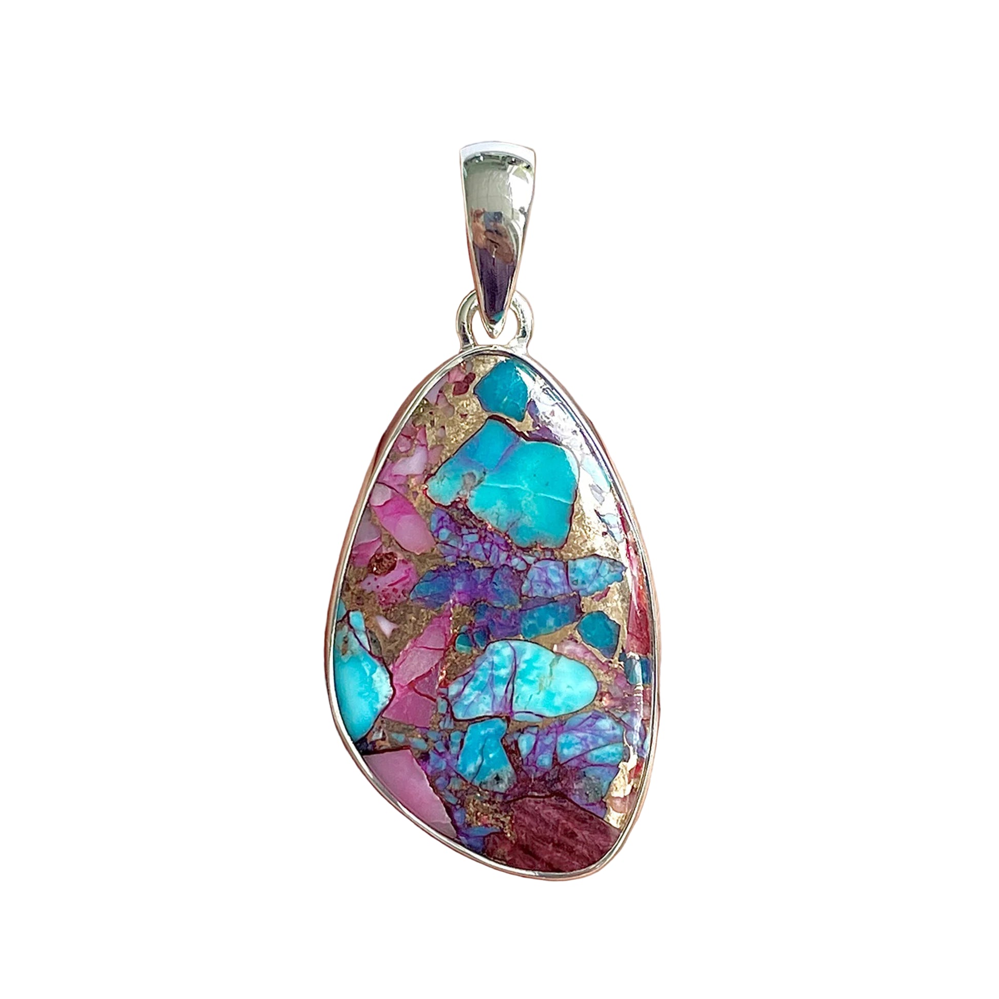 Este colgante único reúne dos tesoros de la naturaleza – Ostra espinosa y Turquesa – en un mosaico de colores espectacular. Los tonos violetas, rosas y naranjas de la concha se entrelazan con el azul intenso de la turquesa, creando una joya llena de vida que recuerda al encuentro entre el mar y el atardecer.