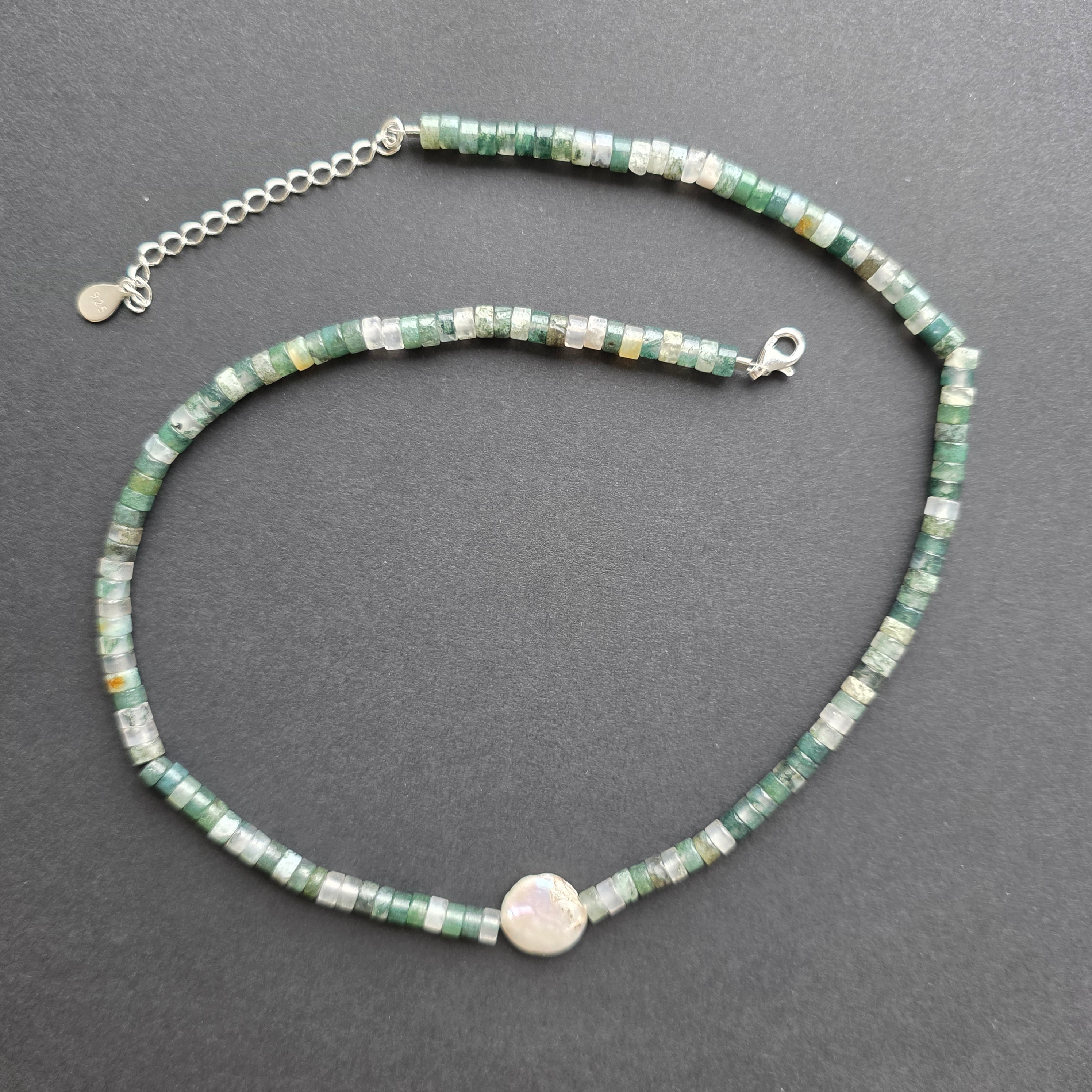 Materiales: aventurina verde natural, cuentas tumble 6 × 4 mm, esferas facetadas 2 mm, perla natural 2 cm, plata 925