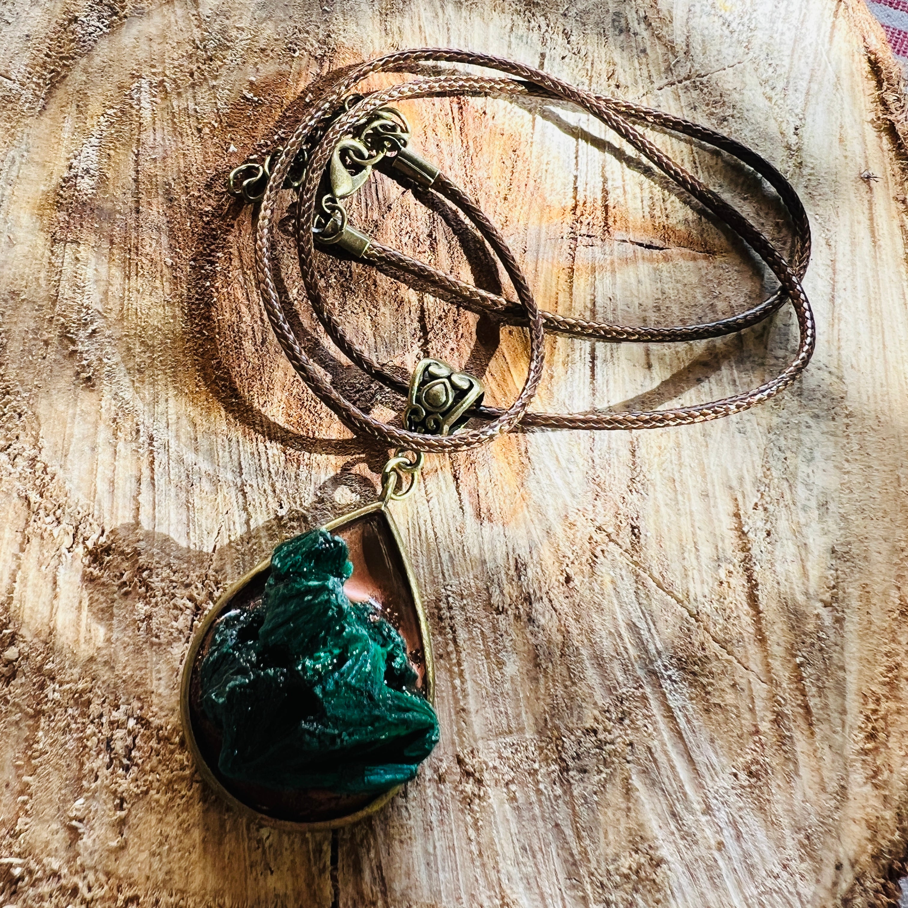 Colgante con malaquita sedosa en bruto y latón: la piedra de la transformación y del corazón valiente