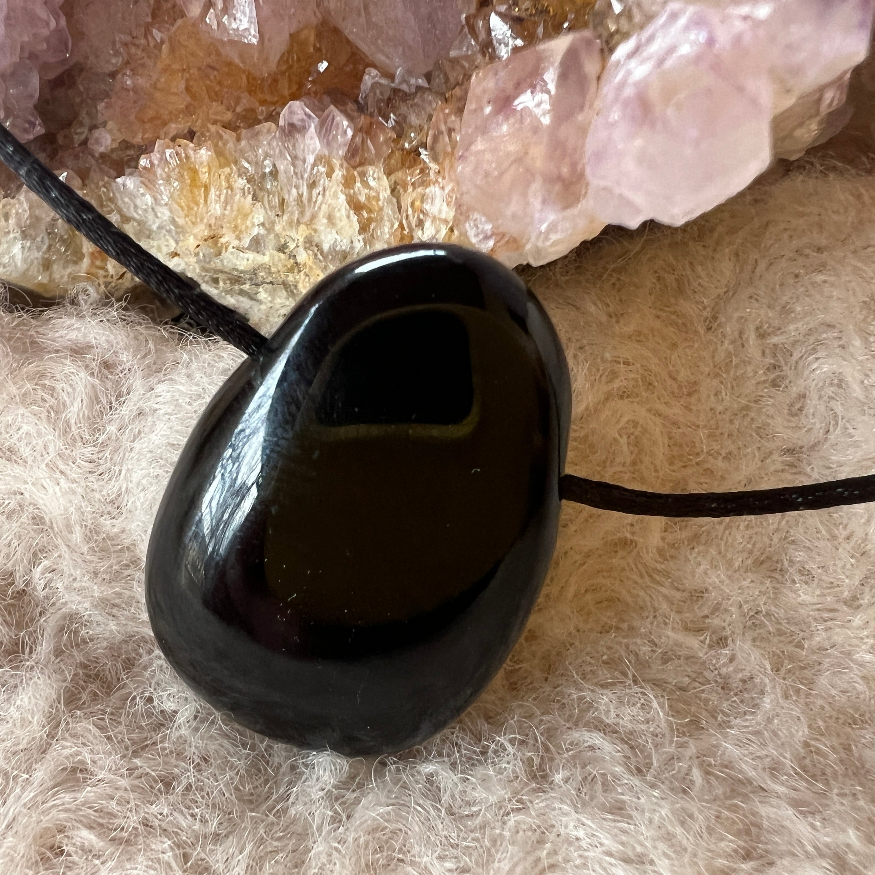 Este collar con colgante de ónix negro natural, pulido con forma de lágrima, destaca por su elegancia sobria y refinada. Su tono intenso de negro, con un brillo discreto, le confiere al colgante un aire clásico y atemporal.