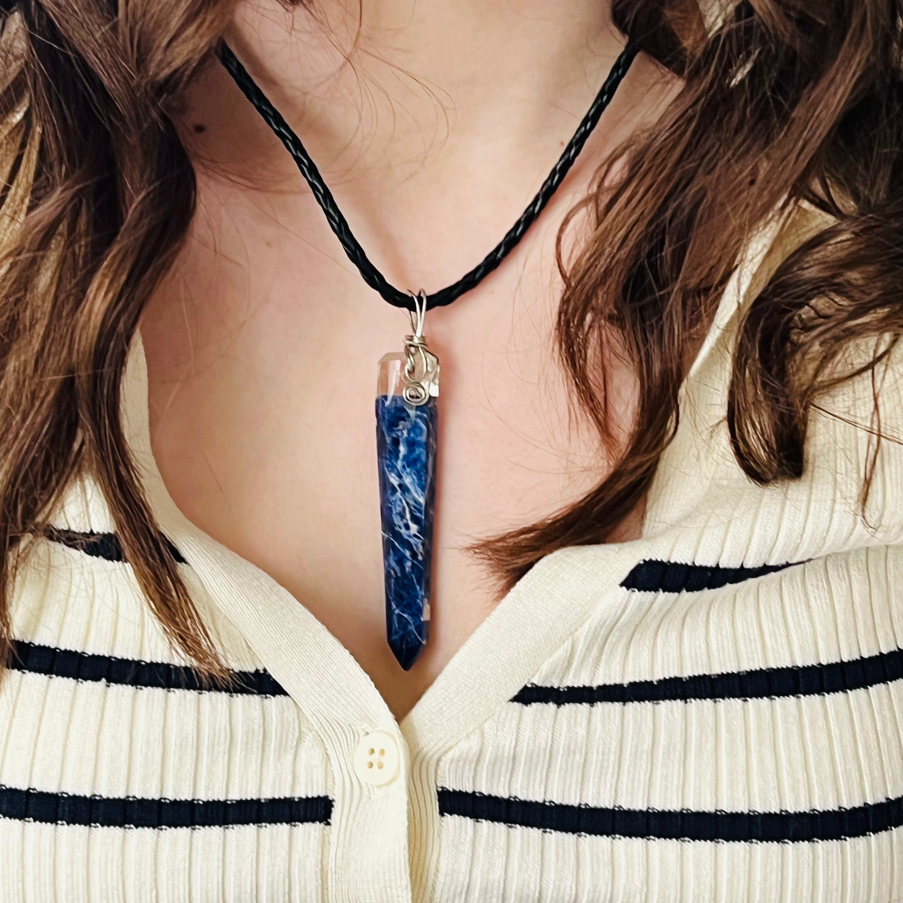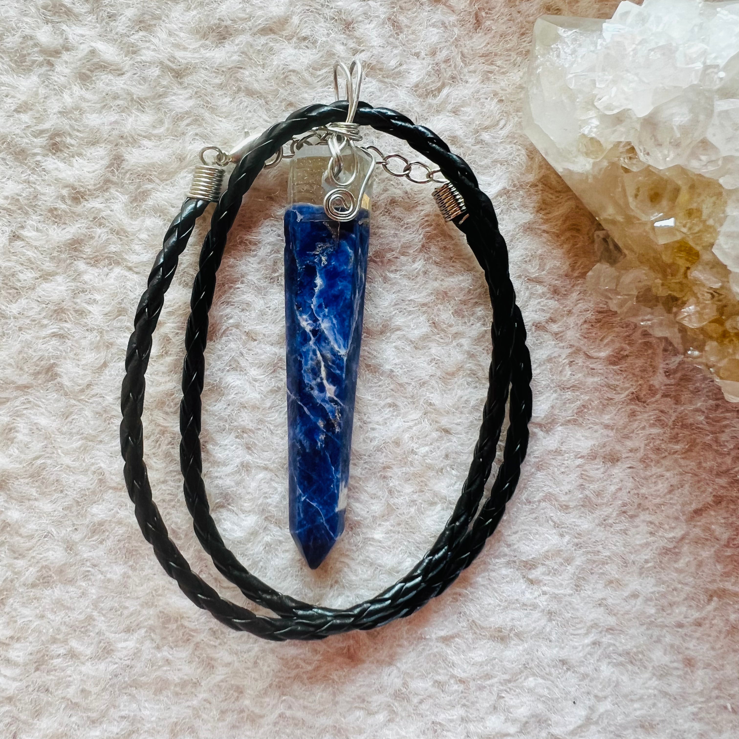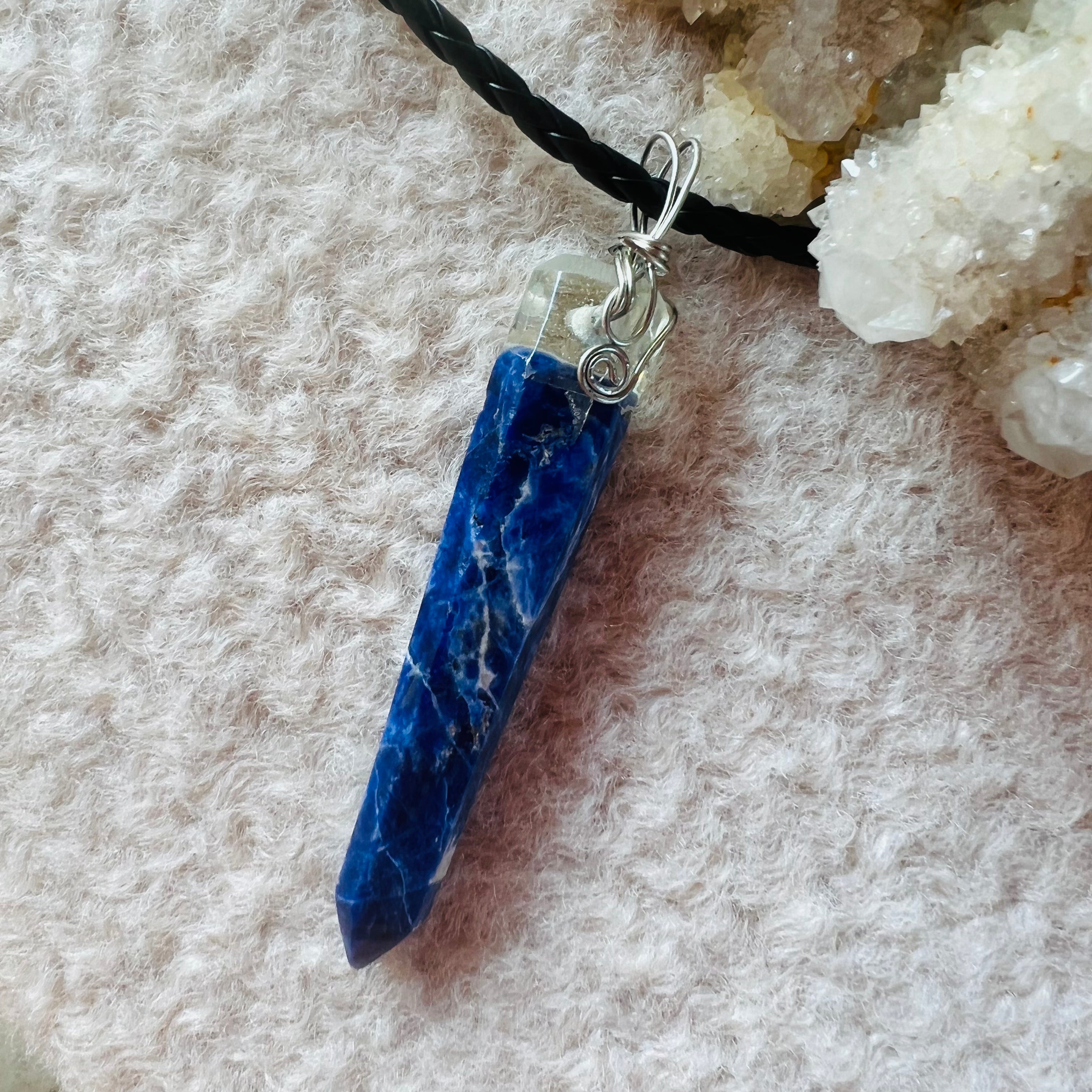 Collar con colgante de sodalita, alambre de plata, cordón negro trenzado, hecho a mano.