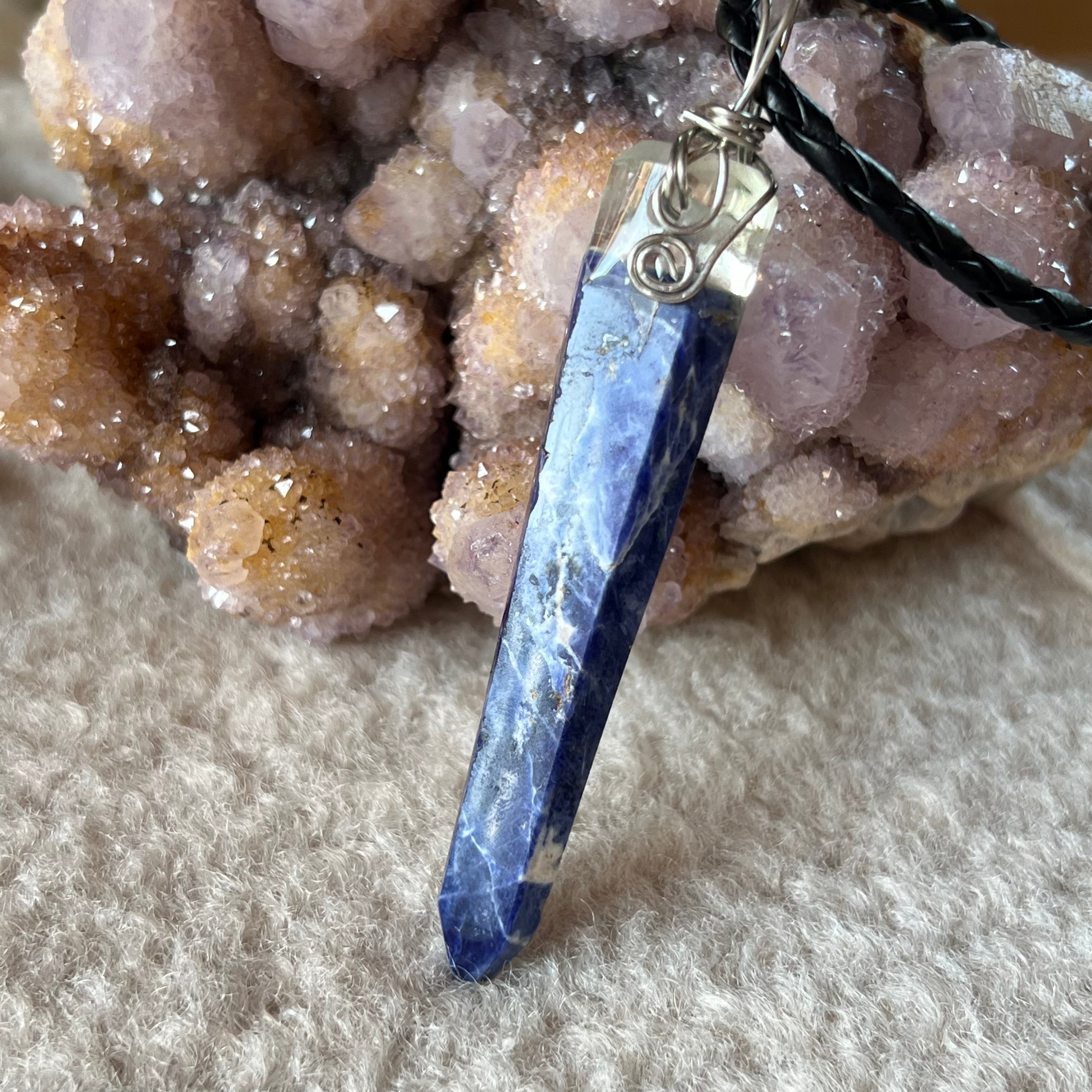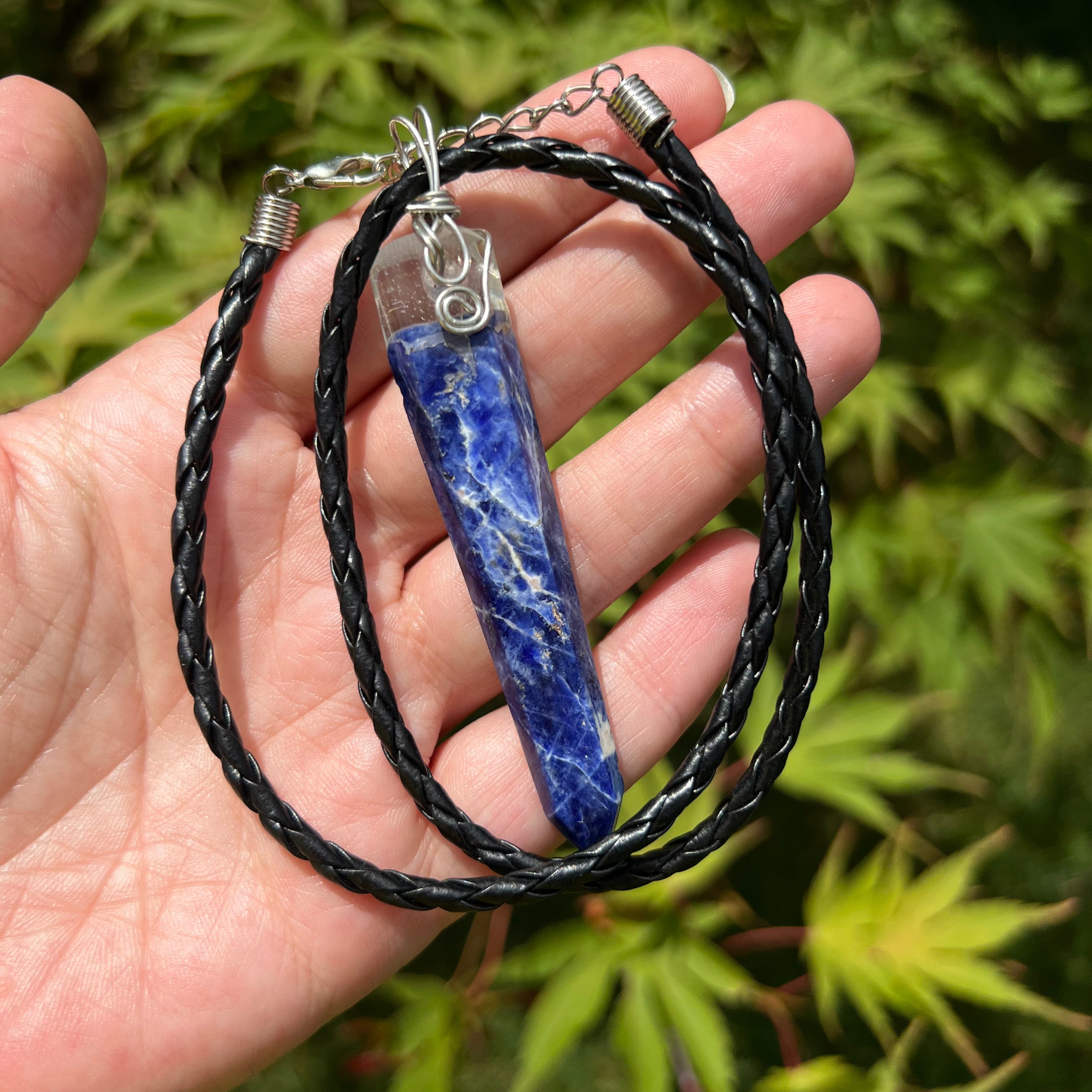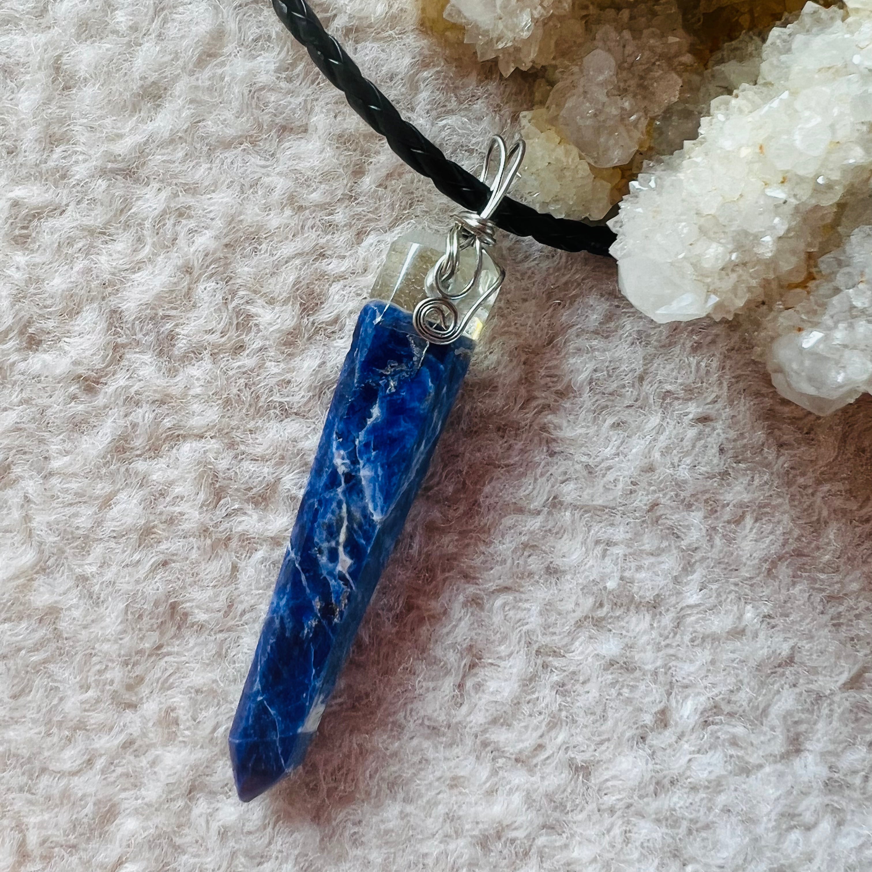 Collar con colgante de sodalita, alambre de plata, cordón negro trenzado, hecho a mano.