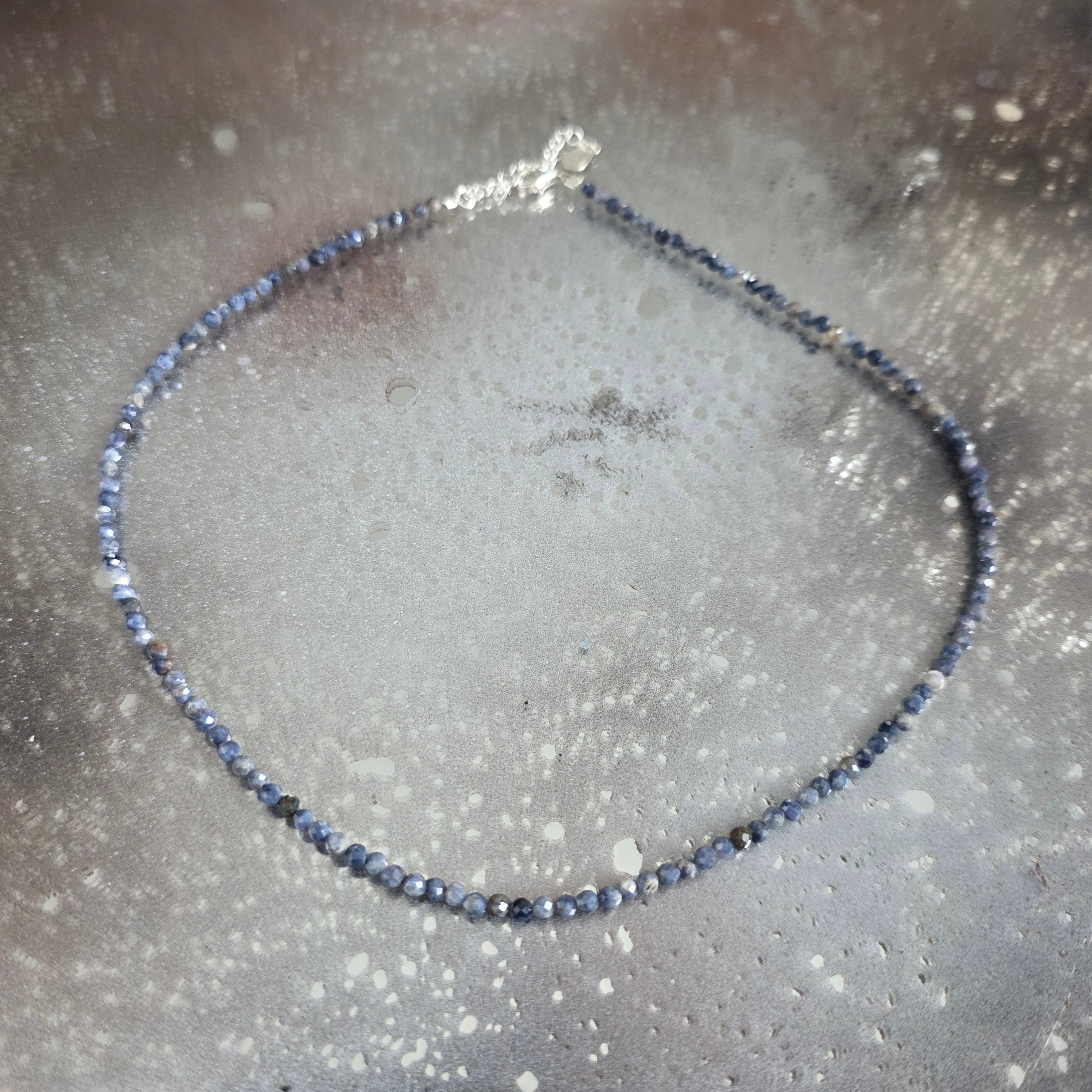 Un collar de una elegancia silenciosa, creado con zafiro natural facetado de 3 mm, cuyos tonos profundos de azul mantienen el misterio de las noches despejadas y la tranquilidad interior.
