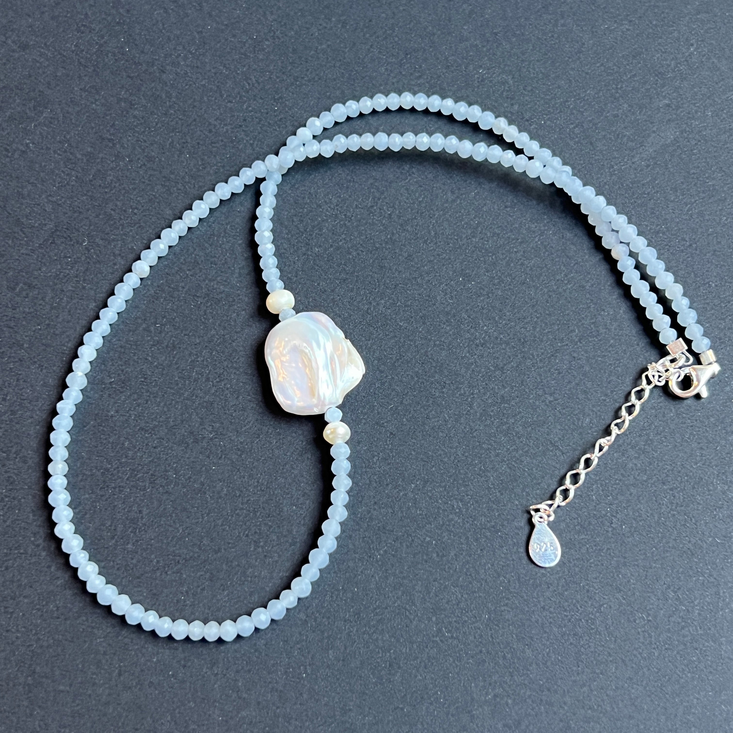 Un collar como un susurro venido del cielo: delicado, etéreo y profundamente calmante. Los discos facetados de angelita de 3,5 mm, finos como un polvo de luz azul, se disponen en un hilo de claridad y paz, como una respiración tranquila en medio de la agitación.