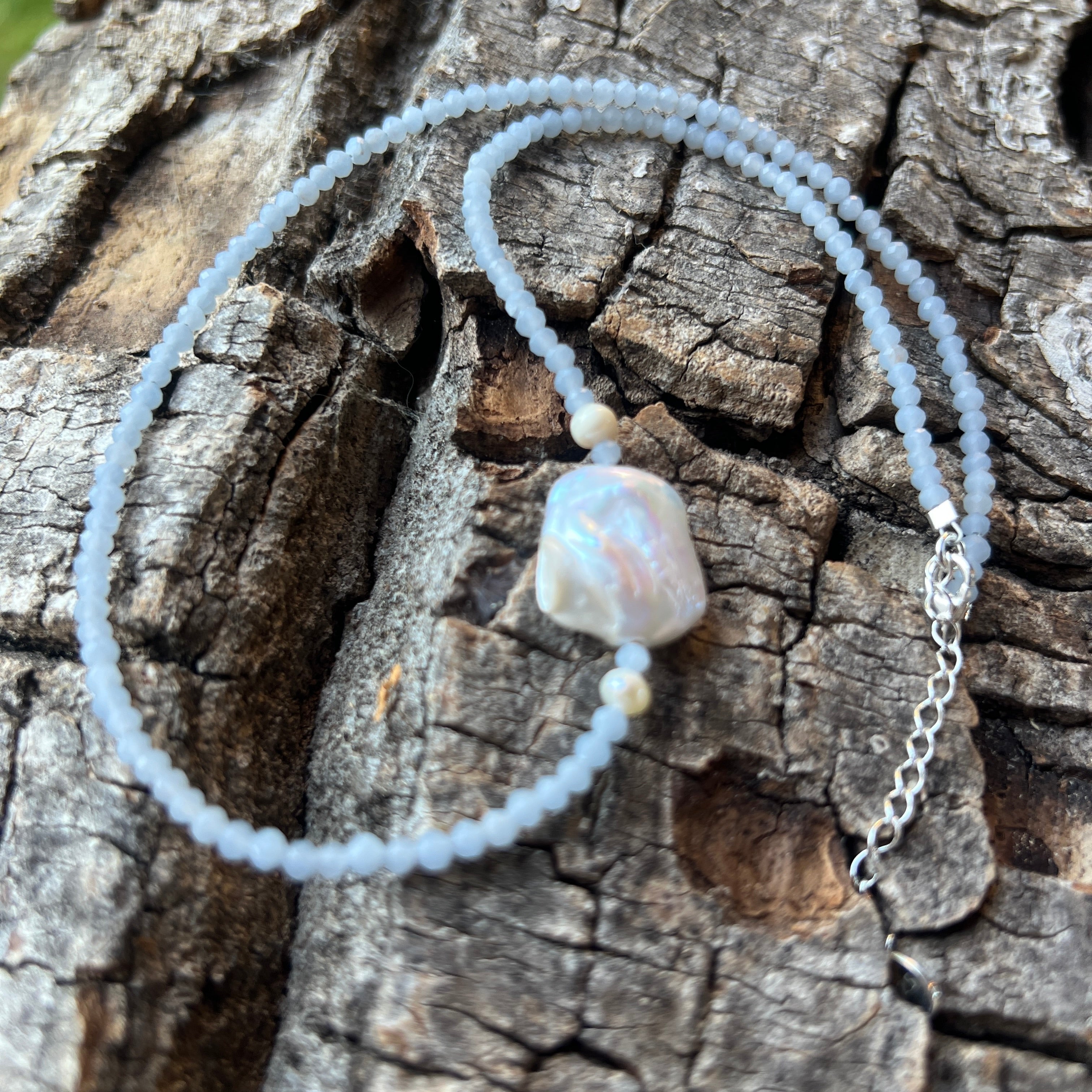 La angelita es conocida como la piedra de los ángeles: un cristal de paz interior, conexión espiritual y comunicación no verbal con el mundo sutil. Se dice que aporta protección suave, confianza y apertura hacia dimensiones superiores del ser. Las perlas amplifican esta energía con su pureza silenciosa, evocando la belleza discreta y la sabiduría emocional.