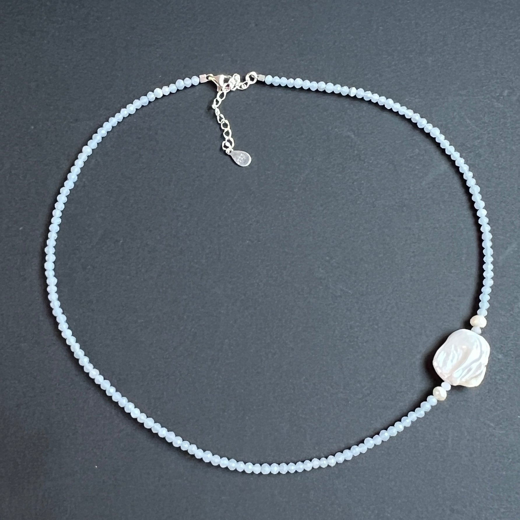 En la parte inferior del collar, un detalle sutil atrae la mirada: una perla natural rectangular de aproximadamente 1,5 cm, acompañada de dos perlas redondas de 4 mm. Este acento orgánico y asimétrico le da a la joya un aire de gracia y feminidad, como si un rayo de luna se hubiera detenido por un instante sobre la superficie de un agua tranquila.