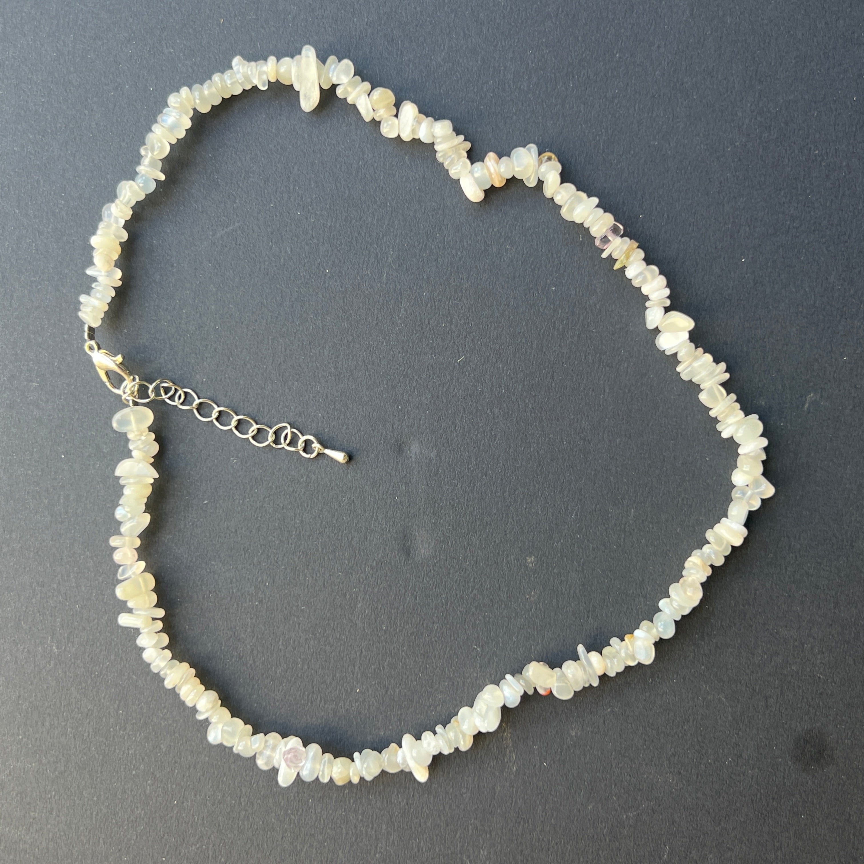 Añade un toque de magia y elegancia a tus conjuntos con este collar hecho de chips naturales de piedra de luna, montados en una delicada cadena de 40 cm, con extensión metálica de 5 cm para un ajuste perfecto.